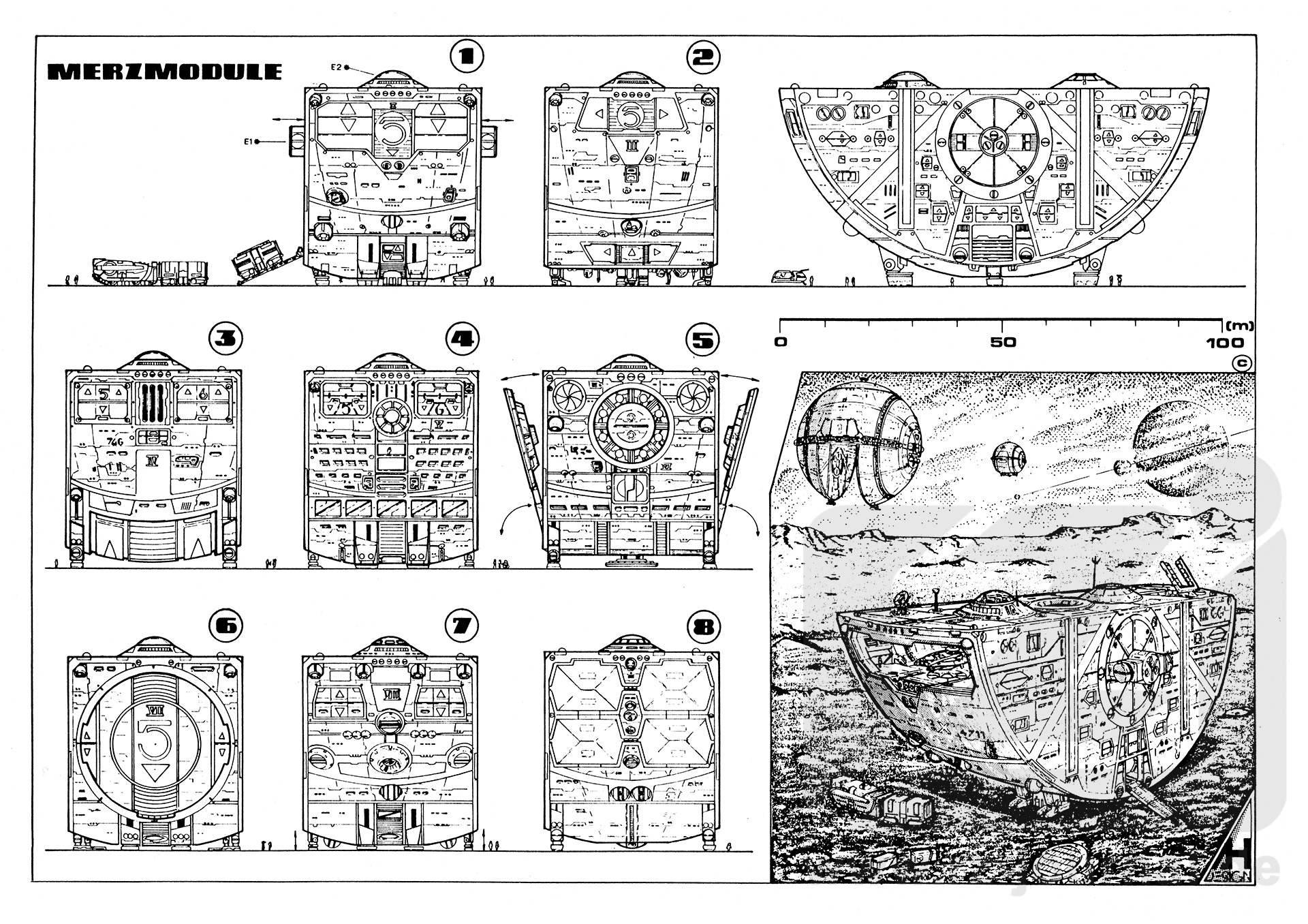 Merz-Module Im ersten Teil der Datenblattserie wurde über die Entwicklungsgeschichte der Merz-Raumer, sowie über die besonderen Merkmale des 100 Meter Mehrzweckkugelraumers VESTA berichtet: Der zweite Teil befasst sich mit den peripheren Spezialeinsätzen. Merzmodule sind Bausteine, die für eine bestimmte Aufgabe oder Aufgabengruppe speziell ausgerüstet sind. Durch die Kombination der Module mit der Merzkugel entsteht ein für die jeweilige individuelle Aufgabe ausgestatteter Raumer. Diese Module wandeln einen Allzweckraumer in eine Spezialeinheit um. Durch die Konstruktion vieler verschiedenartiger Module eröffnet sich ein großer Einsatzhorizont. Auch werden aus der Kombination von Raumschiff und Modul hohe Kosten gespart, die bei einem Bau eines Spezialraumers wie einem Frachter oder eines Kampfschiffes entstehen. Merz-Module zeichnen sich als autarke Einheiten aus, denn sie verfügen über eine eigene Energieversorgung, eine Leitzentrale und unterschiedliche Antriebssysteme. Die meisten der auf dem Datenblatt abgebildeten Merz-Module sind mit einem Metagrav-Triebwerk (siehe E1) ausgestattet. Im ausgekoppelten Zustand sind die beiden Metagrav-Triebwerksgondeln ausfahrbar. Der Überlichtfaktor der Metagrav-Antriebe beträgt 25 Millionen. Das Modul hat eine Länge von 97 m und eine Höhe von 49m. Fünffach gestaffelte Paratronfelder schirmen das Modul von störenden Einflüssen ab. Die Zeichnung zeigt acht unterschiedliche Merz-Module in der Vorderansicht