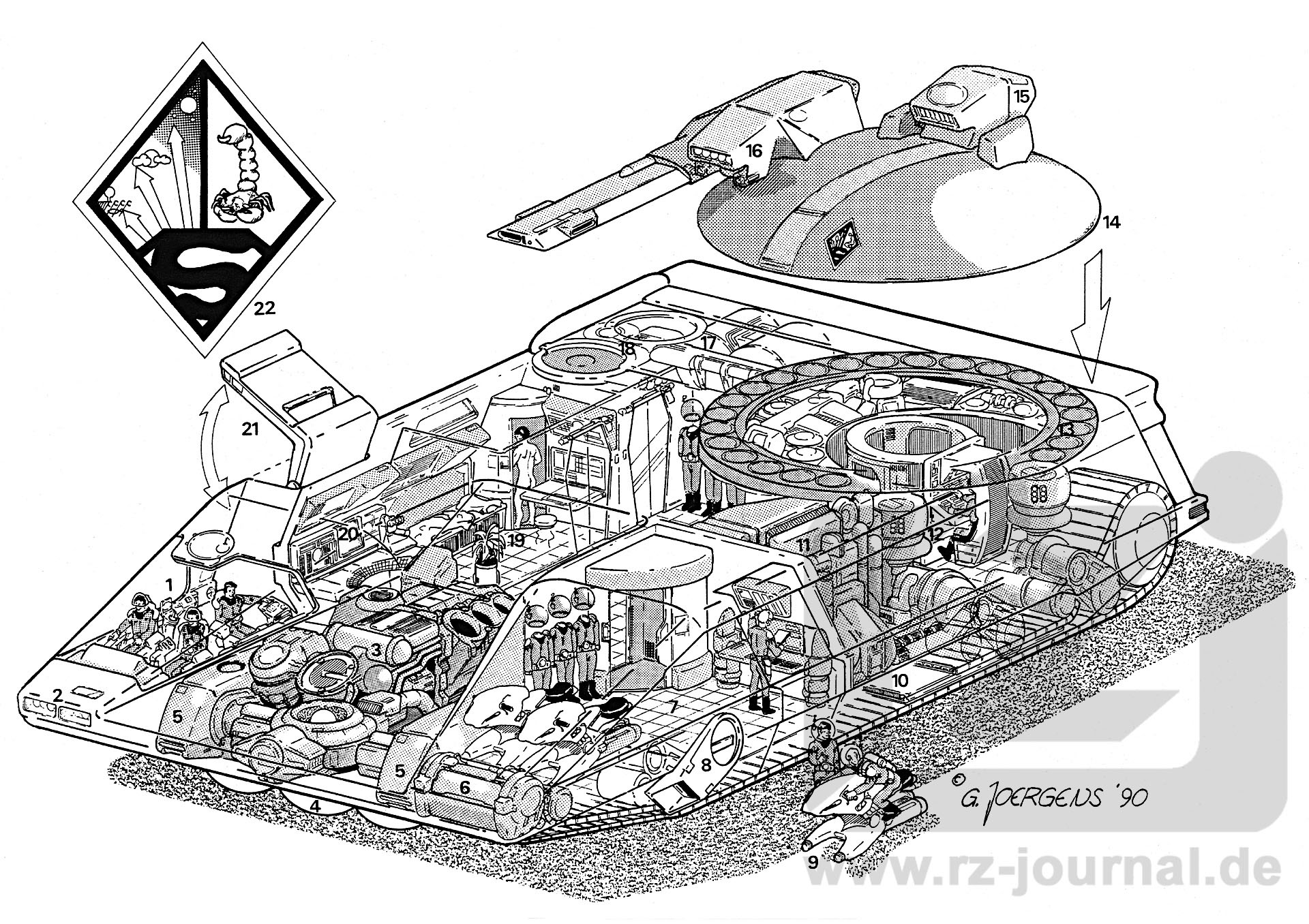 Allgemeines: Neben der Space-Jet gehört der Shift zur Standardausrüstung eines jeden terranischen Raumschiffs. Ähnlich wie die Space-Jet wurde auch der Shift in den Jahren immer stärker modifiziert, und die unterschiedlichsten Typen für spezielle Aufgaben gebaut. Ein Shift, der in fast jedem Raumschiff neben dem „SAMURAI“-Shift anzutreffen ist, ist der Scoutshift SCORPIO. Basierend auf der Tsunami-Konfiguration wurden die Shift-Konzepte angeglichen, so daß die Ersatzteile kompatibler wurden, was zu einer enormen Platzersparnis in den Schiffsmagazinen führte. Der Scoutshift vom Typ SCORPIO ist in seiner Bauweise und den Außenkonturen fast identisch mit denen des SAMURAl-Shifts. Auch Länge und gängiges Equipment sind gleich, jedoch ist er wesentlich flacher und breiter. Der Scoutshift wird gerne als Vorauskommando abgesetzt und ist somit von seinem Konzept her, für längere Aufenthalte innerhalb des Shift besser ausgerüstet als andere Modelle. Er verfügt über zwei geräumige 4-Bett-Kabinen sowie einen kleinen Besprechungsraum. Auch verfügt der SCORPIO über eine austauschbare Turmanlage, welche nach Bedarf mit Explorer-, Waffen- oder sonstigem Gerät bestückt werden kann. Für kurze Erkundungen besitzt der SCORPIO drei Air-Bikes oder einen Geländecruiser. Der Scoutshift SCORPIO ist durchaus in der Lage mit hochge- schalteten Gravopuls-Triebwerken vom Raum aus in die Atmosphäre einzutauchen und so die Planetenobertläche ohne fremde Hilfe zu erreichen. Dort kann er sich dann Mittels eines Prallfeldes oder des Außenstrom-Gravojet-Antriebs so wie den Kettenlaufwerken fort bewegen. Für einen Rückstart wird der Außenstrom-Gravojetantrieb dem Gravopuis-Antrieb zugeschaltet, damit die hohe Gravitation überwunden werden kann. Die Kettenlaufwerke, die bei den anderen Shift-Typen sehr viel Platz wegnehmen und daher in der neuesten SHOGUN-Version ganz fehlen, wurden bei dem SCORPIO auf Gravoschwebebasis flach übereinander geführt, wobei dia Gravoleitfeldplatten einzeln hochbeweglich gelagert sind, so daß die Flexibilität einer Radlaufkette gewahrt bleibt.