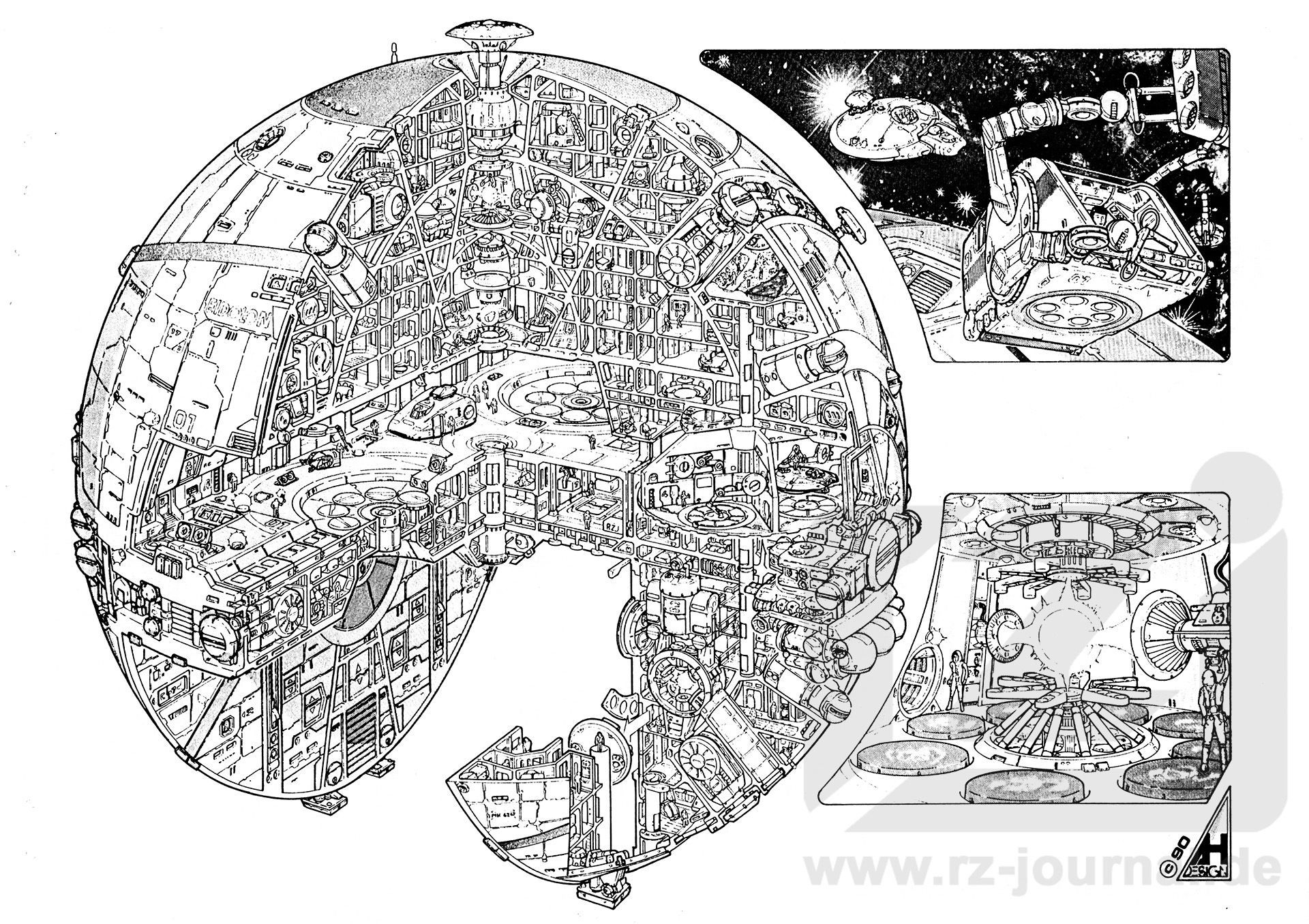 Allgemeines: Am 13. Oktober 1169. NGZ brachen Perry Rhodan und neun seiner Freunde zu einem Flug nach Wanderer auf. Von ES ging der Befehl aus, dass Perry Rhodan und seine Gefährten ihre Zellaktivatoren vor Ablauf der ursprünglichen Frist abzugeben hatten. Für den Flug zum Kunstplaneten wählte Perry Rhodan die EIDOLON, einen 100-Meter-Kreuzer der VESTA-Klasse aus. Raumkreuzer der VESTA-Klasse sind Mehrzweckeinheiten, auch kurz MERZ-Raumer genannt, die für die Erledigung eines grossen Einsatzspektrums konzipiert sind. Diese Allzweckraumer lassen sich mit Hilfe unterschiedlicher Merz-Module in eine Spezialeinheit umwandeln. Die Merz-Module werden in der knapp unter dem äquatorialen Aggregateband befindlichen Merz-Bucht verankert (siehe auch PRR 188/189). Diese Entwicklung bewirkte, dass sich die terranische Flottenstruktur innerhalb der 100-Meter-Klasse auf die Modellpalette des VESTA-Merzkreuzers mit mehr als 85 Prozent umstellte. Der 100 Meter durchmessende Merz-Kreuzer wird von einer Standardbesatzung von 87 Mann geführt, die zusätzlich mit rund 100 Spezialisten, Soldaten und Beibootbesatzungen ergänzt werden kann. Als Beiboote für die Besatzung werden 8 Kleinst-Space-Jets und zwei Shifts mitgeführt. Zusätzlich können im Roll ON/Roll OFF-Hangar noch zwei 30-Meter-SpaceJets aufgenommen werden. Für den Flug im superphotischen Bereich sorgen 6 METAGRAV-Triebwerke, welche eine Spitzengeschwindigkeit von 75 Millionen erreichen. Eine gleiche Anzahl von METAGRAV-Antrieben, weiche entgegengesetzt der Hauptflugrichtung des Raumschiffs installiert sind, werden für Brems und Steuermanöver eingesetzt. Durch diese Triebwerksanordnung wird ein hoher Beweglichkeitsgrad erreicht. Der Überlichtfaktor der METAGRAV-Triebwerke beträgt 75 Millionen und die maximale Beschleunigung liegt über 930 km/s2. Impuls und Antigravtriebwerke unterstützen die Metagrav-Triebwerke bei Start und Landung des Kreuzers. Der Kreuzer schwebt nach der Landung auf einem Prallfeld. Lediglich über die vier beweglichen Landestützen, deren ursprüngliche Aufgabe die Fixierung der Merzmodule ist, stellen den Bodenkontakt dar. 18 Transformkanonen und 22 Desintegratoren steilen die Haupt-Offensivbewaffnung dar fünffach gestaffelte Paratron- und HU-Schirme und Absorberfelder schützen die Kugel vor externen Einflüssen. Zusätzlich gehört ein VIRTUELL-IMAGER Ortungsschutzsystem mit zur Ausrüstung, weiches in der Lage ist, eine Energieblase eines beliebigen Räumers einschliesslich deren Funk- und Triebwerksemissionen an sine beliebige Stelle im Weltraum zu projizieren. |