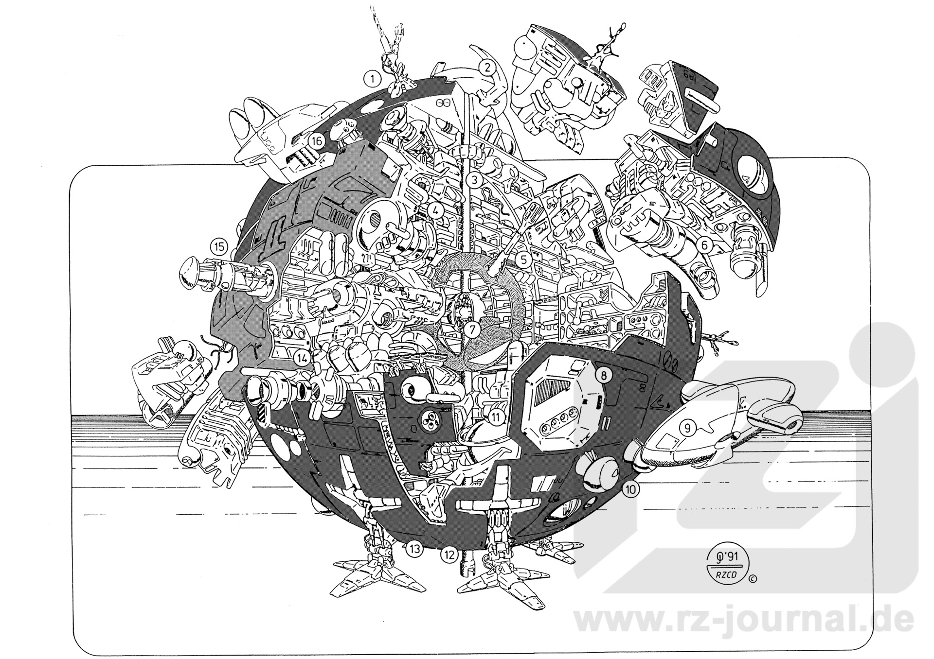 Allgemeines: Als Gesil im Februar 1170 NGZ mit Ihrer angeschlagenen TABATINGA auf dem Planeten Gropnor landen muss, um diese zu reparieren, taucht unvermittelt ein Raumschiff auf, dessen Eigentümer sich als Ingenieur Nanark ausgibt. Er behauptet, den Havarie-Notruf der TABATINGA empfangen zu haben und mit seinem außergewöhnlichen Werkstattschiff den Havaristen zu Hilfe kommen zu können. Laut seiner Aussage verdiene sich Nanark seinen Lebensunterhalt mit der Reparatur von gestrandeten und im Raum festliegenden Schiffen. Nanark selbst behauptet auf eine Frage Gesils hin, er sei ein entfernter Nachkomme der Paddler, die vor etwa tausend Jahren bei der Erkundung einer sogenannten Zeitfestung verschollen seien. Gesil glaubt ihm, und Nanark setzt sein Werkstattschiff zur Reparatur an der beschädigten TABATINGA ein. Später stellt sich heraus, dass es sich bei Nanark um den gefährlichen ASSU LETEL handelt, der sich bereits in der Vergangenheit Gesils bemächtigt hatte, und sie diesmal töten will. Das bestens ausgerüstete Schiff Ist in der Lage, sich bis auf eine Zentralkugel in seine Einzelsegmente zu zerlegen, von denen jedes eine voll syntrongesteuerte Reparatureinheit darstellt, die selbständig agieren kann. Die Reparatureinheiten bestehen zudem aus Tausenden kleiner und kleinster Bauteile, die je nach Bedarf zu allen erforderlichen Ersatzteilkonstruktionen zusammengefügt werden können. Unser Bild zeigt nur die grobe Struktur während der anfänglichen Zerlegung... Durchmesser. 180 m Durchmesser Zentralkugel außen: 45 m Durchmesser Zentralkugel innen: 15m Bewaffnung offensiv: keine Bewaffnung defensiv: vierfach gestaffelter Paratronschirm unbekannter Bauart |
