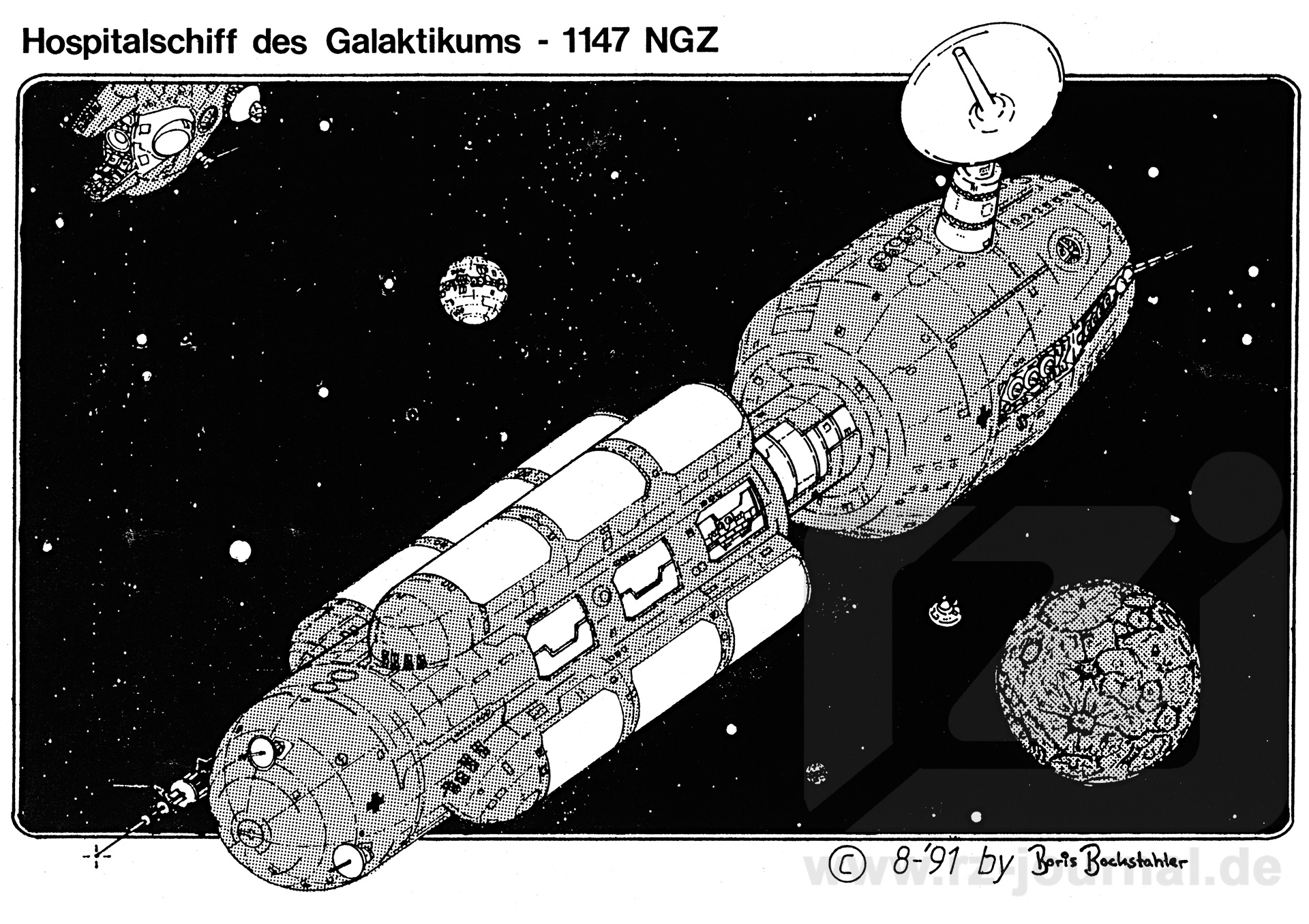 ALLGEMEINES: Das Jahr 1147 NGZ könnte man als das Jahr 0 nach Monos bezeichnen, und dementsprechend war die Lage in der Galaxis: Hunderte von durch Zivilisationsrückfall verwüsteten Planeten, die einst galaktische Hochkulturen beherbergten, elendige Notstände, unter denen Billionen Wesen der Milchstraße zu leiden hatten. Als eine der ersten Sofortmaßnahmen ging es natürlich darum, den rein medizinischen Notstand in den Griff zu bekommen. Hierfür war es notwendig, zunächst ein grobes Netz von Versorgungsstationen zu errichten, das die schlimmsten Auswirkungen der Cantaro-Herrschaft in Form längst vergessener Massenkrankheiten durch gezielte Medikamentenvergabe angreifen konnte. Da nun der Bau einer planetar leistungsfähigen Krankenstation entsprechende Vorbereitungen (Personalschulung, Infrastruktur etc.) verlangte, erschien es zunächst sinnvoller, großräumig zentral gelegene Operationsanlagen In Form von Hospitalschiffen zu bauen. Diese sollten parallel zu den Versorgerstationen Im Weltraum ein Netz aufbauen, so dass wenigstens schlimme, komplizierte oder seltene Krankheiten In einer entsprechenden Umgebung behandelt werden konnten. So wurde NATHAN. als einzige halbwegs arbeitsfähige Großbaustelle, mit dem Bau von 47 der hier abgebildeten Hospitalschiffe beauftragt. Planung. Bau, Besetzung und Qualitätsprüfung eines Schiffes dauerte ca. 3 Monate, so daß die ersten 10 Schiffe, besetzt mit jeweils 1500 Galaktikern. davon 1200 medizinisches Personal, bis zum Jahreswechsel 47/48 einsatzbereit waren. Jedes Schiff Ist mit 12 Korvetten, 24 Space-Jets und diversen Spezialgleitern bestückt, wobei jedes der 36 Zubringerboote über eigene OP-Räume der Spitzentechnik verfügt, um weitgehendst alleine operieren zu können. Nur die kompliziertesten Fälle. die evtl. langwierige Behandlung erfordern. sollten auf dem Hospitalschiff behandelt werden. Da schnelle Kommunikation mit gleichzeitig absoluter Übertragungssicherheit zwischen Mutterschiff und Zubringerboot unbedingt gewährleistet sein musste, wurde jedes der Schiffe mit einer besonders starken und ausgebauten Hyperfunkanlage (auf dem Heck erkennbar) versehen, die eine Reichweite bis zu 50000 LJ besaß. Unterstützt wurden die Hospitalschiffe von den wenigen der älteren Baureihe aus der Vor-Cantaro-Zeit (vgl. Hospitalschiff 427 NGZ von Günter Puschmann), die die Kriegswirren überstanden. Gegen Ende des 12. Jahrhunderts NGZ wurden dann die Schiffe nach und nach wieder zurückbeordert, da die Planeten des Galaktikums zunehmend selbstversorgender wurden. Bn Stamm von 19 Schiffen, verstreut über die ganze Galaxis, erhält auch weiterhin das Notfallnetz, während die anderen Schiffe verkauft bzw. »eingemottet« wurden. Das Bild zeigt die PHOBULOS (berühmter arkonidischer Mediker des frühen 2. Jahrhunderts NGZ) im Orbit um Faugaul-3, einer Well im Zentrum von M 33, mit je zwei Zubringern des Space-Jet- bzw. des Korvetten-Typs. Das Schiff steht damit Im »medizinischen Mittelpunkt« (gemessen am Bedarf der ca. 340 Völker) des Sternhaufens. Es ist - wie alle seines Typs - ca. 850 m lang. Die Bugsektion beherbergt, neben den deutlich erkennbaren Hangarsektionen, die Schiffsführung und den medizinischen Komplex. Lagerhallen mit Containeranlagen für die medizinischen Bedarfsgüter befinden sich im leicht zugänglichen Mittelstück, während alle technischen Anlagen des Schiffes im Heck untergebracht sind. Der Raumer durchmisst hinten etwa 240 Meter, vom etwa 180 Meter plus zweimal 60 Meter der Hangarhallen.