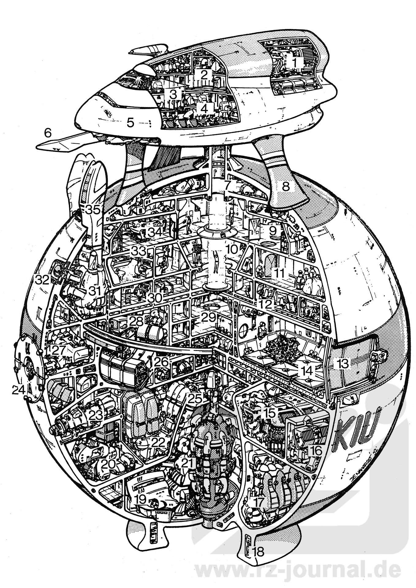 ALLGEMEINES: Der aus einer ausgedienten Schiffszelle umgebaute Transporter »KIU« wird für die Beförderung von »Gefahrgut« eingesetzt. Die drei Frachträume sind im Äquatorbereich befindlich. Ausgestattet sind sie mit großen Dimensionsfeldschirmen, Fesselfeldprojektoren und weiteren Sicherungsanlagen. In unserem Bild erkennbar bei Punkt 14 ist ein bis jetzt noch nicht erforschtes Phänomen, das bei Raumbeben auftritt. Dort entstehen halbstoffliche Materieklumpen unterschiedlicher Größe, die starke Strahlung im parametrischen Bereich aussenden. Dieser Klumpen wird nun zu einer Forschungsstation zur näheren Untersuchung transportiert. Der Zellendurchmesser der Kugel beträgt 43 Meter. Zur Steuerung des Schiffes ist im Polbereich ein 30 Meter langes Mehrzweckschiff der MIRA-Klasse angekoppelt. Oftmals werden Beladungsaktionen des Hauptschiffes ferngesteuert über die Bühne gebracht, wenn zuviel Gefahr für Leib und Leben der Besatzung besteht.