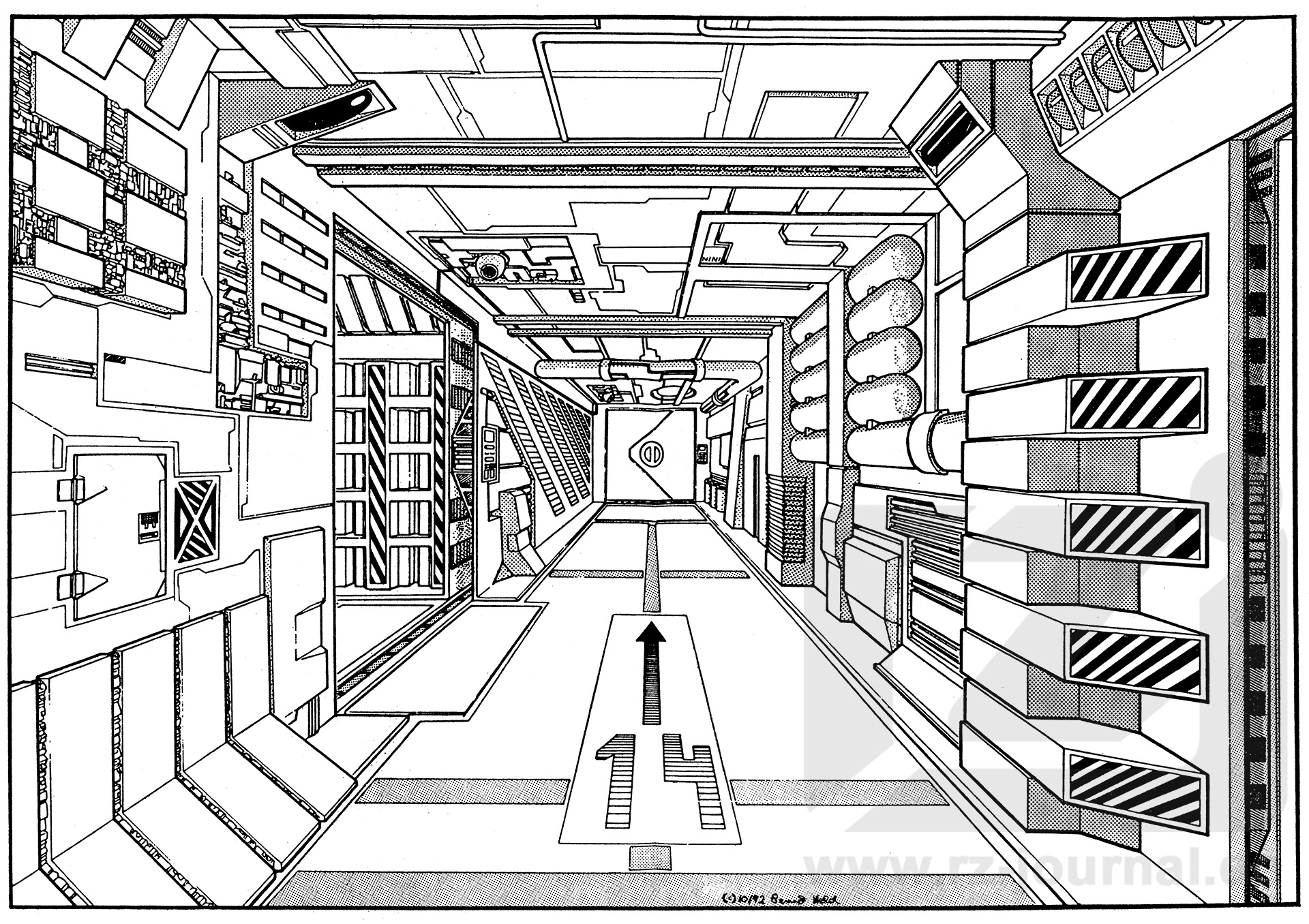 ALLGEMEINES: In Raumschiffen, egal von welchem Sternenvolk, gibt es eine Menge an Korridoren und Gängen. Je nach Schiffssektion haben diese ein ganz unterschiedliches Aussehen. Im Bereich der Kommandobrücke und den Wohn- und Erholungsbereichen sind sie meist mit glatten Wänden und Transportbändern ausgestattet. Viele Völker kennzeichnen ihre Schiffskorridore durch verschiedene Farbgebung, um die Zugehörigkeit zu den einzelnen Sektionen deutlich zu machen. Gänge und Korridore im Maschinenbereich der Raumschiffe sind nicht so glatt und farbenfroh ausgestattet. Eine Unzahl von Leitungen, Aggregatebändern, Schalttafeln und Anschlussverbindungen sind von Maschinenanlagen in den dahinterliegenden Räumen nach außen in den Gang geführt, um Wartungs- und Reparaturarbeiten zu erleichtern. Maschinenkorridore sind in regelmäßigen Abständen und an Kreuzungs- bzw. Abzweigungspunkten durch drucksichere Schotte unterteilt. So wird verhindert, dass sich z.B. eine Explosionswelle in einem Segment ungehindert über weite Teile des Ganges ausbreiten kann. Der entstandene Schaden beschränkt sich auf ein relativ kleines Gebiet. Auch ein plötzlicher Druckverlust durch einen Schaden an der Schiffshülle kann so schnell eingedämmt werden. Sämtliche Sektionen unterliegen einer ständigen Syntronkontrolle - die Schotte können somit in Sekundenbruchteilen abgeriegelt werden. Das Wartungspersonal muss eine Dreifachkontrolle über sich ergehen lassen, wenn ein anderes Segment betreten werden soll. Vor jedem Schott befindet sich eine Sensorplatte, die Körpergewicht, Fußstellung und körpereigene Gewichtsverlagerungen an den Füßen registriert. An der Decke untersucht ein Scanner Aussehen, Körpergröße und -form sowie Skelett und führt eine DNS-Analyse durch. Zusätzlich muss sich der Betreffende durch eine ID-Karte und Stimmprobe ausweisen. Diese an Hochsicherheitstrakte erinnernde Prozedur wird innerhalb weniger Millisekunden durchgeführt. Allerdings sind derartige Kontrollen nur an der Grenze zu bestimmten Bereichen nötig. Zugänge zu wichtigen Antriebs-, Kommunikations-, Syntron- und Lebenserhaltungsanlagen sind hiermit gesichert Trennschotte in Gängen und Zugänge zu allgemeinen Maschinenanlagen reagieren auf einen weniger komplizierten Scanner und einfache Sensorplatten.
