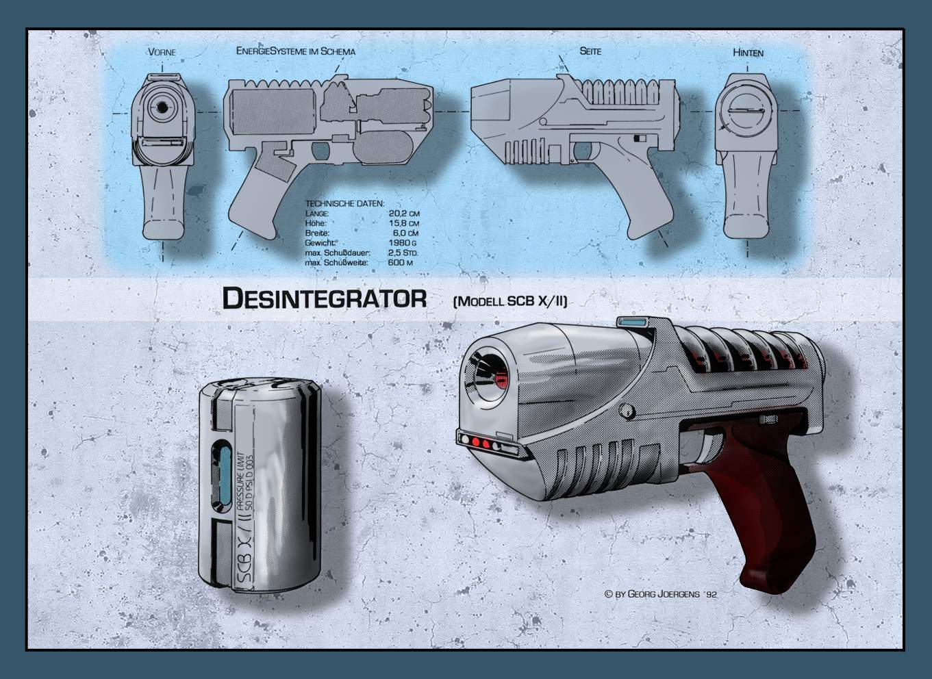 TECHNISCHE DATEN: Desintegrator - Modell SCB X / II - (Single - Combat - Blaster X. Version der IIer-Serie) Maße: 20,2 x 15,8 x 6 cm Gewicht: 1980 g max. Schußdauer: 2,5 Stunden mit 1 Energiemodul max. Schußweite: 600 m, abhängig von den Energiewerten des Energiemoduls