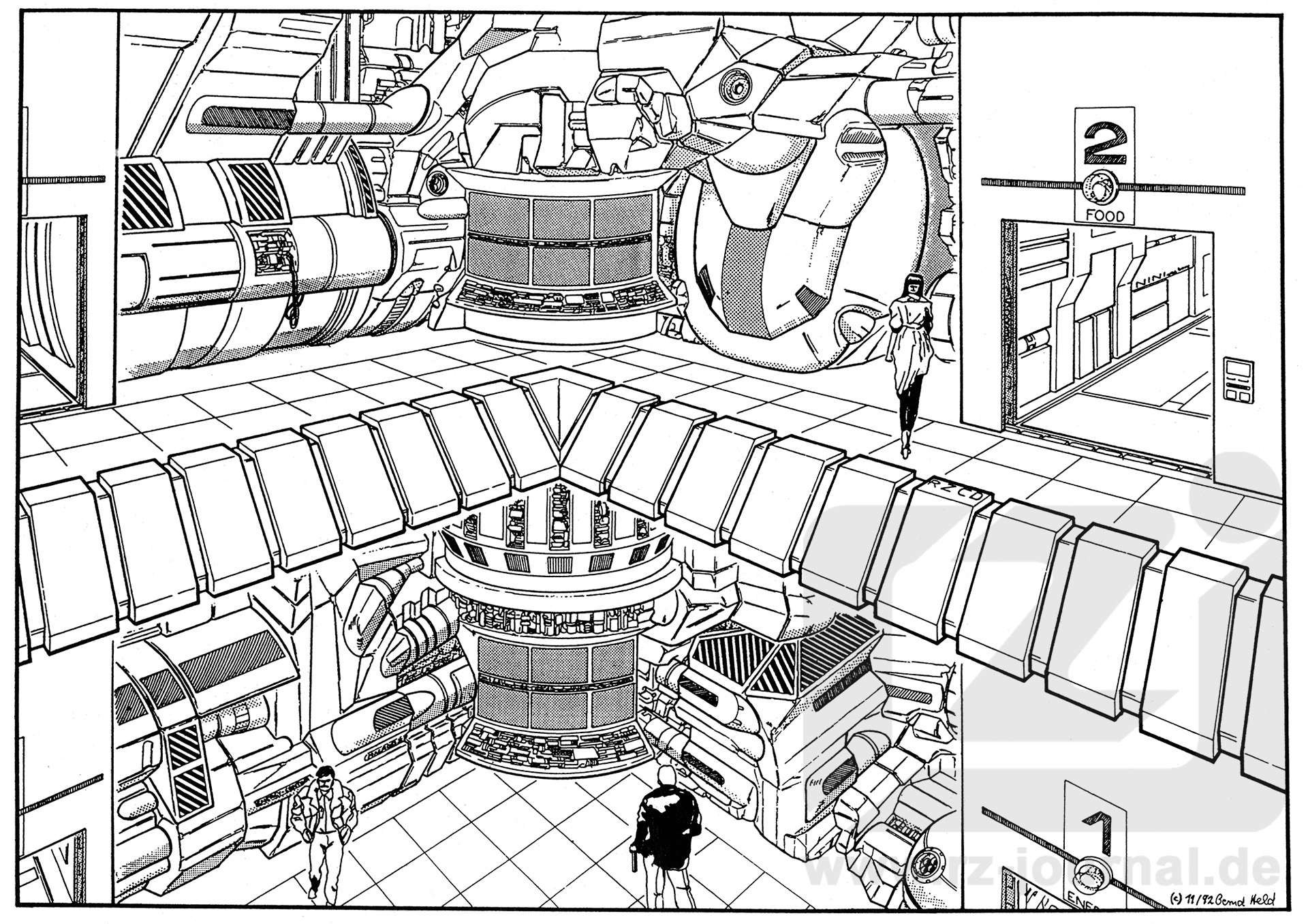 ALLGEMEINES: Neben der wichtigen Aufbereitung und Bereitstellung der Atmosphäre auf Raumschiffen haben die Lebenserhaltungssysteme einen weiteren Bereich. Sie sind auch für die Aufbereitung von Nahrungsmitteln und der Betriebsenergie für alte peripheren Verbraucheranlagen zuständig. Periphere Verbraucheranlagen sind z.B. die Raum- bzw. Korridorbeleuchtung. Die Mannschaftsunterkünfte und Freizeitenlagen sowie Laboratorien und Krankenstationen. Antriebe. Kommandobrücke, Ortungs- und Waffensysteme und alle weiteren wichtigen Elemente sind direkt am Hypertropzapfer angeschlossen und nicht auf Teile des Lebenserhaltungssystems angewiesen. Die Energieaufbereitung ist selbstverständlich ebenfalls mit dem Hypertropzapfer und den Gravitrafspeichern gekoppelt, um die benötigte Energie zu transformieren und umzuwandeln. Die so aufbereitete Energie wird in eigens dafür vorgesehene Speicherbänke gespeichert. Es wird automatisch darauf geachtet, dass die Speicherbänke immer gefüllt sind. Nicht verbrauchte Restenergie und Streustrahlung wird ebenfalls in die Speicherbänke zurückgerführt. Die Vermeidung von Streustrahlung ist unter anderem wichtig zum Schutz vor Ortung und der wechselseitigen Beeinflussung von 4D- und SD-Aggregaten. Durch die Rückführung kann unnötiges Isoliermaterial gespart werden, das Schiff wird leichter, billiger und die Anlagen kompakter und kleiner. Weiterhin dient dieser Bereich der Lebenserhaltungssysteme für die Klimatisierung des Schiffes. Wiederum können einzelne Bereiche des Schiffes unterschiedlich beheizt oder gekühlt werden. Neben der Atmosphärenaufbereitung ist der Bereich Nahrungsaufbereitung der größte Komplex innerhalb der Lebenserhaltungssysteme. Nahrungsmittel können hier individuell synthetisiert werden. Selbst außerterrestrische Lebensformen können angemessen versorgt werden. Die Synthese geschieht durch 5 D-unterstützte einfache chemische Reaktionen. Proteine. Eiweißstoffe, Mineralstoffe und Spurenelemente, Kohlenhydrate und Fettanteile werden hier in günstigster Zusammensetzung zu Nahrungsmitteln verarbeitet. Selbstverständlich werden auch entsprechende Aromastoffe und Geschmacksverstärker zugesetzt, um die ganze Sache auch schmackhaft zu machen. Das Aussehen der Nahrung kann genauso variiert werden wie der Geruch und die Farbe. Der Nährwert eines Menüs aus Geflügel und pflanzlichen Salaten ist genau eingestellt und ebenso wertvoll wie ein Menü aus Feldfrüchten und Obst. Die Zusammensetzung der Nahrung entspricht zwar nicht der Originalnahrung, beugt aber einer einseitigen oder fehlerhaften Ernährung vor. Die Bestandteile der Nahrung sind derart aufbereite! und modifiziert, dass der Körper die Inhaltsstoffe leicht verdauen kann und die Wirksamkeit im Körper maximiert wird. Die Rohstoffe für die Nahrungssynthese bezieht die Anlage aus Abfallstoffen aus dem technischen und menschlichen Bereich. Abfälle werden in ihre Bestandteile zerlegt und neu zusammengesetzt. Fehlende Inhaltsstoffe werden chemisch oder nukleartechnisch neu synthetisiert bzw. fusioniert.