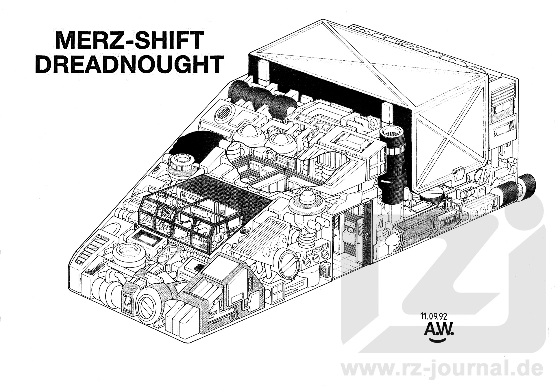 Allgemeines: Als bislang letzte Shift-Neuentwicklung wurde der Dreadnought entwickelt. Bei ihm wurde erstmals ein revolutionär neuer Antriebssystem verwirklicht. Da das reine Gleiterkonzept sich für den Shift nicht bewährte, da er den speziell für den freien Klug gebauten Gleitern und Jägern nicht Paroli bieten konnte, kehrte man wieder zum Vielzweckkonzept zurück. Um klobige Gleis- Ketten zu vermeiden, erhielt der Dreadnought einen gleiskettenartigen Antrieb auf der Basis rotierender Prall fei der, die ihn in Bodennähe die (theoretische, da Geländeabhängige) Höchstgeschwindigkeit von 400 km/h erreichen lassen. kür den Atmosphärenflug stehen zwei Gravojet-Außenstromtriebwerke bereit, für den Weltraumflug ein Mini-Metagravtriebwerk (ohne Grigoroff-Schichtprojektor). Die Gravojets lassen, sich entsprechend ihrer Mediumflexibilität auch als Unterwasserantrieb einsetzen. Einsatzzwecke können sein, der Einsatz als mobiles Forschungslabor, als mobile Energiestation, - wie alle Shifts - als Schützenpanzer, als Waffenträger, als Frachter oder als reiner Aufklärer. Für jede dieser Einsatzarten stehen mehrere verschiedene Merz-Container zur Verfügung, die eine Umrüstung binnen zehn Minuten erlauben. Von der Konzeption her hielten die Konstrukteure eine Bewaffnung des Grundkörpers für nicht erforderlich. Der Shift bietet Platz für einen Piloten und normalerweise vier, maximal 12, Fahrgäste. Die Konstruktion ist völlig freitragend, stützende Punktionen übernehmen die Aggregate selbst, Spanten und Verstrebungen gibt es im Dreadnought nicht mehr.