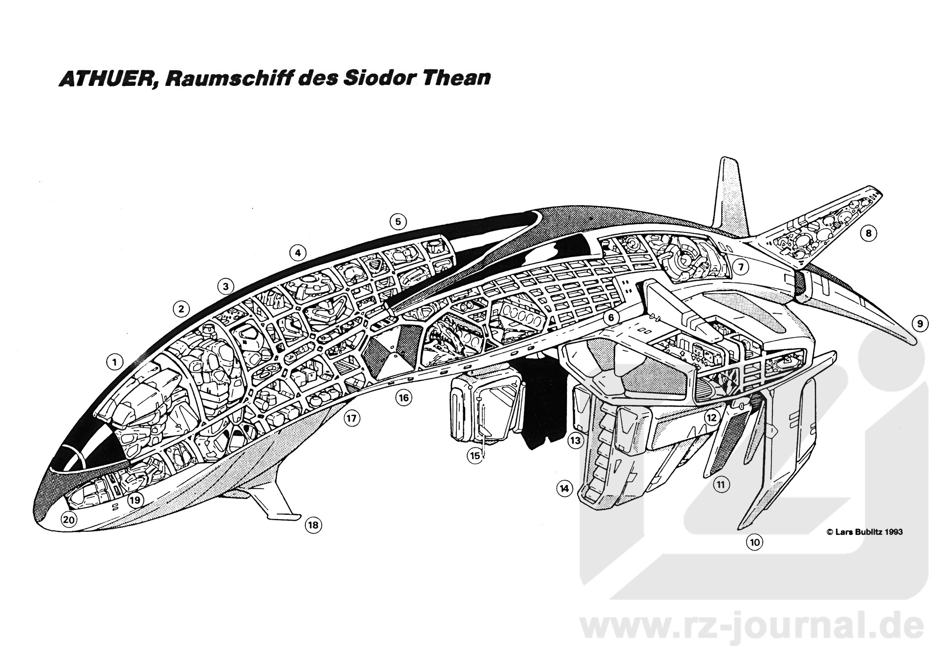 ALLGEMEINES: Die Raumschiffe dei Theans sind 280 Meter lang und durchschnittlich 40 Meter breit, wobei die größte Breite 90 Meter beträgt. Ausnahmslos sind sie'von gleicher Form und Größe. 120 echsenharte Gish und sechs Vatachh, deren Befehlshaber, bilden die Besatzung. Die ATHUER besitzt einen metagravähnlichen Überlichtantrieb - eine hochmoderne Konstruktion für die Verhältnisse an der Großen Leere. Überlichtfaktoren von 55 Millionen sind erreichbar. Defensiv- und Offensivsysteme fallen rund ein Drittel schwächer aus als bei Schiffen der Galaktiker. Die Kommandozentrale und die »Richtstätte« des Siodor Thean befinden sich in den Ausbauten an der Unterseite des Schiffes, während die Mannschaftsräume im länglichen Hauptkörper des Schiffes untergebracht sind. Die beiden nach oben ragenden Heckflossen beinhalten Ortungssysteme in hochkompakter Form, der Heckstachel eine Hyperzapfanlage. Allerdings ist die ATHUER gezwungen, wesentlich häufiger als die Schiffe der Galaktiker Energie »nachzutanken«. Maschinenräume und Antriebssysteme beanspruchen im Bug den meisten Platz. Dahinter gliedern sich Lager- und Vorratsräume an. Insgesamt existieren sechs Hangars (drei auf jeder Seite) für sechs einfach lichtschnelle Beiboote. |