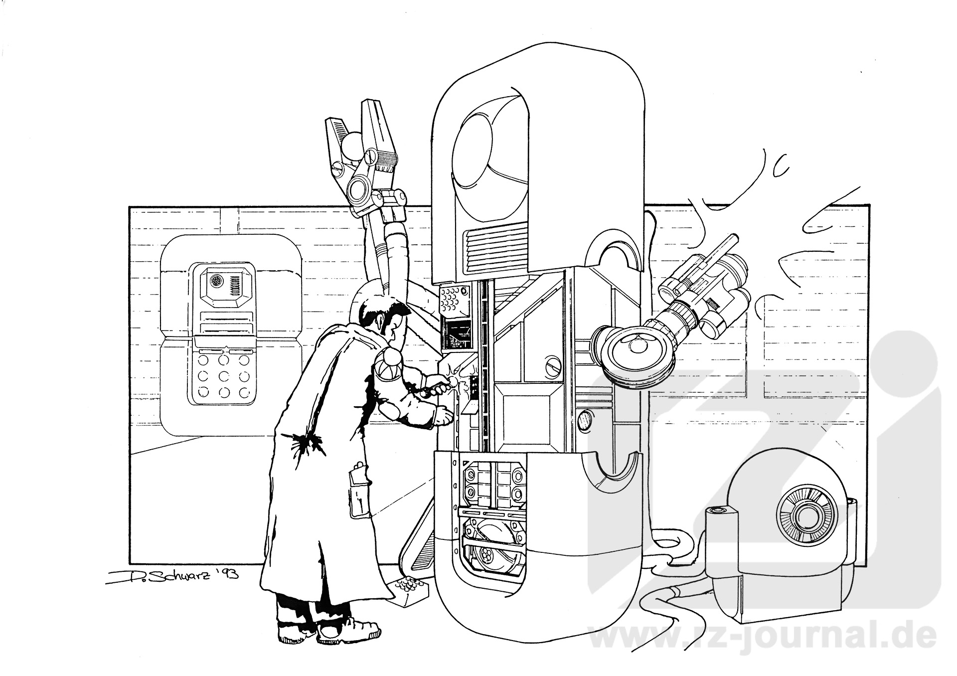 ALLGEMEINES: Die Reise zur Großen Leere ist eine der längsten Expeditionen, die die moderne Menschheit jemals unternommen hat. Heerscharen von Logistikern und anderen Spezialisten wurden damit beauftragt, ein Optimum an Bedingungen für dieses unvergleichbare Wagnis herzustellen. Da die Distanz zur Heimatgalaxis so beträchtlich ist, blieb es unausweichlich, auf dem Weg zur Großen Leere kleine „Heimathäfen" anzulegen. Im Falle eines überhasteten Rückfluges konnte man diese ansteuern, um Vorräte an Nahrung und Technik aufzufrischen. Darüber hinaus dienten die Häfen als Orientierungspunkte für eine eventuelle Nachschubflotte. Übrigens wuchs die Idee nicht auf terranischem „Mist", denn in grauer Vorzeit hatten die Maahks mit ihren Weltraumbahnhöfen zwischen Andromeda und der Milchstraße ebensolche Bollwerke erschaffen. Da man keiner menschlichen Besatzung zumuten konnte, sich in absolut fremdem Gebiet anzusiedeln und auf eine Flotte zu warten, die unter Umständen nie wieder erscheinen würde, entwickelte man eine robotische Stammbesatzung von vorerst 20 Einheiten. Diese Roboter wurden Androgynen genannt. Bis auf Ausnahmen gleicht kein Androgyne dem anderen. Sie alle sind ihrer Bestimmung entsprechend ausgerüstet. Man legte keinen Wert auf Design oder Menschenähnlichkeit. Allein die Funktionalität stand im Vordergrund. Die Aufgabe der Androgynen bestand darin, auf ausgesuchten Planeten oder im Weltraum Stationen zu bauen und für Menschen bewohnbar zu machen. Nächste Stufe: Durch den Bau einer Roboterfabrik, sind die Androgynen in der Lage, sich selbst zu reproduzieren bzw. zweckmäßige Veränderungen an ihren eigenen Körpern vorzunehmen. Die einfach umrissene Aufgabe birgt ungeheure Risiken für die Menschheit in sich. Nie war man in der Roboterentwicklung so nahe an ein künstliches Wesen gekommen, das in diesem Maße Entscheidungen treffen konnte. Durch sehr genaue Tests des Gruener-Algorithmus, der die Selbständigkeit der Androgynen erst ermöglichte, wurde eine Gefahr für die Menschheit von selten der Roboter nahezu ausgeschlossen. Eine andere Gefahr birgt die Ausrüstung der Roboter, die Fremdvölkern Aufschluss über den technischen Stand der Terraner hätte geben können. Aus diesem Grund muten einige Ausrüstungsteile der Androgynen nahezu archaisch an. Die hier dargestellten Androgynen stellen den Kernpunkt eines Weltraumstammes dar. Beide Modelle können die Schalenverkleidungen auseinanderfahren, um innere Aggregate zu entblößen. Einerseits ist dies eine wichtige Funktion, um den maximalen Wirkungsradius auszuüben, und andererseits die Voraussetzung für eine nachfolgende Vervollständigung des Androgynenkörpers in einer der Weltraumfabriken. Beide Androgynen sind der niedersten Kaste des Stammes zuzuteilen, den Drohnen. Sie sind für Verschweißungs- und Bearbeitungsvorgänge programmiert und ausgerüstet. Im Vordergrund sehen wir Robert Gruener (nach dem der Gruener-Algorithmus benannt wurde), wie er dem Androgynen A-2-19 den letzten Feinschliff für seine Aufgabe gibt. Text und Zeichnung: Daniel Schwarz Konzeptionelle Unterstützung: Gregor Sedlag Textvorlage aus dem RZJ 85 - Text bei Heftabdruck evtl. abweichend |