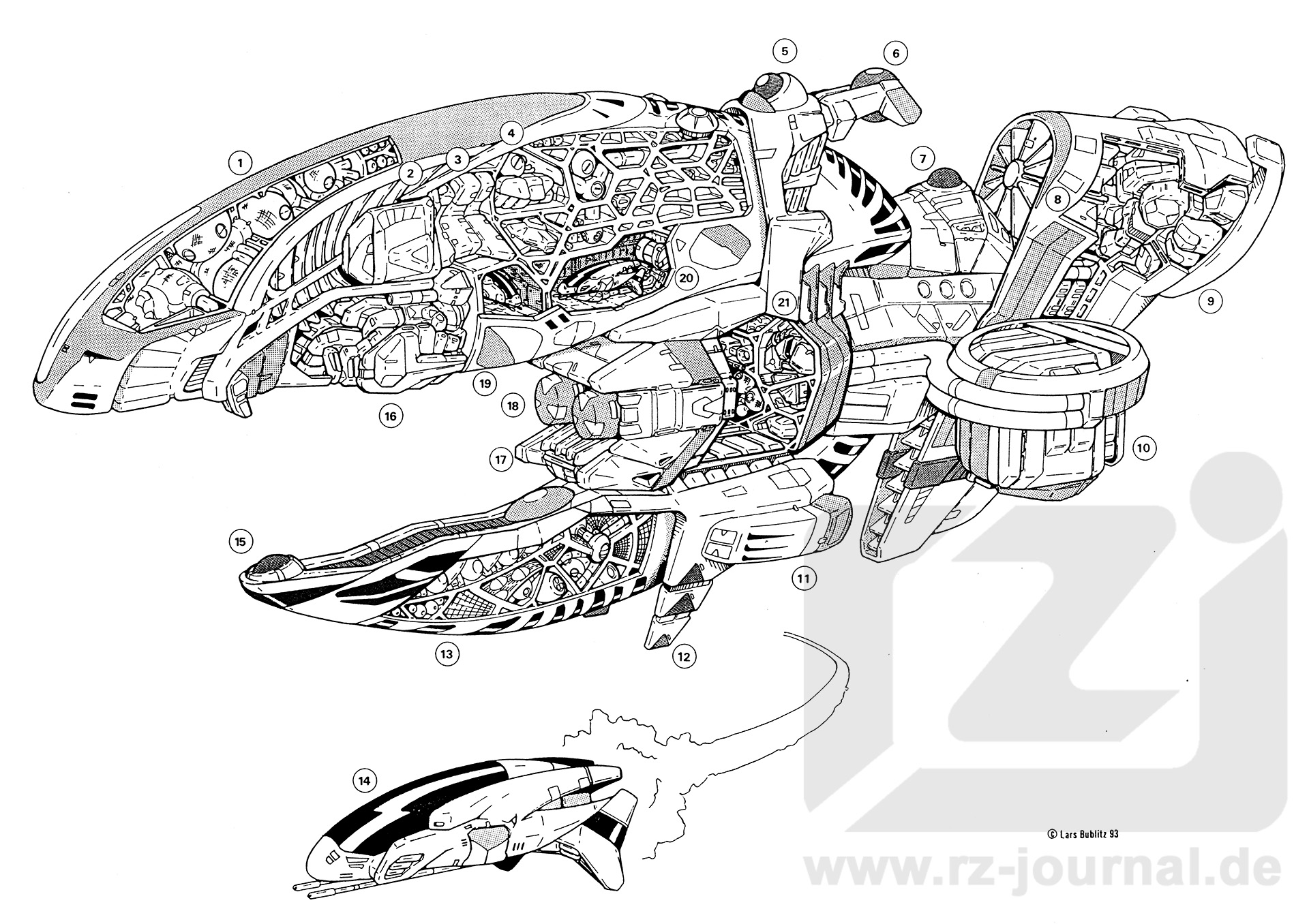 ALLGEMEINES: Die Arcoana haben ihren Ursprung in der Galaxis NGC 1400 (22 Millionen Lichtjahre von der Erde entfernt). Ihr Sternenimperium bestand bis zu dessen "Untergang" aus 73 Sonnensystemen. Nach der Flucht vor den Ennox tauchten die Arcoana in ihrer neuen Heimat unter. Die Arcoana bauten verschiedene Typen von Raumschiffen. Hier ist jedoch der gebräuchlichste Schiffstyp dargestellt. Die Ennox nennen diese Einheiten Drachenschiffe. Bei den Terranern setzte sich jedoch die Bezeichnung Barracudaschiff durch. Den Schiffstyp gibt es in Größen von 100 bis 800 Metern. Es ist ein Allzweckraumschiff, das für die unterschiedlichsten Aufgaben eingesetzt wird. Über Bewaffnung verfügen die Raumer der Arcoana nicht. Wenn sie ihre Technik einsetzen, dient das nur der Defensive. Das Maul des Drachenschiffes kann für verschiedene Zwecke genutzt werden: als offener Hangar für zusätzliche Beiboote, für den Lastentransport großer, sperriger Güter oder als Ort der Meditation und der Begegnung. Dazu werden in diesem Freiraum phantastische Netze aus Formenergie gesponnen. Die Körpergröße der Arcoana, die aufgerichtet drei Meter messen, erfordert natürlich auch größere Schächte und Räumlichkeiten. Für den Normalflug steht ein Gravoantrieb zur Verfügung. Im Hyperflug erreicht das Barracudaschiff einen Überlichtfaktor von mehr als 100 Millionen. Der Antrieb für den Hyperflug unterscheidet sich vom terranischen Metagrav gewaltig. Wie er jedoch genau arbeitet, ist den Terranern unbekannt. Auch sind keine geraden Decken- und Wandverläufe notwendig, da sich die Arcoana als Spinnenwesen ohne weiteres über Wände und Decken fortbewegen können. Das dargestellte Raumschiff trägt den Namen LAMCIA und wird von der Arcoana Colounshaba und ihrem Gefährten Pulandiopoul geführt. In der Darstellung befinden sich keinerlei Lasten im "Maul« des Barracudaschiffes, ebensowenig Meditationsnetze. |