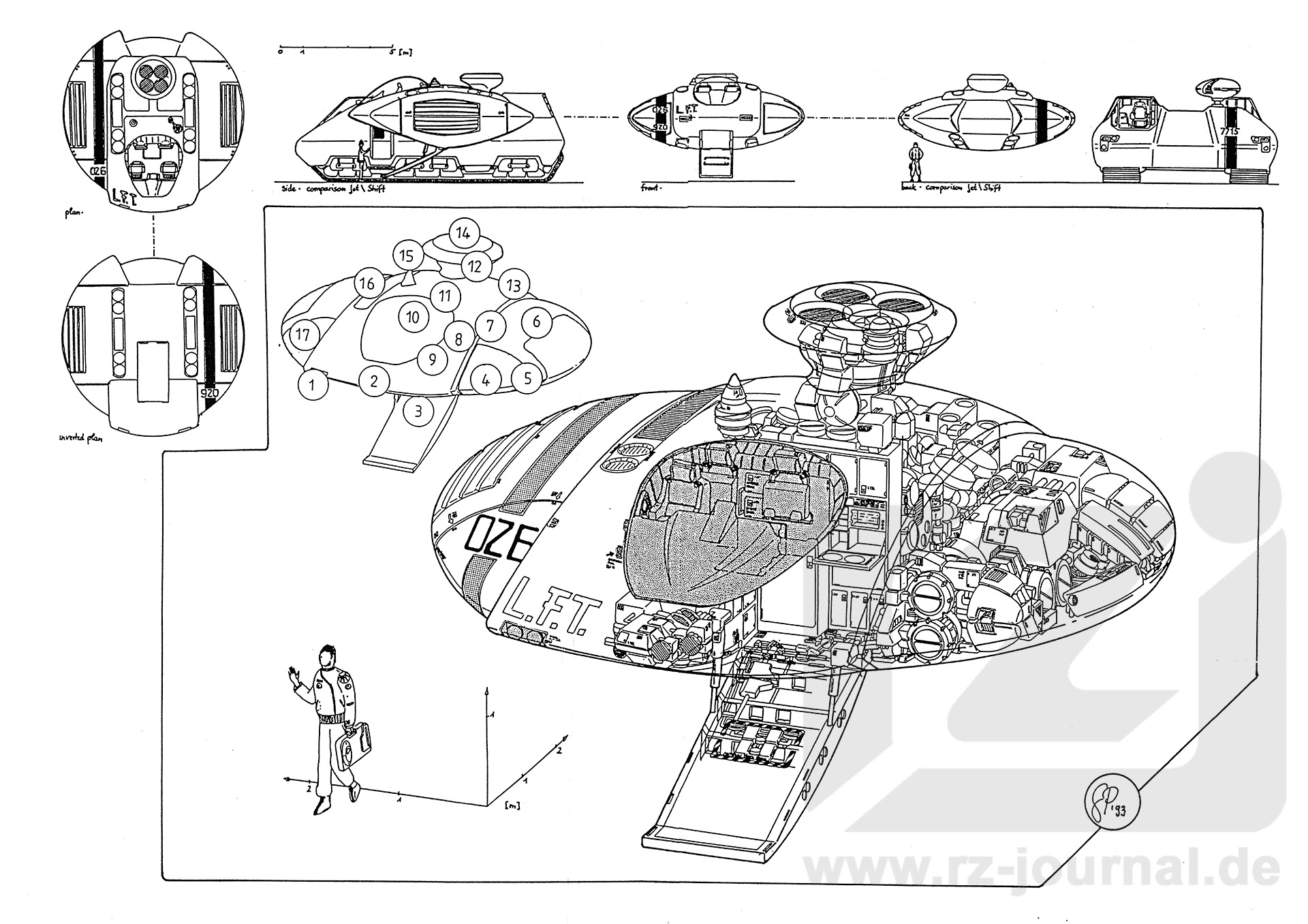 Technische Daten: Abmessungen: Durchmesser: 8,20 Meter außen: Höhe: 3,40 Meter: Masse: 52 Tonnen, leer, Besatzung: zwei. maximal sechs Personen; Antrieb: Metagrav mit 1160 km/s2 Beschleunigung; Überlichtfaktor: 34 Millionen: Gravojet-Triebwerk in Außenstrombauweise: Reichweite: 1450 Lichtjahre mit einem Wartungsintervall; Bewaffnung: Dreifach-Staffelschirm (HÜ/Paratron). Virtuellbildner. |