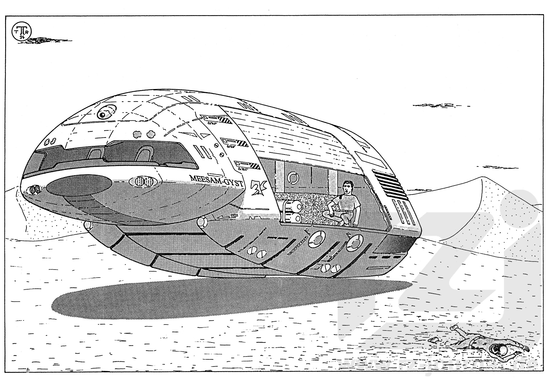 ALLGEMEINES: Selbst im Jahr 1217 NGZ leben Fängst nicht alle Menschen in den großen Metropolen Terras. Vielen scheint das Getümmel in den Großstädten zu lästig; bei Bedarf erreicht man ohnehin innerhalb kürzester Zeit mit einem öffentlichen Transmitter den Ort seiner Wahl. Es gibt allerdings noch eine ganze Reihe entlegener Dörfer, die recht wenig mit der Außenwelt zu tun haben. Da solche Orte meist nicht über größere Einnahmequellen verfügen, wird bei teuren Anschaffungen stark auf den Preis geachtet. So lassen es die zur Verfügung stehenden Gelder oft nicht zu, für jeden Einsatzzweck ein spezielles Fahrzeug zu ordern. Aus diesem Grund wurde von der Firma TerraTrans ein Mehrzweckgleiter entworfen, der eine Reihe von Einsatzgebieten zugleich abdeckt. Der Gleiter ist dafür ausgelegt. Polizei- und Rettungsflüge. Patrouillendienste, Transporte oder einfache Versorgungsaufträge durchzuführen, Nur in seltenen Fällen sind Umrüstarbeiten notwendig, was ihs besonders für die genannten Zwecke prädestiniert. Der abgebildete Gleiter stammt aus der in der Sahara gelegenen Siedlung Meesam-Gysi und wird von der Polizistin Duana agh Intells mit ihrem Co-Piloten Bonnt Fersten gesteuert, Bei Überflug in geringer Höhe entdecken sie den halb im Sand begrabenen Timmersson Gender. Wir sehen den Mehrzweckgleiter kurz nach der Landung; Bennt Fersten öffnet vom Laderaum aus das Rolltor, so dass Gender so schnell wie möglich per Antigravtrage ins Gleiterinnere gehoben werden kann.