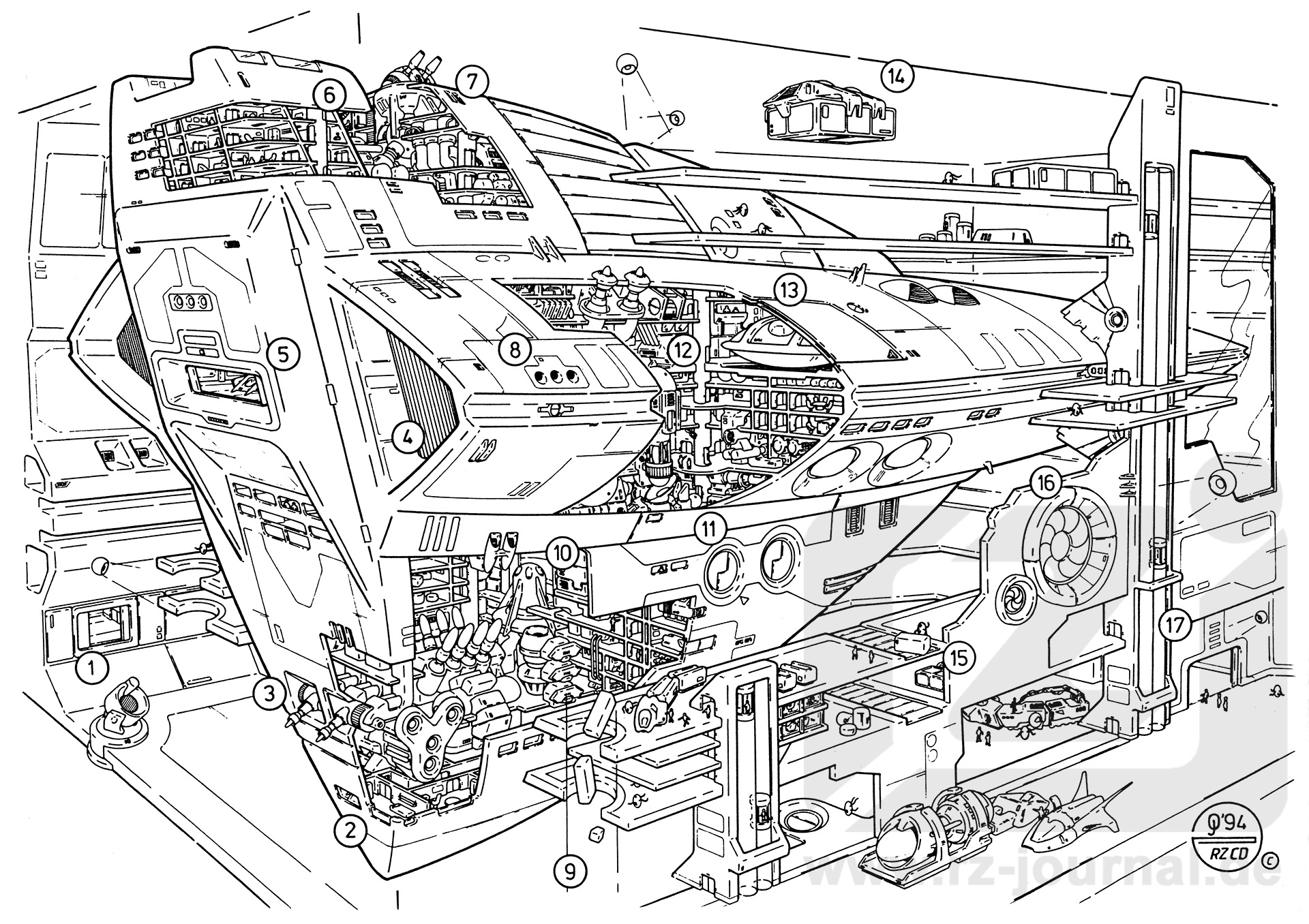 ALLGEMEINES: Die IRA-ROGABERG ist ein Schiff der "Liga Freier Terraner" (LFT) und wurde als Neubau in der Lunawerft 12 gebaut. Kommandant dieses modernen Fernaufklärungs-Schiffes ist der 130 Jahre alte Plophoser Muns-Betterford. Die IRA-ROGABERG ist ein Raumschiff, dass mit modernster Technologie ausgerüstet ist, darunter mit Ortungstechnik "State of the Art", speziell für den Aufgabenbereich der Fernaufklärung. Die syntronische Vernetzung des Schiffes stammt von Siga, was eine Ausnahme ist, da es kaum noch Siganesen gibt, die diese Technik entwickeln und warten können. Die vorliegende Darstellung zeigt die IRA-ROGABERG in einer Hangaranlage bei den Vorbereitungen zum Einsatz in der Großen Magellanischen Wolke.