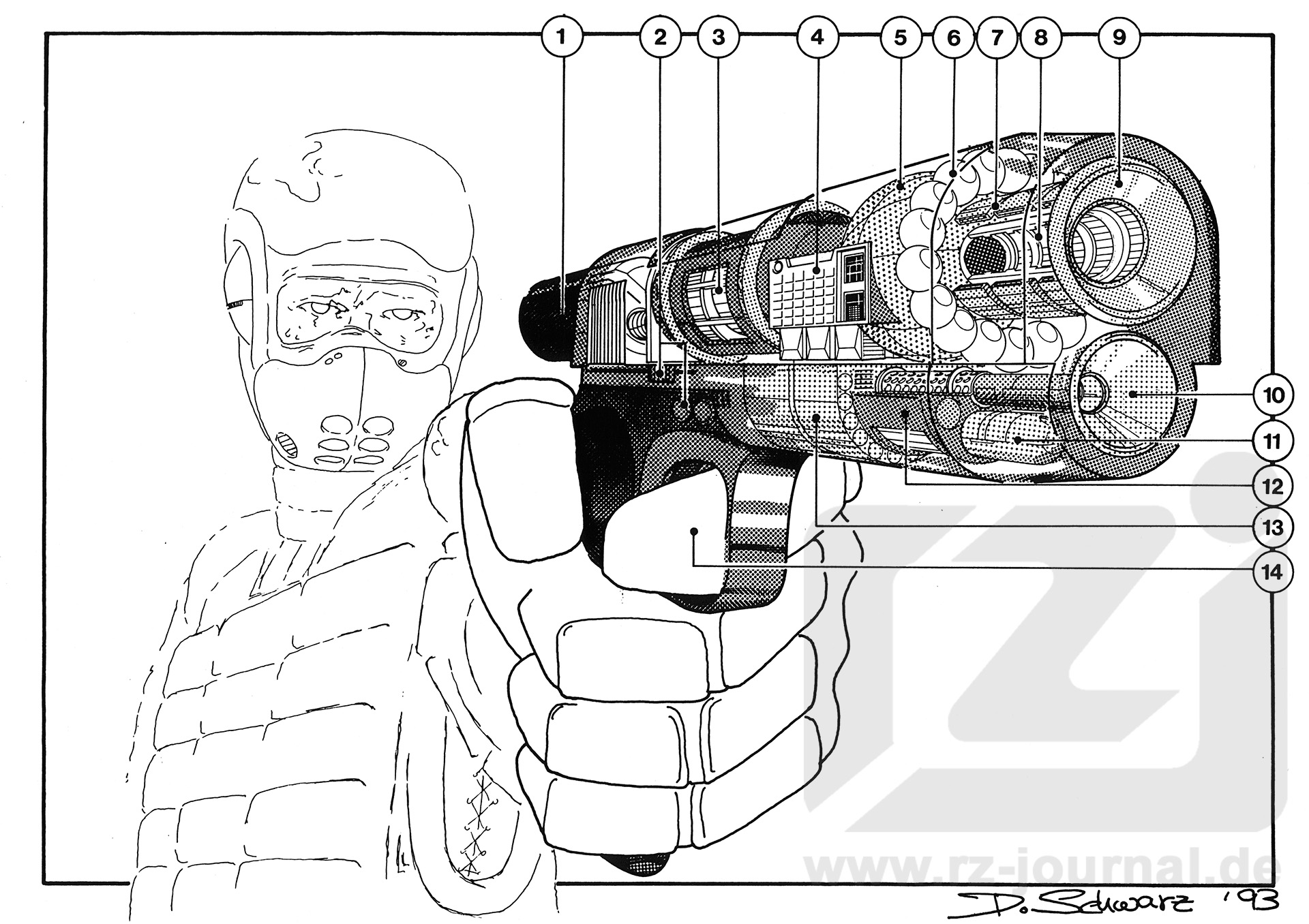 Technische Daten: Kombistrahler - Modell TH/P IV Maße: 21,1 x 17.0 x 6.0 cm Gewicht: 2030 g max. Schußdauer: 1.5 Stunden mit 1 Energiemodul auf Thermobasis 4,5 Stunden mit 1 Energiemodul auf Paralysemodus max. Schußweite: 600 m. je nach Umgebungsverhältnissen