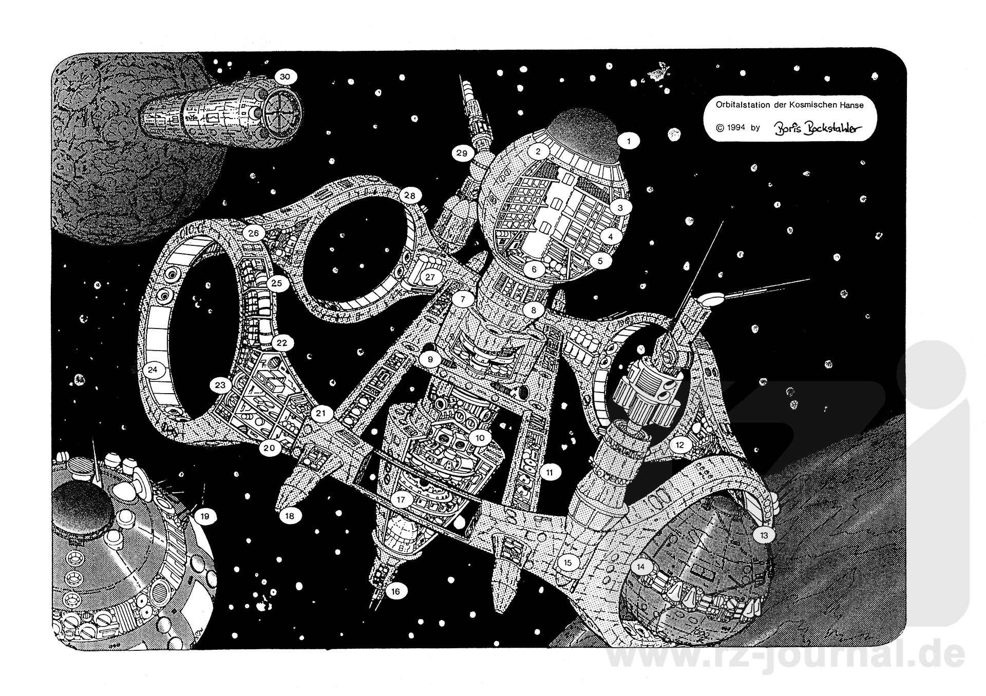 ALLGEMEINES: Die etwa 850 Stationen dieses Typs, die man über die gesamte Milchstraße verteilt finden kann. erfüllen mehrere, im Zuge der Expansion und Stabilisierung der KH im 13. Jahrhundert NGZ wichtige Aufgaben: - Zentralstation einer In mehreren Systemen verteilten mehrhundertköpfigen Forschergruppe In unbekannten Sektoren der Galaxis (den sogenannten weißen Flecken) - Handelsumschlagplatz für den Warenverkehr mit dem Galaktikum frisch assoziierten Völkern - Logistikknoten im Verteilernetz der KH (mit zwei speziellen Großtransmittermodulen) - Beobachtungsposten in relativer Nahe interstellarer Krisenherde Sie sind zweckmäßig mit zwischen 80 und 220 Galaktikern unterschiedlicher Herkunft besetzt, meist defensiv stark bewaffnet und verfügen - je nach Aufgabe - über zwischen zwei und vier 60-Meter-Korvetten und mehrere Space-Jets. Gleiter und andere Kleinfahrzeuge. Die Station hat einen Ringdurchmesser von 270 und eine lichte Höhe von 240 Metern. |