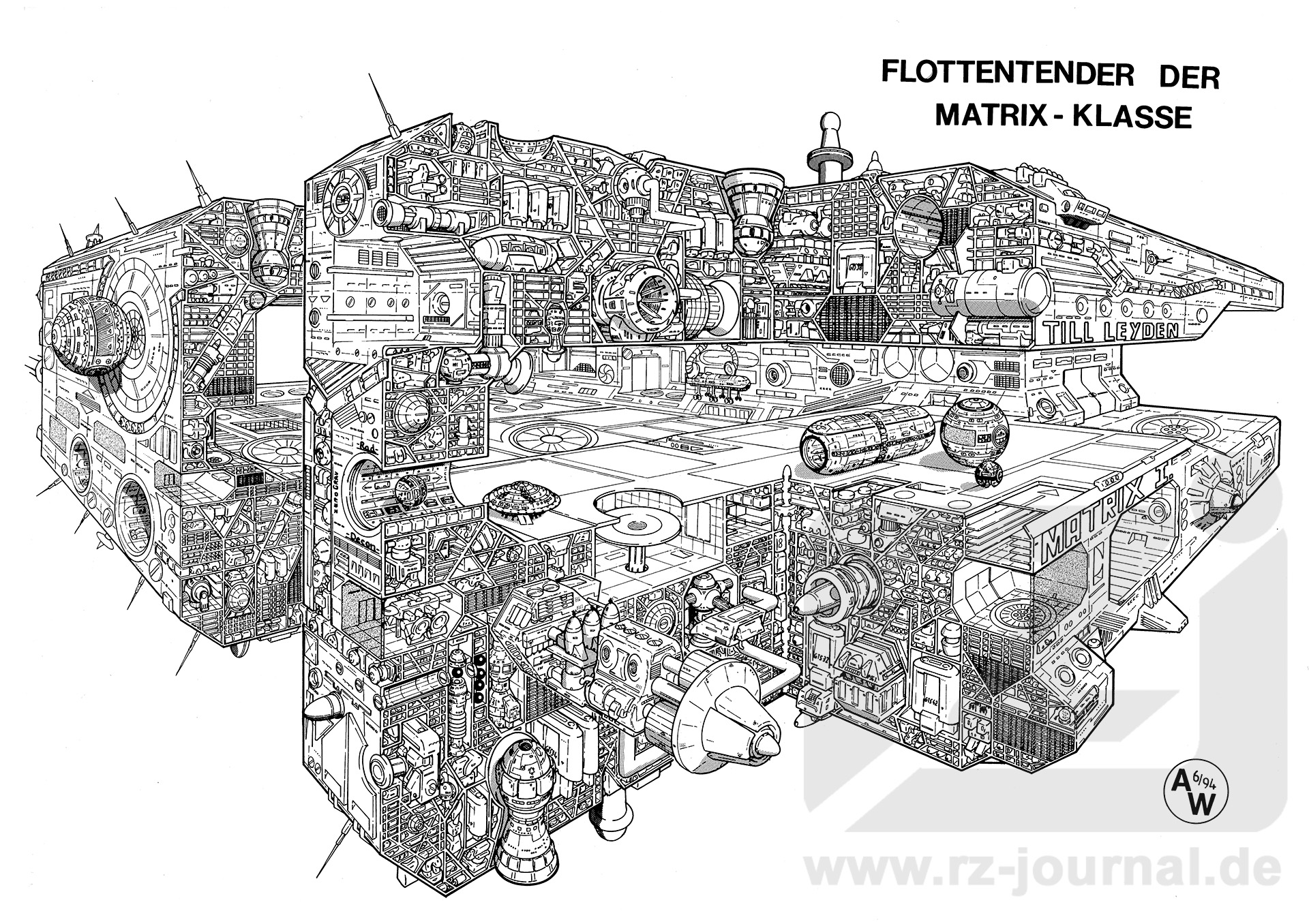 ALLGEMEINES: Flottentender sind fließende und somit vollmobile Werften. Der abgebildete Tender der sogenannten Matrix-Klasse ist eine rein terranische Entwicklung. Bis zum Jahr 1212 NGZ wurden vier baugleiche Einheilen der Serie hergestellt, je zwei Tender für die Kosmische Hanse und die LFT. Sie kommen im gesamten Bereich des Galaktikums zum Einsatz. Die Tender sind auf Umbau- und Reparaturarbeiten spezialisiert. Theoretisch kann ein Tender gleichzeitig acht 800-Meter-Kugelraumer der ODIN-Klasse versorgen. Daneben finden bis zu 32 100-Meier-Kreuzer Platz sowie ungezählte kleinere Einheiten wie Jäger. Space-Jets oder Korvetten. Die Abmessungen eines Tenders betragen etwa vier mal drei mal zweieinhalb Kilometer Bewaffnung und kampftechnische Ausstattung haben rein defensiven Charakter. Der Überlichtfaktor liegt mit 35 Millionen relativ niedrig. |