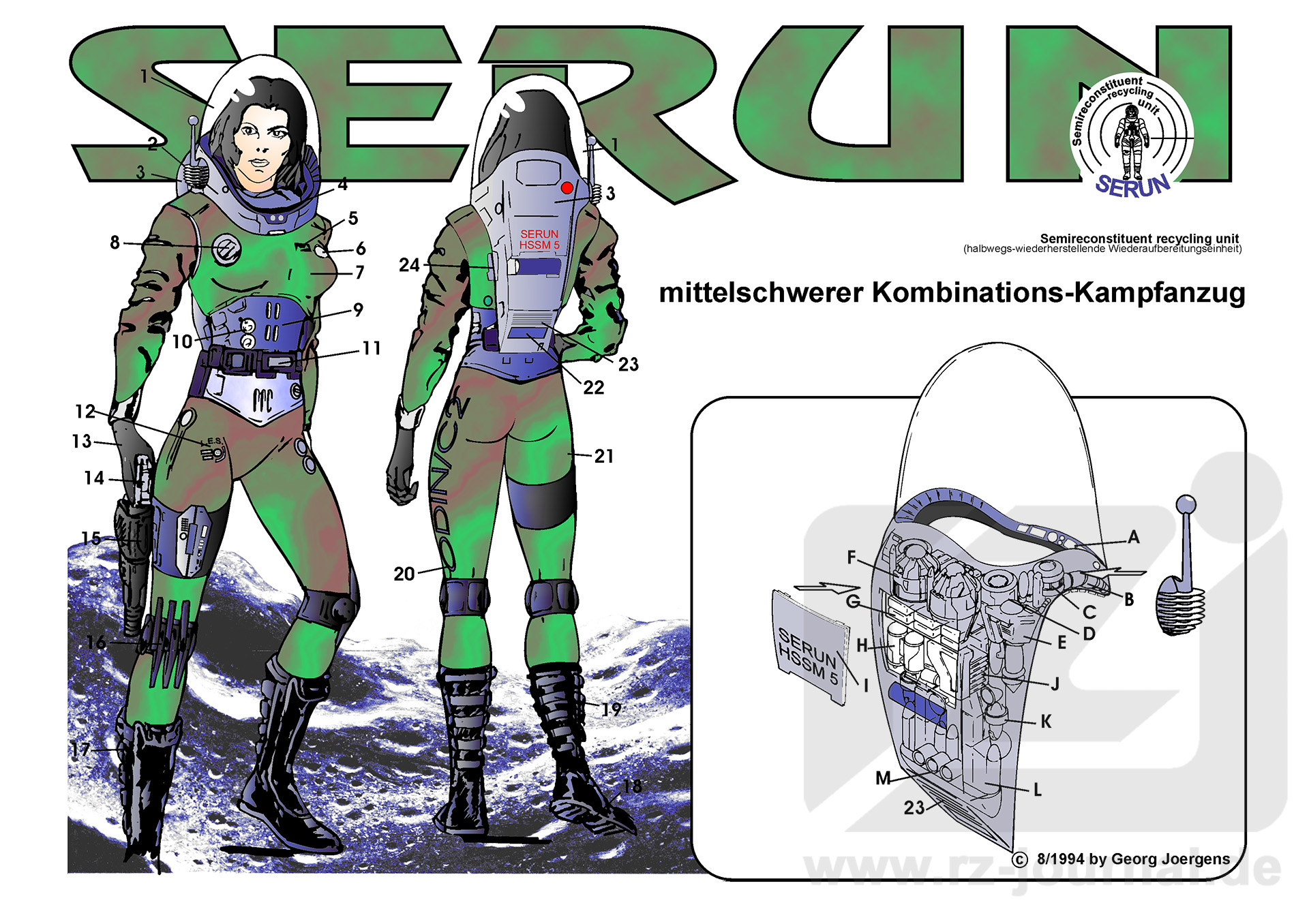 ALLGEMEINES: Der SERUN (semireconstituent recycling unit) hat sich schnell als beliebtes und hochwertiges Einsatzgerät in allen galaktischen Raumflotten durchgesetzt. Sicherlich gibt es Unterschiede in den völkerspezifischen Versionen, und auch der Einsatz solcher Anzüge ist auf hochwertige Aufgaben beschränkt. Immerhin kostet ein solches Komplettsystem eine ganze Menge und einfachere Aufgaben sind auch in "normalen" Raumanzügen zu bewerkstelligen. Es verwundert jedoch nicht, dassß ein so hochqualifizierter Raumanzug geradezu wie geschaffen für den militärischen Bereich ist. So sind fast alle Raum-Kampfanzüge auf SERUN-Basis angelegt. Die Darstellung zeigt einen mittelschweren Kombinations-Kampfserun mit Rückentornister für längere Einsatzdauer. Zu dem aus sehr widerstandsfähigem Material gefertigten Serunanzug und den Schutzschirmen verfügt der Kombinations-Kampfserun über einen zusätzlichen Oberkörperschutz. Er dient der Unterbringung weiterer spezieller Einsatzgeräte für den militärischen Einsatz sowie der Befestigung des Rückentornisters mit Helmkragen. Die Energiekapazität durch den Tornister vervielfacht die Leistungsfähigkeit des SERUNS um etwa das 20fache. Auch besitzt der Rückentornister ein weiterreichendes Gravojet-Triebwerk, eine wesentlich leistungsstärkeres Funksystem und austauschbare Luft-, und Wasserverräte. Somit ist der Träger eines solchen Kampfseruns für längere Zeiträume vollkommen autark von Versorgungseinrichtungen und logistischen Basen. Der Cybermed des Kampfserun verfügt nicht nur über eine ganze Palette von Sedativa, Analgetika und Psychopharmaka, sondern im speziellen auch über Amphetamine und anderen leistungssteigernden Seren. Die Bodenscanner der Raumstiefel liefern nicht nur Daten über Bodenstruktur und Zusammensetzung sondern verfügen auch über Minen-Scanner und können sogar sogenannte Syn-Traps - syntronische oder elektronische Bodenfallen aufspüren.