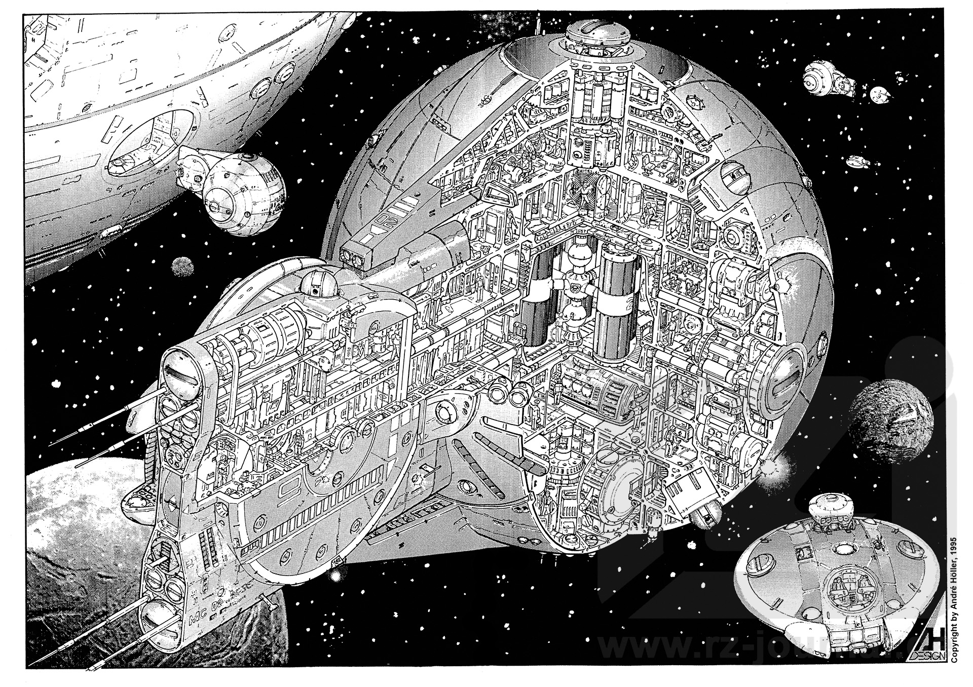 ALLGEMEINES: Die Kleinstkorvette der Kaskaya-Klasse ist ein reines Militärschiff. Im allgemeinen Sprachgebrauch wird das Schiff als „Minor Globe“ bezeichnet. Die Schiffsrumpf besteht aus einer 30 Meter durchmessenden Kugel und einem angeflanschten Antrieb-und Waffenausleger. Auf der Außenfläche des Auslegers befinden sich zwei runde 15 m durchmessende Mehrzweckplattformen, die auch kurz als Merz-Pad genannt werden. An ihnen können Beiboote und Waffenmodule sowie auch normierte Frachtcontainer gekoppelt werden. Als Beiboote können Space-Jets (Ø 15 m, Typ Gun-Jet) und Landungsraumfähren andocken. Waffenmodule mit verschiedenen Kanonen oder Trägermodule mit Raumtorpedos wandeln die Kleinstkorvette in einen schweren Zerstörer um. Auch als bewaffneter Schnelltransporter mit max. zwei Frachtcontainern ist das Schiff einsetzbar. Waffensysteme, Zusatz-Metagrav-Antriebe sowie eine Dockschleuse sind im Ausleger vorhanden. In der Kugelsektion befinden sich die Schiffszentrale, Mannschafts-und Aufenthaltsräume, Maschinen- und Frachtkammern, sowie die Hauptprojektionseinheiten der Metagrav-Antriebe. Die Metagrav-Triebwerbe sind auf beiden Seiten der Kugel zufinden. Durch die konzentrische Anordnung von 24 Grigoroff-Projektoren erhält das Schiff ein hohes Maß an Beweglichkeit. Zusammen mit den Zusatzmotoren im Ausleger der Kleinstkorvette können in der hyperphotischen Flugphase Geschwindigkeiten bis zu dem 75 millionenfache des Lichtes erreicht werden. In weniger als fünf Minuten kann das Schiff vom Stand aus in den Hyperraum versetzt werden, was einer Beschleunigung von über 1000 Km/s² entspricht. Die Minor Globe hat eine Länge von 50 Metern. Die Vielfältigkeit bei verschiedenen Einsätzen und die Effizienz der Minor-Globe ist größer als bei vergleichbare Raumschiffen (50 m Großraum-Space-Jet und 60 m Korvette). In Puncto Bewaffnung überbietet sie mit ihren 6 Transform-Kanonen und einer Batterie von 10 Desintegratoren mit Leichtigkeit die Kampfkraft einer 60 m Korvette. Die Kleinstkorvetten werden auf Trägerschiffen wie der Odin-, Thor-oder Tortuga-Klasse als Beiboote mitgeführt, wobei sie nur halb so viel Hangarraum benötigt wie die zuvor genannten Raumschiffstypen. Acht Minor Globes sind auf der Tankset in der Beibootflotille zu finden. Die Feuerkraft der Tankset lässt sich durch den Einsatz der acht verdoppeln. Im Jahre 1143 NGZ wurde die Kleinstkorvetten der KASKAYA-Klasse aufgrund ihrer guten Flug- und Kampfeigenschaften erstmalig in den Dienst gestellt. In den Haurikriegen erwiesen sie sich als schlagkräftige Waffen. Das dargestellte Scenario zeigt die Tankset beim Aussetzen ihrer Kleinstkorvetten zum Kampfeinsatz. Direkt nach den Ausdocken der Schiffe aus ihren Hangarräumen gehen sie in Kampfformation über und ihre angekoppelten Space-Jets werden in den Einsatz gebracht. |