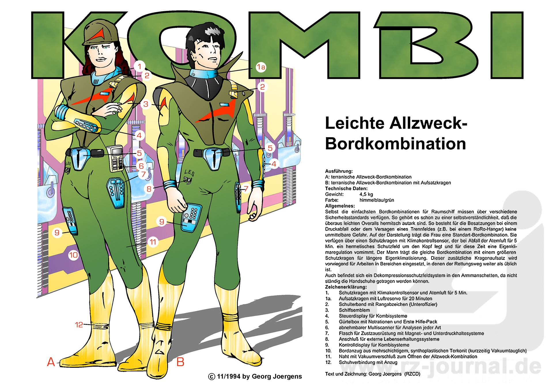 Ausführung: A: terranische Allzweck-Bordkombination B: terranische Allzweck-Bordkombination mit Aufsatzkragen Technische Daten: Gewicht: 4,5 kg Farbe: himmelblau/grün Allgemeines: Selbst die einfachsten Bordkombinationen für Raumschiff müssen über verschiedene Sicherheitsstandards verfügen. So gehört es schon zu einer Selbstverständlichkeit, dass die überaus leichten Overalls hermitsch autark sind. So besteht für die Besatzungen bei einem Druckabfall oder dem Versagen eines Trennfeldes (z.B. bei einem RoRo-Hangar) keine unmittelbare Gefahr. Auf der Darstellung trägt die Frau eine Standart-Bordkombination. Sie verfügen über einen Schutzkragen mit Klimakontrollsensor, der bei Abfall der Atemluft für fünf Minuten ein hermetisches Schutzfeld um den Kopf legt und für diese Zeit eine Eigenklimaregulation vornimmt. Der Mann trägt die gleiche Bordkombination mit einem größeren Schutzkragen für längere Eigenklimatisierung. Dieser zusätzliche Kragenaufsatz wird vorwiegend für Arbeiten in Bereichen eingesetzt, in denen der Rettungsweg weiter als üblich ist. Auch befindet sich ein Dekompressionsschutzfeldsystem in den Armmanschetten, da nicht ständig die Handschuhe getragen werden können. Zeichenerklärung: 1. Schutzkragen mit Klimakontrollsensor und Atemluft für 5 Min. 1a. Aufsatzkragen mit Luftreserve für 20 Minuten 2. Schulterband mit Rangabzeichen (Unteroffizier) 3. Schiffsemblem 4. Steuerdisplay für Kombisysteme 5. Gürtelbox mit Notrationen und Erste Hilfe-Pack 6. abnehmbarer Multiscanner für Analysen jeder Art 7. Flansch für Zusatzausrüstung mit Magnet- und Unterdruckhaltesysteme 8. Anschluss für externe Lebenserhaltungssysteme 9. Kontrolldisplay für Kombisysteme 10. Bordanzug aus mehrschichtigem, synthoplastischen Terkonit (kurzzeitig Vakuumtauglich) 11. Naht mit Vakuumverschluss zum Öffnen der Allzweck-Kombination 12. Schuhverbindung mit Anzug