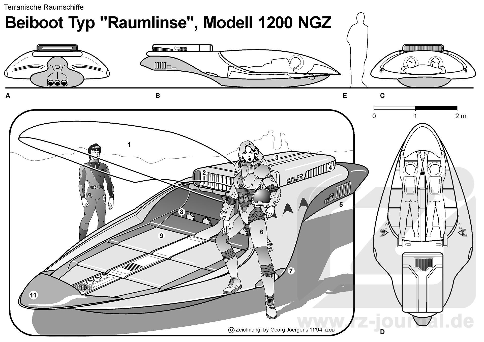 Allgemeines: Verbindungsboote, sog. Raumlinsen sind im Laufe der Zeit um knapp 2 zwei Drittel von ursprünglich 6 m auf nunmehr 4,8 m geschrumpft. Möglich wurde dies durch eine sehr kompakte Bauweise und der hochstehenden Technik, die hier zum Einsatz kommt. Vom Konzept her als Rettungsboot angelegt taugen die Raumlinsen wegen Ihrer geringen Größe und der damit verbundenen Ortungsschwierigkeiten auch als Spionage- und Erkundungsboote. Im Jahr 1217 setzte die PARACELSUS im Auftrag der Hanse 6 Raumlinsen ab um den Hamamesch-Basar GUMOSCH unerkannt zu erkunden. Gaea Grunget und Larini Priest gelang es so sich unbemerkt unter Mithilfe eines Containers in den Basar GUMOSCH einzuschleusen. Der Einstieg in die Raumlinse erfolgt durch das Hochschwenken der Kanzel. Da die Raumlinse keine Schleuse besitzt erspart man sich bei kleineren Operationen im All den Sauerstoff und der Pilot fliegt mit geschlossenem Anzugsystem, bzw. koppelt sich an das LES-System der Raumlinse.