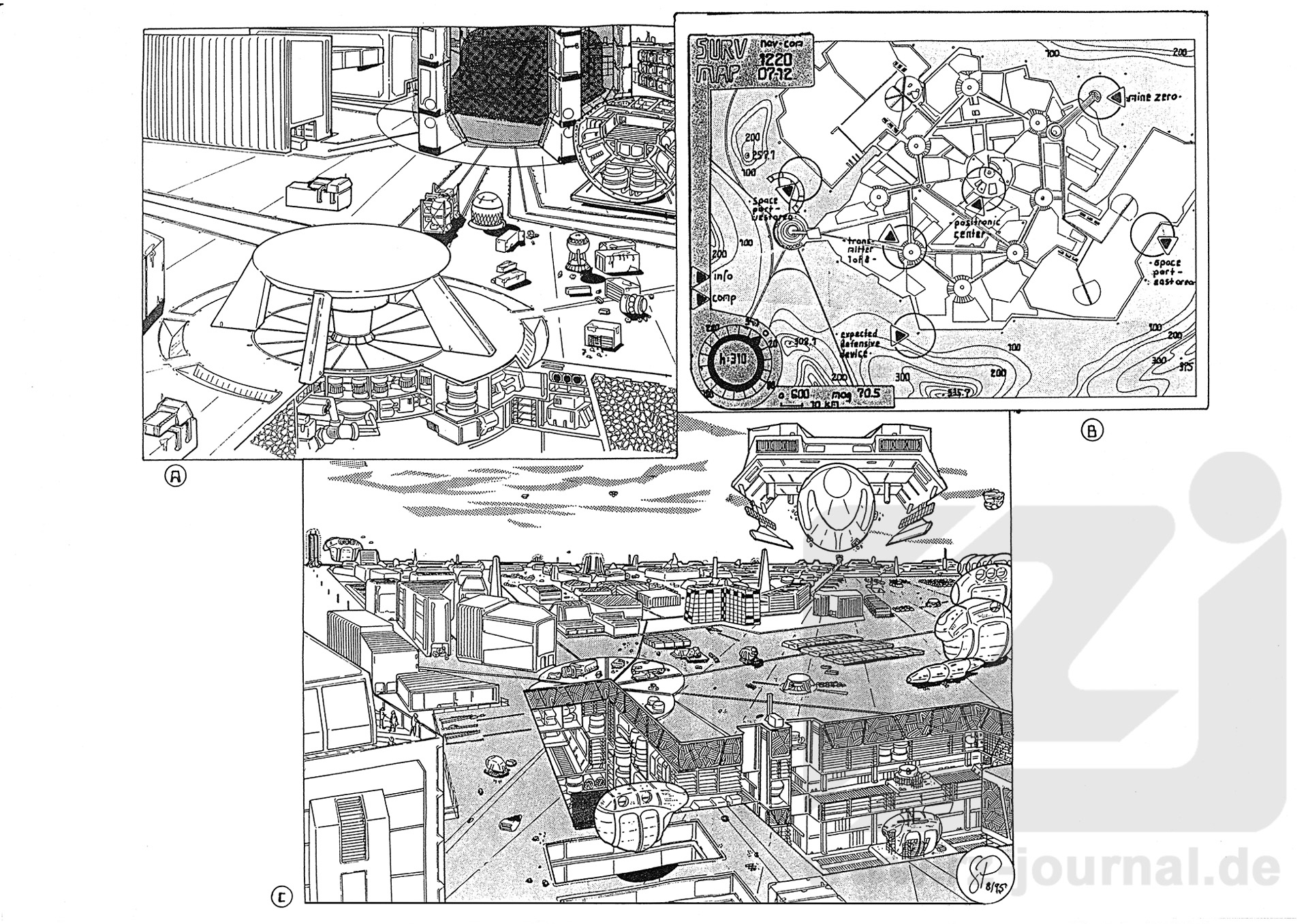 ALLGEMEINES: Auf Level 6 - Zonder-Myry -, 3400 Kilometer vom Südpol entfernt, liegt Railway Station. Es handelt sich hierbei um einen Reparatur- und Verschiebebahnhof für die gesamt Siegelware Hirdobaans! Von den Containerplaneten aus wird sämtlich zu reparierende Siegeltechnik über Transmitterstraßen nach Railway-Station abgestrahlt. Da diese Transmitter nur eine beschränkte Leistungsfähigkeit besitzen, müssen Großgüter wie Industrieanlagen und Raumschiffe vor dem Abtransport zerlegt werden. Auf Zonder-Myry materialisieren sie in den großen quaderförmigen Transmittern, von denen es insgesamt 8 gibt (analog den 8 Oktanten und Containerwelten). Railway besteht aus unzähligen Lagerhallen, unter- und Oberirdisch, Bandstraßenfabrikationsanlagen, Test- und Laufständen für Triebwerke und 2 großen Raumflughäfen. Im Osten werden alle ankommenden Raumschiffe der Hammamesch und Fermyyd zusammengesetzt und an die fliegenden Werften übergeben. Diese Steigen auf und setzen die Schiffe wieder instand. Anschließend werden sie dann an der westlichen Flanke am zweiten Hafenareal abgesetzt, zerlegt und wieder an ihre Bestimmungsorte mit Transmitter abgestrahlt oder als Ganzes zwischengelagert. An der Nordflanke erkennt man MINE-NULL. Dieser Giganttransmitter ist die Verbindung zu den Nachschub- und Werftplaneten Mine-1 bis 4. Der Verkehr allerdings ist in letzter Zeit stark eingeschränkt, Schiffsneubauten sind sehr selten. Im Zentrum von Railway steht ein mit Antennen bestückter Turm, 150 Meter hoch, innen voller positronischer Schalteinheiten - die zentrale Leitstelle. Über das gesamte Hafengelände sind 80-Meter-Transmitter-Karussells verteilt, alle farblos. Über diese wurde die galaktische High-Tech, verpackt in gelbe Container, über alle offenen Levels verteilt. Zeichnung A: Ein Aufriss von einem Karussell. Man sieht die Unterfluranlagen der Energieversorgung, Wartungsgänge. Weiterhin Transmitterprojektoren, Steuereinheiten für das Anpeilen der Gegenstationen auf den anderen Levels. Im Hintergrund: einer der quaderförmigen Großtransmitter, Lagerhallen, ein zerlegter Raumer und Container und Kräne, alles mit Robotern und automatischen Transportplattformen durchsetzt. Zeichnung B: Eine Hardcopy eines Navigations-Scanners. Hier ist Railway-Station in der Übersicht zu sehen. Die herausragendsten Punkte sind bezeichnet. Norden ist im oberen rechten Bildrand. Zeichnung C: Ein Blick Richtung Ost-Südost. Links im Hintergrund Mine-Null. Rechts oben eine fliegende Werft im Landeanflug auf das Westareal des Raumhafens. Direkt darunter am Horizont ist die Leitstelle erkennbar. Im Untergrund zwei Abschlusstestanlagen, in deren Verlauf die Raumer und Anlagen wieder zerlegt werden. Weiterhin eins der vielen Karussells, eine Sammelplattform für zerlegte Siegelware zum Weitertransport über Antigravstraßen zu den Transmittern.