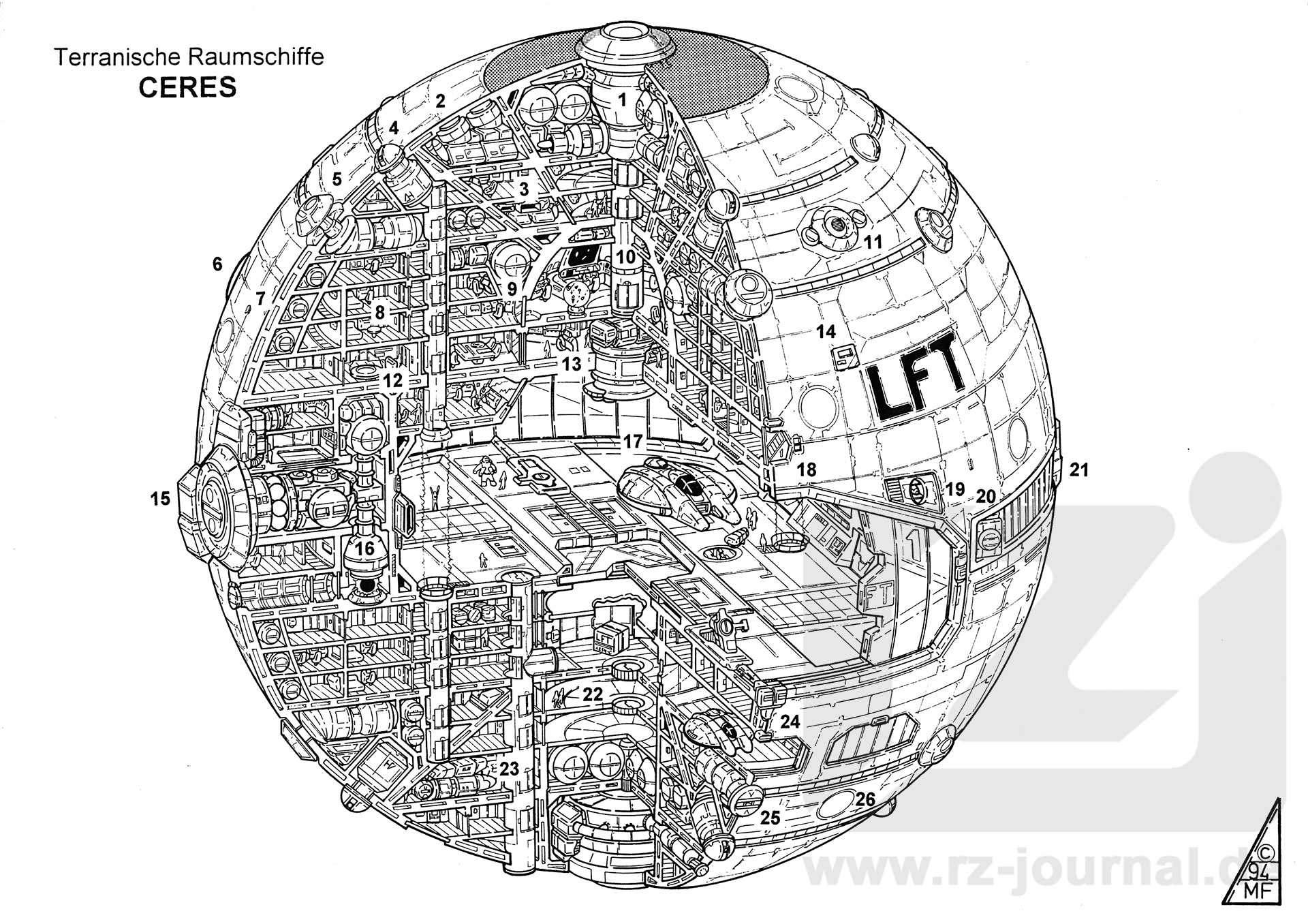 ALLGEMEINES: Die CERES ist das neueste Produkt der lunaren LFT-Staatswerft und zugleich eines der kostspieligsten Schiffsneuentwicklungen. Die Planer hatten die Aufgabe ein leistungsstarkes aber nicht zu großes Schiff zu konstruieren, dass neben den Merz-Kreuzern Typ VESTA, die ja den größten Teil der LFT Flotte ausmachen, einen festen Bestrandteil der terranischen Flotte sein sollte. Die Konstrukteure entschieden sich wiederum für ein Raumschiff mit ROLL ON-ROLL-OFF Hangar, da es sich in den letzten Jahrzehnten durchgesetzt hatte. Da der Einsatzbereich der CERES hauptsächlich militärisch sein sollte verzichtete man auf eine große Besatzung. Es ist jedoch auch möglich zusätzliche Decks im Hangarbereich einzubringen um so Platz für Raumlandesoldaten oder auch Laboratorien zu schaffen. Des weiteren kann der Kegelförmige Kernbereich unter dem Hangardeck ohne größere Umstände umstrukturiert werden um Patz für Zusatzaggregate zu bekommen. In diesem Fall befindet sich dort ein neuartiges ATG-Aggregat mit Zusatzgravitafspeicher. Technische Daten: Typ: CERES - MDOC - 001 Besatzung: 50 Standard (nach Umbauten 500 möglich) Beschleunigung: 1230 km/sec² ÜL-Faktor: 78 mio. mal c Triebwerke: 2 Haupt-Metagravtriebwerke, 2 Neben-Metagravtriebwerke, 4 Gravojettriebwerke, Antigravtriebwerke Schutzschirme: 5-fach gestaffelter Paratronschutzschirm, 5-fach gestaffelter HÜ-Schutzschirm Prallschirme, Virtual-Imager, Deflektorschirm, (ATG - Schutzfeld möglich) Bewaffnung: 16 Desintegratorgeschütze, 14 Transformkanonen (je bis 3000 Gigatonnen), 2 MHV-Geschütze (Hochenergie-,Impuls-,Intervall-, Paralysewirkung), 4 Raumtorpedowerfer |