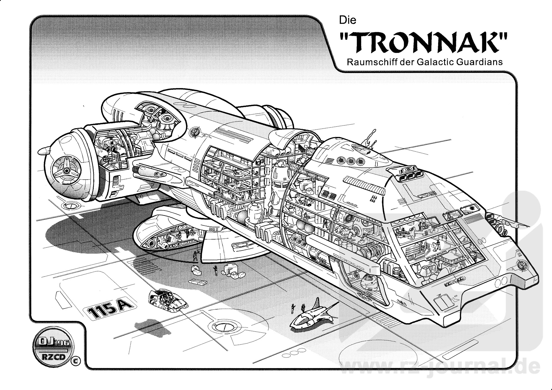 Allgemeines: Schiffe dieses Typs zählen zu den Eloxima-Raumschiffen, oder auch als Eloxima-Raumtubus bekannt. Ursprünglich für die kosmische Hanse konzipiert, wurde die Übernahme jedoch später abgelehnt. Die Gründe dafür sind verworren und Außenstehenden nicht ganz klar. Bis zum Jahre 1275 NGZ wurden anschließend 16 Einheiten dieses Typs gefertigt und von der Herstellerfirma auf dem freien Markt zum Verkauf angeboten. Scheinbar fremde und voneinander unabhängige Interessenten kauften nach und nach diese Schiffe auf. Tatsächlich handelte es sich bei diesen Käufern um Strohmänner der Galactic Guardians. Ursprünglich waren alle Eloxima-Raumer völlig unbewaffnet und zum Zwecke des Transports von Mensch und Material konzipiert. Die Galactic Guardians rüsteten die Raumschiffe allerdings nach und nach mit diversen Waffensystemen nach, so daß die Raumer gut bewaffnet sind. Was letztlich aus den 16 Raumschiffen geworden ist, weiß niemand so ganz genau. Das Sie sich alle in der Hand dieser verbrecherischen Organisation befinden, daran besteht allerdings wenig Zweifel. Technische Daten: Länge : 195 Meter Durchmesser Hauptrumpf : 42 Meter Durchmesser Seitengondeln : 29 Meter Höhe Hauptrumpf : 60 Meter Höhe Diskusbeiboot : 10 Meter Durchmesser Diskusbeiboot : 60 Meter Defensivsystem : Morphisches Tarnsystem mit Virtuelbildner für Fremd- und Mehrschiff- konfigurationen |