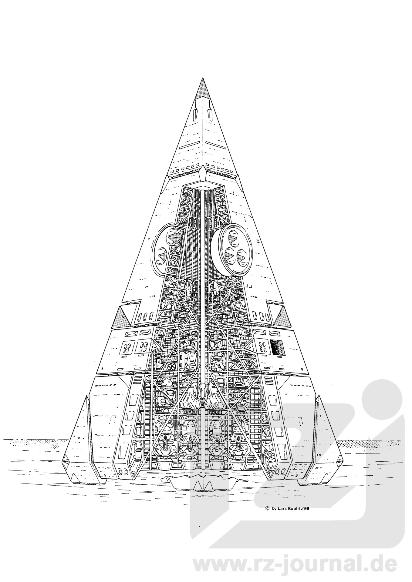 Allgemeine Daten: Bei dem dargestellten Raumschiff handelt es sich um ein Zentrifaal Schlacht-Raumschiff mit einer Kantenlänge von 1200 Metern bei einer Bodenplatte von 560 x 560 Metern. Es ist damit der größte bekannte Raumschiffstyp den die Zentrifaal-Kriegsflotte besitzt. Zentrifaal-Raumer gelten als die technisch am besten ausggerüsteten in Plantago, sofern die Galornen nicht in die Betrachtung mit einbezogen werden. Die Schiffe verfügen über Impulstriebwerke mit einem Beschleunigungsvermögen von bis zu 500 m/s². Das Raumschiff verfügt über wenige Geschütze, die dafür aber eine um so größere Schlagkraft haben. Das Neue an diesem Schiffstyp ist, daß er einen Teil seiner Geschütze als Kampfsatellit auskoppeln kann. Das verspricht z.B. mehr Schutz bei Landungen auf unbefestigten Planeten. Im Gegensatz zur TRONTTER sind die Beiboote auch als viereckige Pyramiden konstruiert worden. Und sie werden nicht an den Ecken sondern mit dem Bug voran in das Mutterschiff hinein angekoppelt. Die nun nach außen gerichteten Triebwerke können dank einer neuartigen Erfindung der Zentrifaal-Wissenschaftler als zusätzliche Impulswaffen genutzt werden. Diese Technik ist allerdings noch nicht ganz ausgereift. Der obere Teil des Schlachtschiffes kann im Notfall abgesprengt werden und dient dann als Fluchtschiff. Hier befinden sich auch sämtliche Zentralen und Funkanlagen. Die Landestützen sind bei diesem Schiffstyp nicht mehr beweglich, da ein Schiff dieser Größe wohl kaum in unberührtem Gelände landen wird. |