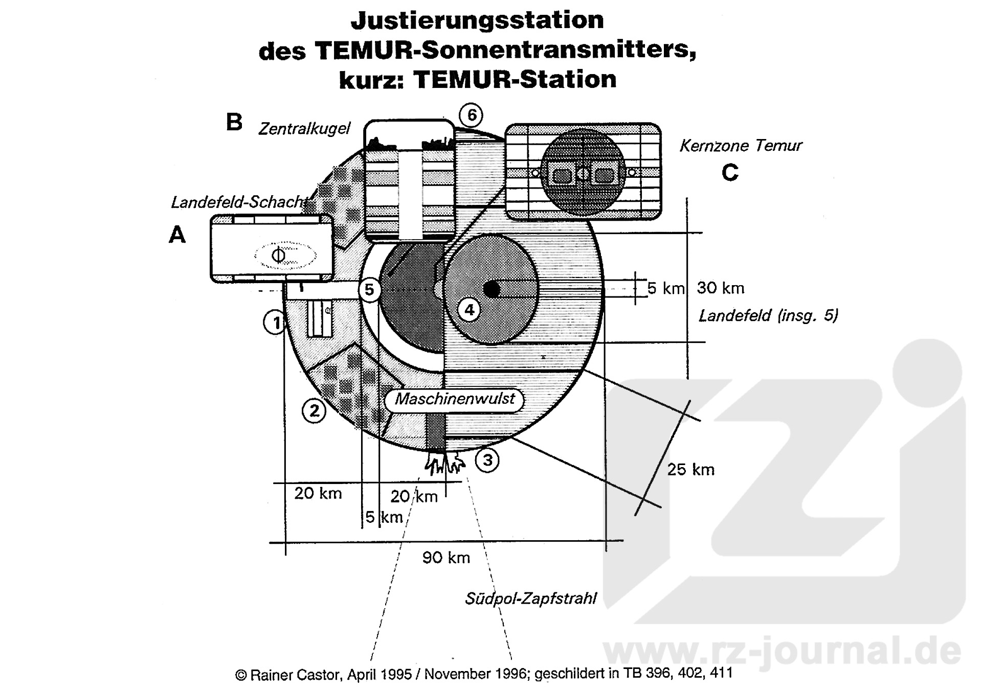 8facher Sol- Beschreibung: Ausgehöhlter Planetoid mit 0 90 Kilometer; ursprünglich eingebettet in Halbraumblase mit 0 200 Kilometer; Abstand Hüllfeld bis Oberfläche: 55 Kilometer (im Zuge der Aktionen des Goldenen, Talossa, wurden am 26.1.2422 viele Anlagen zerstört, die Halbraumblase fiel in sich zusammen; Temur-Station wurde später 5 Mrd. Kilometer über dem Mittelpunkt des Sonnenfünfecktransmitters stabilisiert und verankert). Temur-Station diente bis in die letzten Kriegsjahre den Lemurem als Forschungsbasis (»Lemurische Sternengarde«), diverse Neuentwicklungen, die nie zum Einsatz kamen. A: Äquatorbereich: ® fünf je 30 Kilometer große Landefelder, Mittelpunkt: Hauptschacht 0 fünf Kilometer, umgeben von Aggregatewulst; innerer Landefeldring als normaler Raumhafen gestaltet, Peripheriebereiche in Form halbkugeliger Dockbuchten inkl. Werftanlagen. Über Zentralschacht Zugang zu Hangar- und Werftanlagen in ca. acht Kilometer Tiefe (bis zu sieben Kilometer hohe Hallen; Prototypenbau u.ä.), Großtransmitterverbindung (Materialzufuhr etc.) zu Maschinenwülsten. ® 20 Kilometer dicke Gesteinsschale des Planetoiden ® Maschinenwulst meter breit, zwei Kilometer hoch; unterhalb davon bis in 17 KilometerTiefe: Aggregatekomplex (u.a. Projektoren für Halbraumblase, Masse-Energie-Pendler für Rohstofferzeugung aus Zapfstrahlenergie, Notreaktoren usw. - schwer beschädigt durch tefrodische Bomben am 26.1. 2422) ® Südpolbereich: Ring von Antennentürmen für Aufnahme der Sonnenzapfstrahlen, unterhalb: Umformer, Generatoren, Speicher, Verteiler© Nordpolbereich: Pyramiden aus rotem Lemur-Metall, als Fünfeck angeordnet (je 500 Meter hoch); Verbindung zum Sonnentransmitter, Aufbau eines Situationstransmitters (zerstört am 26.1. 2422). B:
