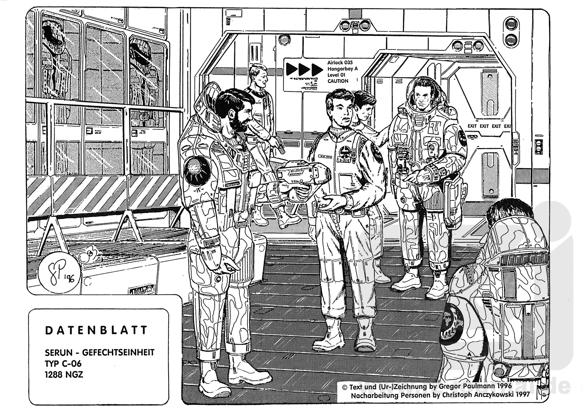 Die Szenerie ist in einem der Rüsträume eines PROTOS-Class Kreuzers in der Nähe einer Hangarschleuse angesiedelt. Links im Vordergrund sind Rückenteil mit Flugaggregaten und LFT-Hoheitssymbol zu erkennen. Darüberhinaus ist der MVH-Automat als kugelartiger Schulterfortsatz zu sehen. Er wird im aktivierten Zustand wahlweise vom Picosyn als Entlastung oder vom Träger über dessen Blickrichtung , die Sensoren im Helmkranz ablesen , gesteuert. In diesem Fall ist der vom Träger im Auge scharf fokussierte Gegenstand das Ziel. Feuerkommando wird akkustisch oder manuell (Doppelaugenaufschlag) gegeben. Weiterhin besitzt der Anzug ein Holster mit Wiederaufladeanschluß für eine rein manuell geführte Handwaffe. Der Kommando-Leiter gibt gerade seine Handwaffe, ein MRCB V-B, ab. Man sieht, neben eines Bartes als Zeichen der Einsatzdauer, seine Rangabzeichen und das immer noch gültige terranische Sonnenabzeichen. Zu erkennen sind auch die Panzerungen seiner Handschuhe, die je ein ausfahrbares Zwillingsvibratormesser enthalten. Der zuversichtliche Raumsoldat im Hintergrund dagegen trägt als Handwaffe die Standardwaffe der Raumlandetruppen, einen Intervallnadler/Paralyse MRAB II-M. Beide Handwaffen von GDS-General Defense Systems. Die Servicebesatzung trägt einen normalen Bordanzug, ebenfalls mit Rang-, Hoheits- und Schiffsabzeichen. Dieser verfügt über Rettungsmechanismen wie ein Sauerstoffsystem für 20 Minuten und einen abdichtenden Prallfeldschirm bei Dekompressionen. Weitere Details bitte den einschlägigen Datenblättern entnehmen.