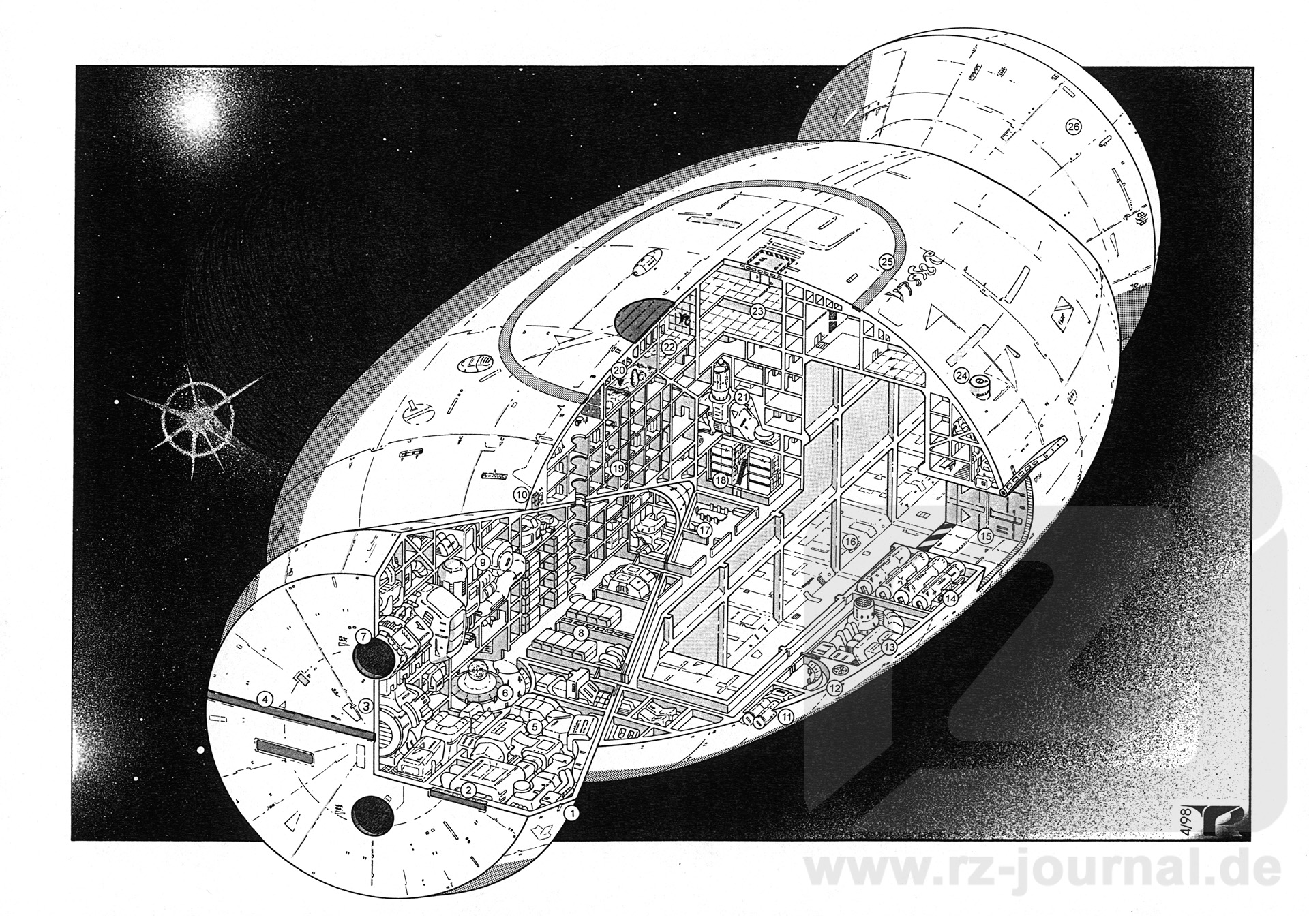 Die Abbildung zeigt ein Thorrimer-Raumschiff der Standardklasse. Dieser am meisten verwendete Schiffstyp ist 150 Meter lang, 80 Meter breit und 65 Meter hoch. In den linsenförmigen Hauptrumpf, der den Laderaum, Unterkünfte, Freizeiteinrichtungen und einige Ersatzaggregate enthält, sind zwei kegelförmige Module eingefügt. Diese lassen sich im Notfall absprengen. Der sogenannte A-Kegel birgt die Hauptleitzentrale, sekundäre Lebenserhaltungssysteme und Energieerzeuger. Es sind spezielle Ruhekammern vorhanden, in welche sich die Besatzungsmitglieder nach einer Abtrennung zurückziehen können, da die Thorrimer körperlich sehr empfindlich sind. Mit den zwei Impulsbremstriebwerken sowie einem kleinen Linearkonverter dient der A-Kegel neben dem B-Kegel als autarkes Rettungsschiff. Der B-Kegel enthält den Hauptantrieb, welcher dem Schiff mit fünf Impulstriebwerken ein Beschleunigungsvermögen von 90 km/sec2 verleiht. Der hier integrierte große Linearkonverter ermöglicht einen Überlichtfaktor von einer Million. Hinzu kommen Hauptenergieaggregate und Energieschirmerzeuger. Über die Abschußvorrichtung für Raumsonden lassen sich Im Bedarfsfall etwa ein Dutzend Raumtorpedos starten, die Offensivbewaffnung umfaßt sonst nur noch ein Thermo-/Desintegratorgeschütz für die Asteroidenabwehr. |