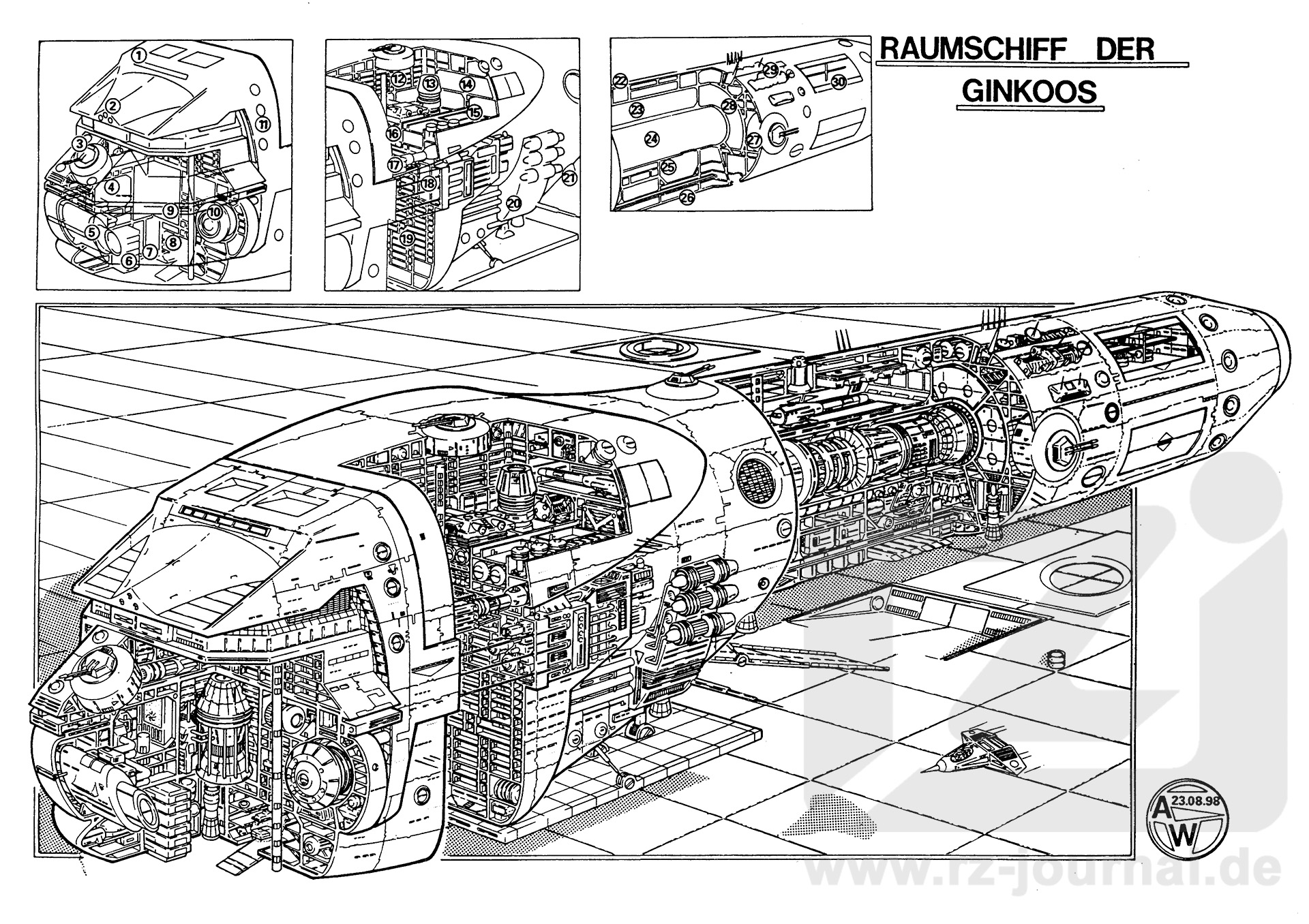 Die Ginkoos sind entfernt humanoide Bewohner der Galaxis Puydor mit breitem Fischmaul, Doppelkinn und dickem Hals. In Puydor sind sie vor allem als besonders geschäftstüchtige Händler bekannt. Insbesondere im Bereich um Curayo beherrschen sie den Handel mit Tronium-Azynt (Howalgonium) völlig. Ginkoos lieben es, sich mit Schmuck und prunkvollen Gewändern zu schmücken. Ihre Raumgsschiffe erinnern Terraner entfernt an Keulen. Die Form ist jedoch einem Fabeltier aus der Mythologie der Ginkoos nachempfunden. Frachtschiffe messen bis zu 1.200m in der Länge, Kriegsschiffe maximal 600m. Tronium-Azynt von Curayo wurde stets nur auf Kriegsschiffen transportiert. Das dargestellte Schiff ist der größte Kriegsschifftyp der Ginkoos mit einer Länge von 602,35 m, einem hinteren Durchmesser von 81,04 und einem vorderen Maximaldurchmesser von 119,81 m. Die Bewaffnung umfaßt 16 schwere Kombistrahler (Desintegrator/Thermo) sowie einen Dreifachlauncher für Raumtorpedos mit thermonuklearen Sprengköpfen. Leichte Geschütze befinden sich nicht an Bord. Im Bedarfsfalle wird der Energieausstoß der schweren Thermostrahler einfach verringert. Diese Option besteht für die Desintegratoren nicht. Die Defensivbewaffnung besteht aus einem Schirmaggregat ähnlich dem terranischen HÜ-Schirm. Die Besatzungsstärke beträgt, je nach Einsatzmodus, bis zu dreihundert Ginkoos. Im Bedarfsfall finden kurzfristig auch noch bis zu 500 Mann Landetruppen Platz. Die Ginkoos waren eines der ersten großen raumfahrenden Völker, die vor Jahrtausenden von Guu-Nevvever befriedet wurden; sie waren auch eines der ersten, das unter den Einfluß seiner befreiten Halbschwester Jii-Nevvever geriet.