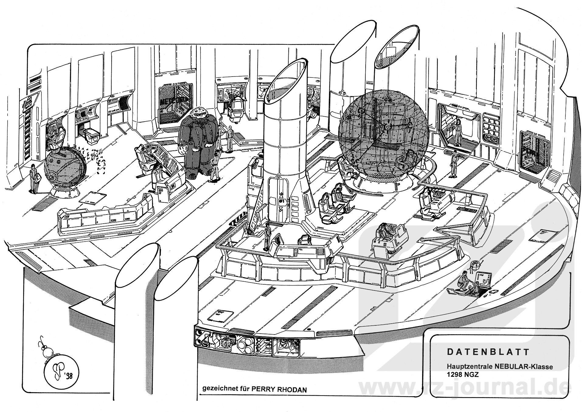 Stationen Mittig sieht man den zentralen Antigravschacht, der alle Einrichtungen der Zentralkugel miteinander verbindet. Davor die beiden Kommandoplätze (CommanD CMD) des Kommandanten und des jeweils diensthabenden Offiziers’[1]. Links davon die Station Ortung und Einsatzlage (Reconnaissance/Operating Forces Rec/OFs) Dargestellt ist gerade eine Standortbestimmung. Im Vordergrund links Navigationstation NAV I mit Kommunikationsstation NetCommunication. Rechts NAV II mit Feuerleitstation (FControl FCtrl). Rechts außen die Maschinenstation Engeneering ENG. Im Hintergrund der Zentrale befinden sich die Stationen für Bordsicherheit (Security SEC), Umweltsysteme, Bordsyntronikverbund und der Navigationszentrale. Hinter dem halutischen Besucher schließt sich backbordseitig die Zugangsschleuse zur Kommunikationszentrale an. Es schließt sich die Wissenschaftsstation Science SCN I an. Nach den gepolten Antigravschächten folgt eine der zwei Deckzugangsschleusen zur Zentrale und die Verbindung zur Feuerleitzentrale. Steuerbordseitig befindet sich hier der Zugang zur Deckscafeteria, Konferenzraum 1 und Kommandanten-Arbeitsraum, ebenfalls 2 Antigravschächte, Wissenschaftsstation SCN II und die Schleuse zur Einsatzzentrale für Beiboote OFs. Unterhalb der Hauptzentrale befindet sich die Syntronikzentrale und der Syntronverbund. Hinter dem zentralen Antigravschacht sieht man den Fluchttransmitter, mittels dem die Besetzung im Notfall die Zentrale räumen kann. Er gehört zum bordinternen Transmitternetz und führt zu den Rettungspods.