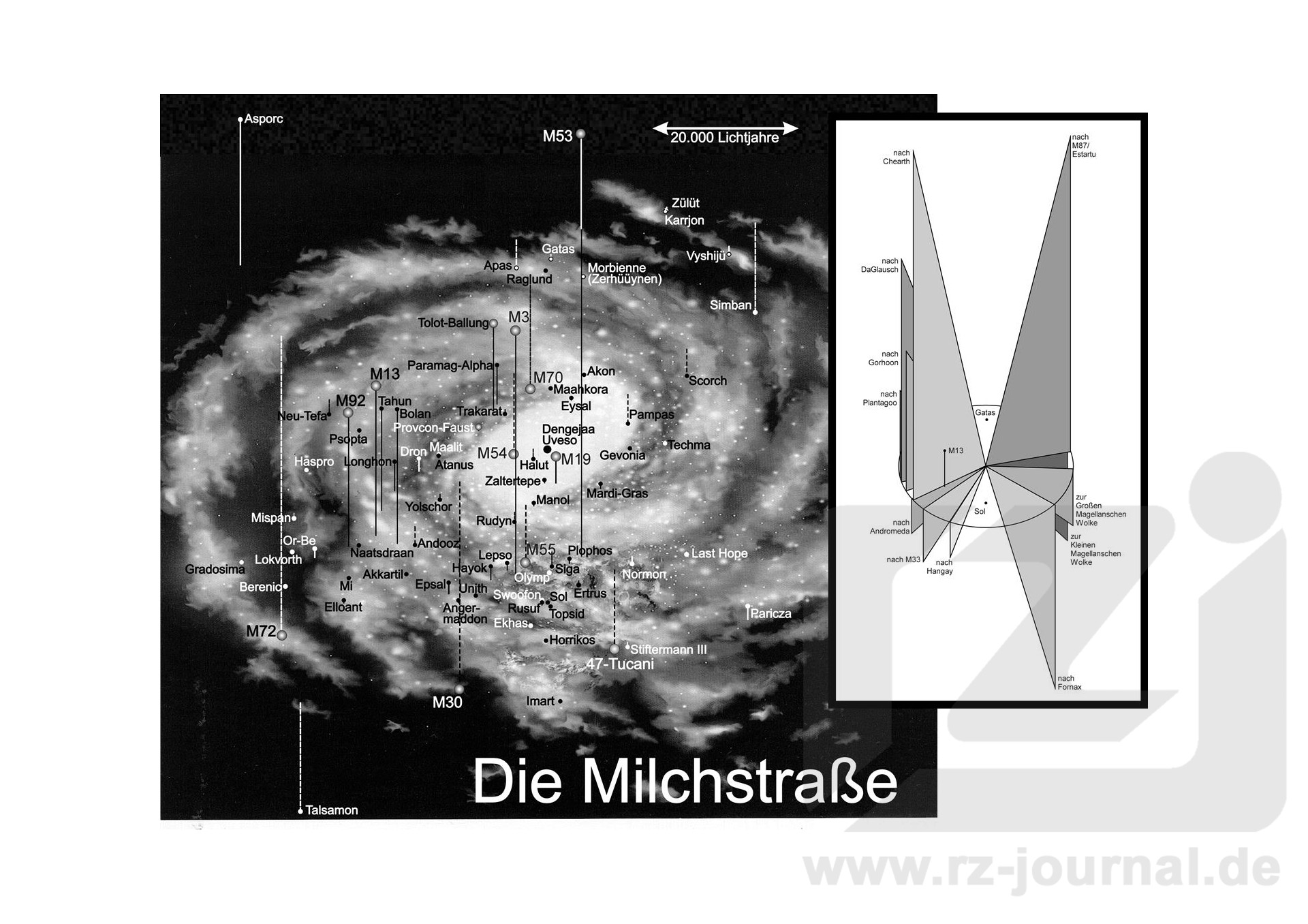 Mit dem Wiedererstarken des arkonidischen Kristallimperiums ist die Milchstraße erneut ins Zentrum der PERRY RHODAN-Handlung gerückt. Konsequenterweise gibt diese erste aus einer Reihe von neuen Schauplatzkarten einen Überblick über unsere Spiralgalaxis. Im Vordergrund ist die Westside mit den Welten der LFT zu sehen, im Hintergrund die Eastside, der Lebensraum der Blues. Die Karte zeigt nicht nur die Hauptwelten der wichtigsten Sternenvölker, sondern zur besseren Orientierung auch einige Planeten, die in früheren Epochen der PR-Serie eine Rolle spielten. Die Karte selbst führt im Normalfall statt der Namen der Sonnensysteme die ihrer wichtigsten Planeten auf, weil diese meist bekannter sind. Die Bezeichnungen der entsprechenden Sonnen können der nachfolgenden Auflistung entnommen werden. Einzelne Details weichen von früher veröffentlichten Karten ab. Um den im Laufe der Zeit angehäuften inhaltlichen Widersprüchen der Serie Herr zu werden und um zukünftige Fehler einzudämmen, wurden die Positionen zahlreicher Sonnensysteme in Zusammenarbeit mit Rainer Castor endgültig verbindlich festgelegt. Dabei mußten in Einzelfällen auch Entfernungsangaben korrigiert werden, um den Handlungszusammenhängen gerecht zu werden. Das Einschaltbild auf der rechten Seite zeigt die Flugrichtung zu einigen Galaxien sowie anderen wichtigen Vertretern der Lokalen Gruppe. Auf die Entfernung der entsprechenden Objekte kann daraus nicht geschlossen werden. 47 Tucani (NGC 104): Kugelsternhaufen, 16.000 von Sol. Der Sternhaufen war während der Tolkander-Invasion der Hauptbasis der Eindringlinge. Akkartil: einziger Planet der roten Riesensonne Rachmeyn, 20.236 Lichtjahre von Sol entfernt; Weil er, wie ihre ursprüngliche Heimatwelt, von einem Mini-Black Hole umkreist wird, diente der Planet den Nakken als wichtiger Stützpunkt. Akon: 45.000 Lichtjahre von Sol entfernte blaue Riesensonne mit 18 Planeten; Nr. 5, Drorah oder Sphinx, ist die Hauptwelt der Akonen, die sich dem Forum Raglund angeschlossen haben. Andooz: 6. von 13 Planeten der Sonne Andan Kruul; 23.783 Lichtjahre von Sol; Heimatwelt der krötenartigen Andooz, die einst dem Großen Imperium der Arkoniden angehörten und mittlerweile ein eigenes Sternenreich mit 250 Systemen kontrollieren. Angermaddon: 2. von 5 Planeten der gelben Sonne Chachit; 12.270 Lichtjahre von Sol; während der Monos-Ära eine wichtige Stützpunktwelt der Cantaro. Apas: 4. von 11 Planeten der roten Sonne Pahl, 71.429 Lichtjahre von Sol entfernt; Zentralwelt der dem Forum Raglund angeschlossenen Apaso-Blues, deren Reich ca. 800 Planeten umfaßt. Asporc: 4. von 11 Planeten der großen gelbroten Sonne Rattley; 81.076 Lichtjahre von Sol; Heimatwelt der Asporcos; wegen seiner Lage außerhalb des Chronopuls-Walls spielte der Planet auch in der Monos-Ära eine gewisse Rolle. Atanus: gelbe Sonne mit 5 Planeten; 32.106 Lichtjahre von Sol entfernt; Haknor, der von Springerabkömmlingen bewohnte 2. Planet war 2326 Fundort eines Zellaktivators; 1147 NGZ stießen im Atanus-Sektor Raumschiffe der Posbis mit Einheiten der Cantaro zusammen; 1216 NGZ kam es im Atanus-Sektor zu Zwischenfällen mit dem Kugelwesen Bermuda. Auf Haknor existieren inzwischen mehrere Großwerften. Berenic: 5. von 17 Planeten der Sonne Beren; 36.147 Lichtjahre von Sol; Heimatwelt der insektoiden, vierbeinigen Berenicer; einst ein Vasallenvolk der Arkoniden; Berenic ist heute die Zentralwelt eines kleinen unabhängigen Imperiums von 80 Planeten. Bolan: 2. von 8 Planeten der weißen Sonne Pungin; 30.023 Lichtjahre von Sol; auf dem zum arkonidischen Einflußbereich gehörenden Planeten leben seit zwei Jahrtausenden Arkoniden und Akonen zusammen. Dengejaa Uveso (Abgrund voller Kraft): aus dem Sothalk der Ewigen Krieger übernommene Bezeichnung für das Gigant-Black Hole im absoluten Milchstraßenzentrum; 30.000 Lichtjahre von Sol entfernt. Dron: 8. von 23 Planeten der Sonne Dorgshi; 31.295 Lichtjahre von Sol; Heimatwelt der echsenhaften Dron, die einst eine wichtige Stütze des Großen Imperiums der Arkoniden waren und heute dem Kristallimperium angehören. Ekhas: 3. von 8 Planeten der gelben Sonne Naral; 4536 Lichtjahre von Sol; Heimatwelt der von arkonidischen Siedlern abstammenden Ekhoniden, die sich weiter ausgebreitet haben und gegenwärtig rund 100 Sonnensysteme kontrollieren. Elloant: 3. von 8 Planeten der Sonne Lezan; 28.0009 Lichtjahre von Sol; Heimatwelt der fuchsartigen Elloanty, die zum Großen Imperium der Arkoniden gehörten. Epsal: 2. von 6 Planeten der gelben Sonne Vono; 13.844 Lichtjahre von Sol entfernt; 2045 von Terranern besiedelter Planet, dessen Bewohner an eine Schwerkraft von 2,1 Gravos angepaßt wurden; selbständige Republik, die der LFT angeschlossen ist. Ertrus: 3. von 6 Planeten der gelben Sonne Kreit, 6.136 Lichtjahre von Sol; die Heimatwelt der an die hohe Schwerkraft ihres Planeten angepaßten Ertruser; diese gingen durch genetische Umformung aus den terranischen Siedlern hervor, die sich im Jahr 2026 auf Ertrus niederließen; im 4. Jahrtausend Zentralwelt des mächtigen Carsualschen Bundes; heute ist die Kreit-Koalition mit 78 Planeten ein der LFT assoziiertes, eigenständiges Staatsgebilde. Eysal: 2. von 4. Planeten der kleinen grünen Sonne Eyciteo; 39.834 Lichtjahre von Sol; 2326 wurden hier unabsichtlich die von Apasos installierten Gravitationsenergetischen Stoßfrontgeneratoren aktiviert, die die Hornschreckenplage und indirekt den Krieg zwischen dem Vereinten Imperium und den Blues auslösten; auf Eysal kam es auch zur ersten Begegnung von Terranern und Blues. Mittlerweile haben sich die Eysaler, Nachkommen arkonidischer Siedler, von ihrem zivilisatorischen Rückfall erholt und beherrschen ein kleines, von allen Großmächten unabhängiges Sternenreich aus 20 Sonnensystemen. Gatas: 5. von 14 Planeten der blauen Riesensonne Verth, 68.319 Lichtjahre von Sol; Hauptwelt des Bluesvolkes der Gataser, das rund 1500 Sonnensysteme kontrolliert, und eines der einflußreichsten Mitgli