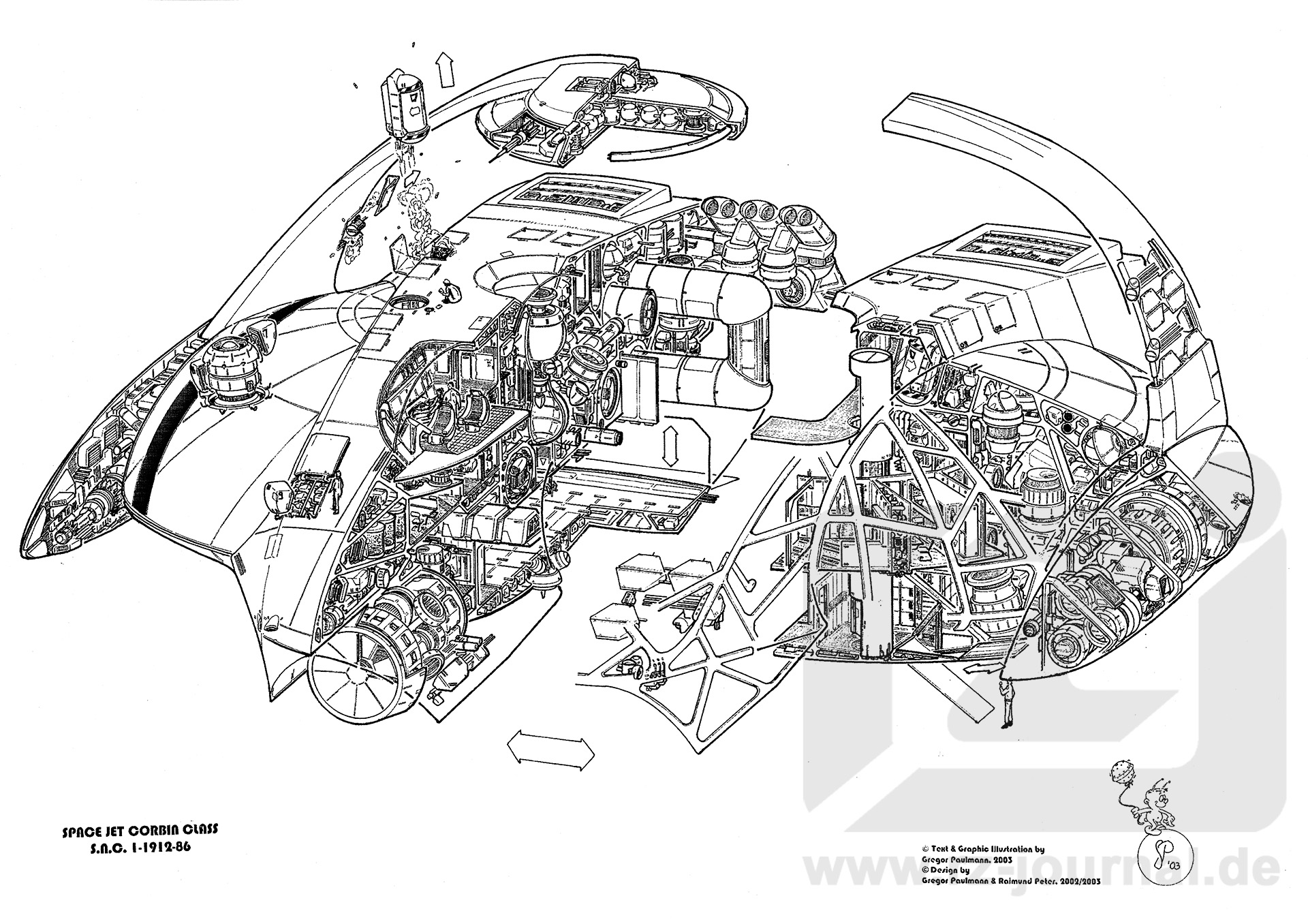 Taktische Systeme T1 MVH-Abstrahlkopf (vier) mit Zielsuchsystemen T2 MVH-Generator und Energieversorgung T3 Projektorkopfintervallkanonen T4 Resonatorkern T5 Zielverfolgungssensoren T6 Energieversorgung Intervallkanone T7 Paratron-Schirmfeldgenerator (sechs) T8 HÜ-Schirmfeldgenerator (vier) T9 Staffelschirm und Projektorphalanx Backbord T10 Staffelschirm und Projektorphalanx Vorderseite T11 Prallfeldgenerator (zwei) T12 Virtuellbildner Matrixgenerator Versorgung und Besatzung U1 Cockpit für Kommandant/Pilot (Mitte), Navigation/Kommunikation (Links) und Waffen/Aufklärung (Rechts] U2 Sitz mit einzelnem Anschnallfeld, Schirmschutz für Notfälle U3 Avionik-Rack und Hologramm-Display U4 Oberdeck mit Zugang zu Rettungspods (14) U5 Ein-Personen-Rettungspod und elektromagnetisches Katapult U6 Antigravschacht Backbord U7 Formenergieprojektor für Andocktunnel-, und Traktorstrahler U8 Rettungspod Startsequenz U9 Mitteldeck mit Besatzungsquartieren, Hygieneräume, Medostation U10 Messe mit Kombüse und Lebensmittellager im Zwischendeck U11 Unterdeck mit Luftschleuse U12 Außenschott mit Luftschleuse U13 Zugangsrampe aus Formenergie U14 Projektor für Zugangsrampe U15 Magazin für Missionsausrüstung, Waren, Ersatzteile U16 Hauptladeraum mit Gravotrak-Projektor U17 Traktorstrahlerfür Ladebucht U18 Zugangsrampe für Laderaum aus Formenergie U19 Landekissen Projektor und Generator, Erdungsanschluss Struktur M1 Identifikation und Logo M2 Positionsleuchte M3 Suchlicht (verschiedene Frequenzbereiche] M4 Wartungsklappe M5 Terkonithülle mit galvanisch aufgebrachter Ynkeloniumschicht M6 Selbsttragende Zelle mit adaptivem Festigkeitssystem (beinhaltet Formgedächtnis-Materialien] M7 Lokaler Feldgenerator des adaptiven Festigkeitssystems M8 Abgesprengter Flugdatenrekorder und Notfallboje M9 Wartungszugangstür Hypertrop Text & Zeichnung: © Gregor Paulmann, 2003 |