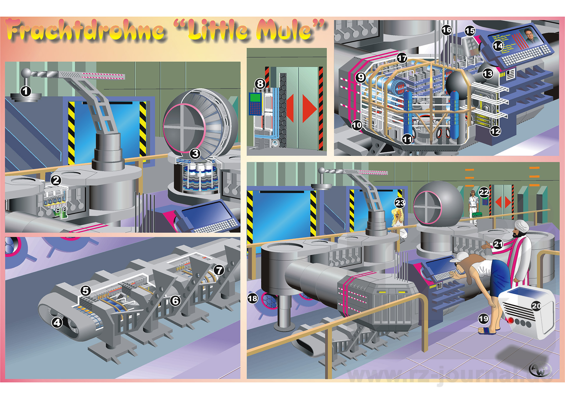 Little Mule, das kleine Maultier, ist eine kostengünstige Alternative für planetarischen und interplanetaren Transport. Im Grunde handelt es sich um eine Taschenversion des »Tel-Trans-Containerlifters«. Auch hier ist die Länge der Rumpfelemente variabel, sie können eine Vielzahl unterschiedlicher Containergrößen umschließen. Die Verankerung der Fracht erfolgt mittels Gravotrak; der Antrieb besteht aus einem kombinierten Gravopuls-Gravojet-Triebwerk. Die Gestaltung der Frachtdrohne ist ausschließlich an praktischen Erwägungen orientiert. Im 14. Jahrhundert NGZ sind Luftwiderstand, Schwerkraft und Masseträgheit zumindest in dieser Größenordnung nach wie vor kein Thema. Deshalb genügen vergleichsweise einfache Verstrebungen, um das Gravo-Triebwerk mit dem Rumpf zu verbinden. Nachdem Transmitter für den Frachttransport weitgehend ausfallen, erleben Frachtdrohnen aller Art eine Renaissance. Sie erleichtern den Kleingüter verkehr zwischen den Kontinenten ebenso wie zwischen den solaren Welten. |
