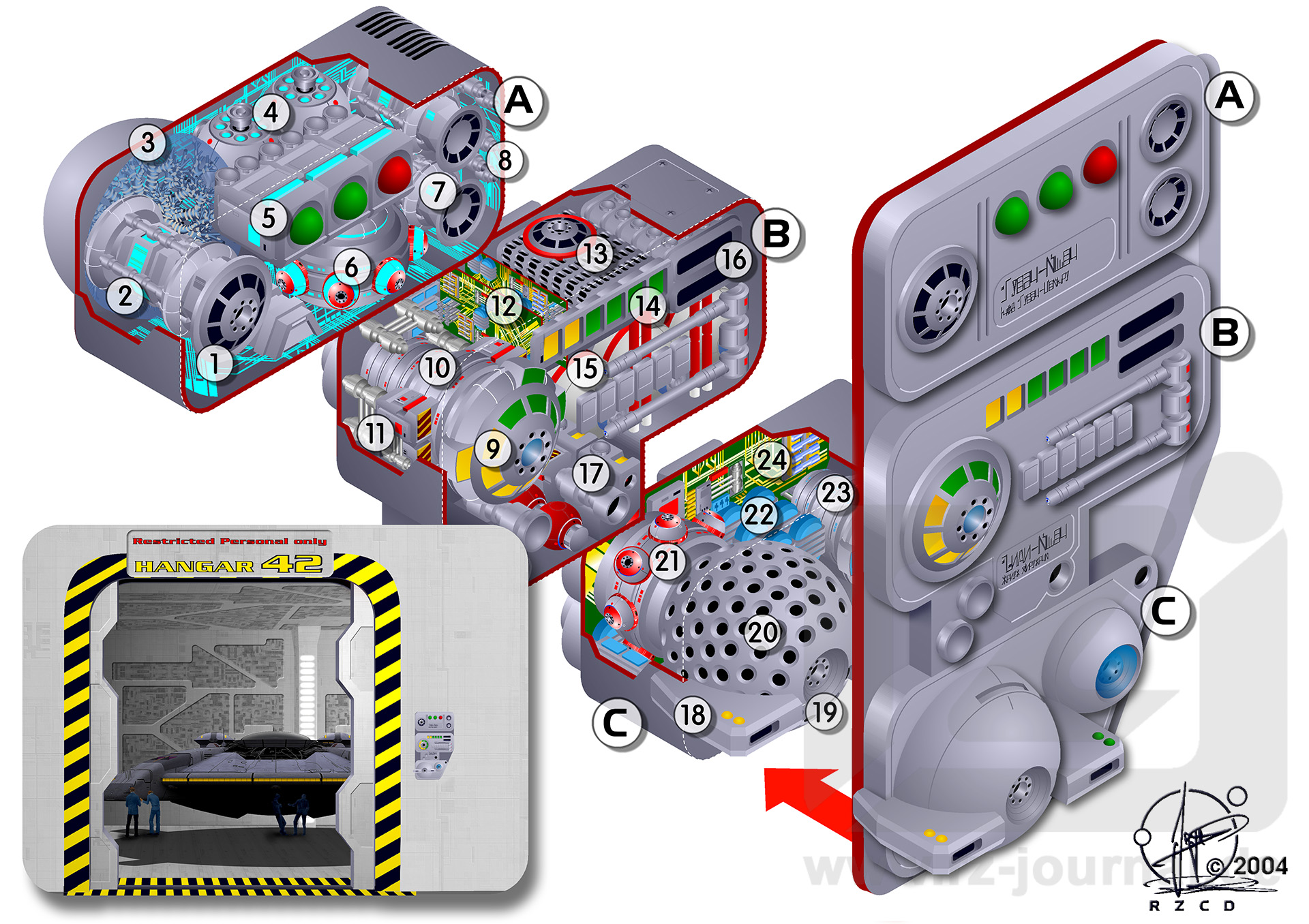 Es gibt Bereiche in einem Raumschiff, die nicht für jeden zugänglich sind. Eine Sicherheitsabstufung in den Zugangsberechtigungen gehört auf militärischen Schiffen ohnehin zum Alltag, aber auch in der zivilen Raumfahrt sind solche Verfahrensweisen in sicherheitsrelevanten Bereichen üblich. Die Kontroll- und Sicherheitssysteme an Bord sind so zahlreich und zugleich so unscheinbar und unauffällig, dass kaum noch jemand Notiz von ihnen nimmt. Die Zeit der umständlichen Zugangsberechtigungen per Kodekarte oder Chip gibt es schon lange nicht mehr. Akustische Systeme werden noch verwendet, sind jedoch zumeist nicht sicher genug. Um den verschiedensten Bedürfnissen gerecht zu werden, sind die Zugangskontrollsysteme auf den heutigen Raumschiffen zumeist modular aufgebaut und bestehen je nach Sicherheitsabstufung aus unterschiedlichen autarken Systemen. Diese sind mit dem Hauptrechner des Schiffs verbunden und haben direkten Zugriff auf alle relevanten Daten der Besatzungsmitglieder und gegebenenfalls auch der Passagiere. |Die üblichsten Systeme, aufsteigend nach Sicherheitsstufen, sind: Akustik-Kontrolle Eine einfache Ansprache des Systems bewirkt den gewünschten Zugang. Das System kontrolliert hierbei die Stimme anhand eines vorliegenden Frequenzspektrums, des Sprachrhythmus sowie der Eigenheiten der Stimme und ist in der Lage, akustische Änderungen wie Heiserkeit oder Ähnliches auszufiltern. Holografischer Handflächen-Scanner (kontaktlos) Das System erkennt im näheren Umkreis mittels eines holografischen Tastfelds bei Annäherung die Handflächen-Struktur, ohne dass das Besatzungsmitglied die Hand in eine bestimmte Position drehen muss. Optional sind die preiswerteren und einfacheren Kontakt-Scanner im Einsatz. Optischer Retina-Scan Ein sehr sicheres Prüfverfahren ist das Scannen der Augen bzw. der Retina. Diese ist bei jedem Lebewesen so einzigartig, dass eine Täuschung sehr aufwändig wäre. Ein hochauflösender Fotosensor erfasst bis auf fünf Meter Entfernung jedes Auge und vergleicht die Daten mit denen aus der medizinischen Datenbank. Gehirnwellen-Detektor Für sehr empfindliche Sicherheitsbereiche wie Munitions- und Waffenlager, Triebwerks- und Energieanlagen sowie bei allen Lebenserhaltungssystemen werden zusätzlich Gehirnwellen-Detektoren eingesetzt. Diese erkennen mittels eines sehr schwachen Diagnosefelds das absolut unverwechselbare Gehirnwellenmuster. Die Grafik zeigt ein Kombinations-Modul der höchsten Sicherheitsstufe, in dem alle vier Systeme kombiniert sind. |
