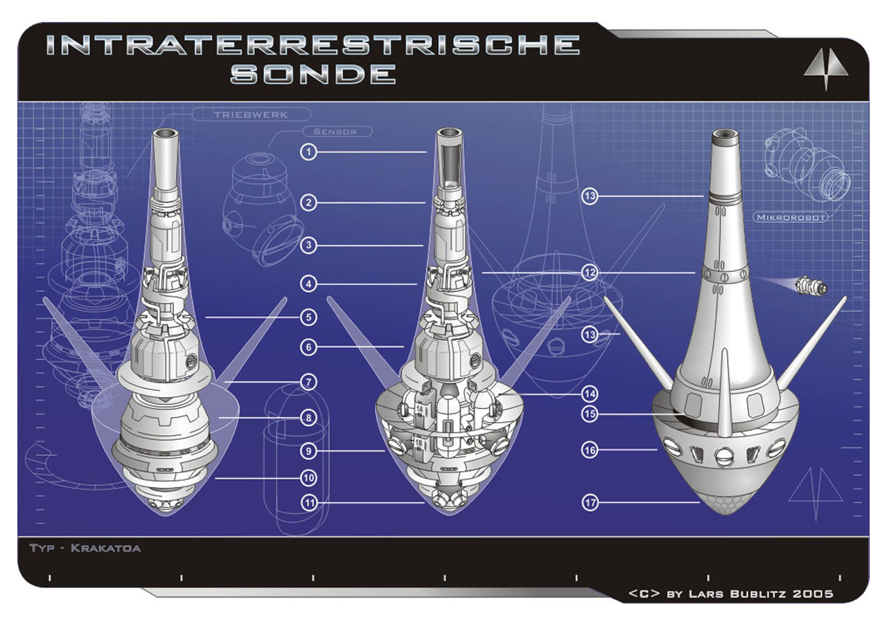 Diese mannshohen Sonden dienen zur Erforschung vulkanischer Aktivitäten und können bis tief ins Erdinnere eingesetzt werden. Je nach Aufgabenbereich variiert die äußere Grundform, die auf eine Entwicklung des Geologischen Instituts von Terrania zurückgeht. Der Hyperimpedanz-Schock hat die staatliche Forschung in diesem Bereich vorerst lahm gelegt, da schlicht wichtigere Dinge der Erledigung harren. Zudem ist es auch bei diesen Sonden erforderlich, ursprünglich verwendete High-Tech-Bauteile zu ersetzen. Terkonithülle und Prallschirm widerstehen Temperaturen von mehreren tausend Grad Celsius, was die Erforschung verflüssigter Tiefengesteine ermöglicht. Schon in der Vergangenheit wurde weitgehend auf den Einsatz hochgezüchteter Schutzschirme verzichtet, da deren Streustrahlung Messergebnisse verfälschen konnte. Desintegrator-Bohrköpfe und der Antrieb auf Gravopuls- oder auch auf Impuls-Basis erlauben eine aufwändige Fortbewegung durch Tiefenmaterie jeder Konsistenz. Die erzielbare Geschwindigkeit ist jedoch in jedem Fall sehr gering. Sensorpacks und Steuerpositronik sind ringförmig im Sondenkopf um den Fusionsreaktor herum angeordnet. Die Systeme sind sehr kompakt und modular aufgebaut. Dies erleichtert den Austausch der Komponenten und eine individuelle Konfiguration jeder Sonde. Eine generelle Aussage über Reichweite und Einsatzdauer ist nur sehr bedingt möglich, da dafür in erster Linie die jeweiligen Umgebungsparameter ausschlaggebend sind. Grundsätzlich sind diese Sonden jedoch für die Aufnahme von Materieproben ausgestattet; Mikroroboter (siehe Bild) übernehmen diese Tätigkeit. |