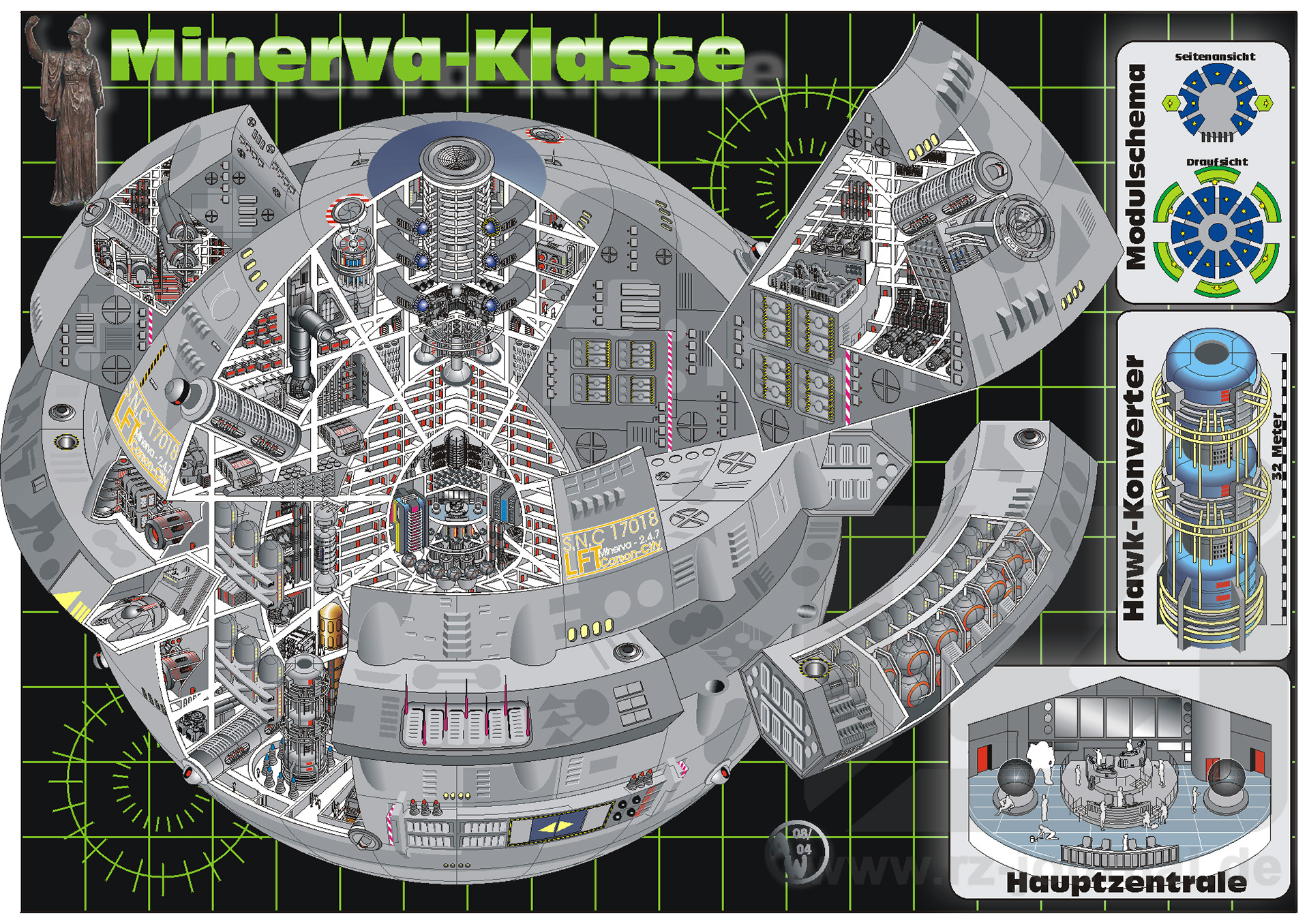 Erläuterungen: Das Prinzip der Modulbauweise, das sich schon bei den Entdecker- Raumschiffen bewährt hat, wurde bei den Schwerer Kreuzern der Minerva-Klasse konsequent fortgesetzt. Die Segmente in der Kugelzelle können beliebig ausgetauscht werden. Liegezeiten auf Grund umfangreicher Re-paraturarbeiten werden damit minimiert; die beschädigten Aggregate eines Moduls können zu jedem späteren Zeitpunkt in Stand gesetzt werden. |