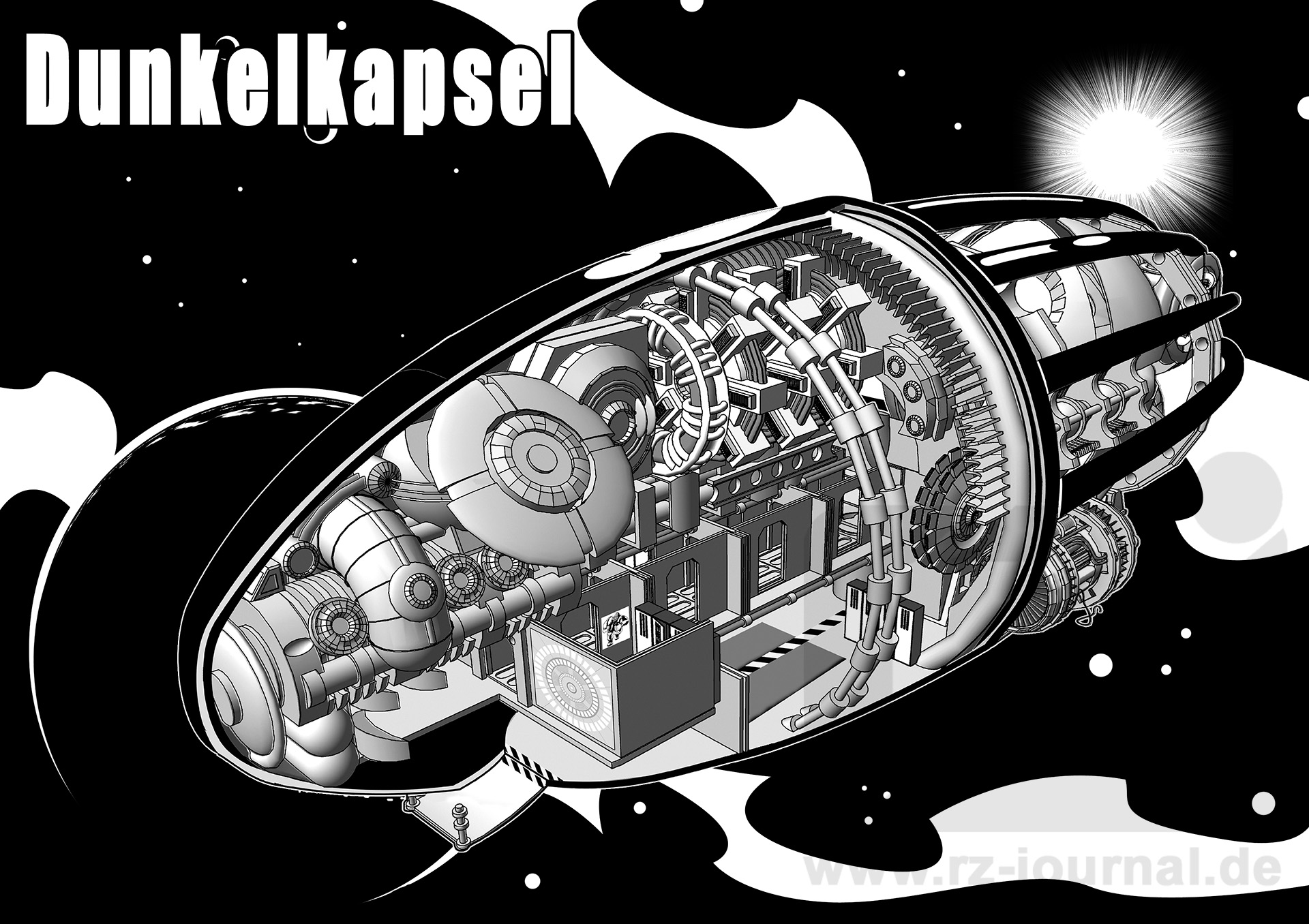 Die Dunkelkapseln sind die derzeit kleinsten bekannten Schiffe der Terminalen Kolonne TRAITOR. Bekannt sind hierbei zwei unterschiedliche Ausführungen: die Dunkelkapseln der Mikro-Bestien und das diskusförmige Objekt, das vom Dualen Kapitän Zerberoff bei seiner Flucht von dem Kolonnen-Fort TRAICOON 0098 verwendet wurde. Die dargestellte Grafik bezieht sich auf die Dunkelkapseln der Mikro-Bestien und gründet auf den Untersuchungen der Terraner, den Berichten der Siganesen Demetrius Luke und Dani Queenz und den Informationen der Mikro-Bestie Zon Facter. Das Hologramm, das Perry Rhodan sorgenvoll betrachtet, wurde aufgrund dieser Mutmaßungen erstellt. Eine Dunkelkapsel ist von annähernd ovaler Grundform und zirka sieben Meter lang bei einem Durchmesser von zweieinhalb Metern. Laut Zon Facter ist die Dunkelkapsel überlichttauglich und hat im Regelfall eine Besatzung von neun Mikro-Bestien. Die Hülle besteht aus Ricodin-Verbundstoff. Das Feldtriebwerk für Unterlichtgeschwindigkeit arbeitet mit einer Beschleunigung bis maximal 200 km/s2, bei dem Überlichttriebwerk handelt es sich um einen sogenannten Supratron-Generator. Der maximale Überlichtfaktor beträgt zwei Millionen. Erstaunlicherweise ist die Dunkelkapsel unbewaffnet und dient lediglich als Transportfahrzeug. Sie verfügt über einen Dunkelschirm, eine Kombination aus Deflektor, Ortungsdämpfer und Schutzschirm, der in seiner Abwehrkapazität dem Paratronschirm entspricht. Die Ortungssysteme ermöglichen es, andere Dunkelschirme zu lokalisieren. Es sei angemerkt, dass die hier dargestellte Grafik des Innern einer Dunkelkapsel auf Mutmaßungen basiert. Selbst die Mikro-Bestien haben ausschließlich Zugang zu den unteren beiden Decks. Die Technik wurde von Zon Facter als »verkapselt« bezeichnet. Würde jemand gewaltsam Zutritt zu der Kolonnen-Technik suchen, würde das Raumschiff explodieren. |