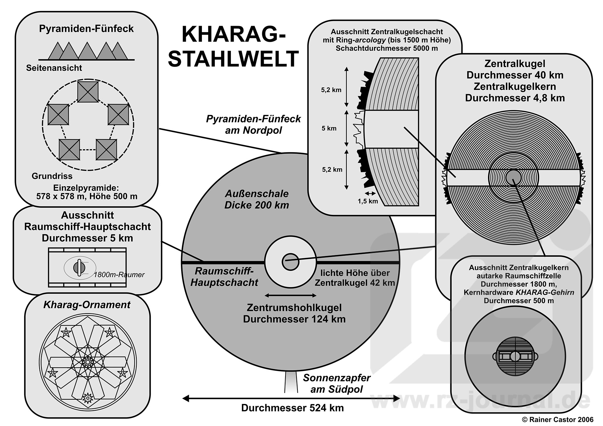 Kharag-Stahlwelt Basisdaten: 524 Kilometer Durchmesser, Äquatorumfang 1646 Kilometer, Ursprünglich ein Eisen- Nickel-Planetoid, der ausgehöhlt und komplett in eine technisierte »Stahlwelt« verwandelt wurde. Die Kharag-Stahlwelt ist eine Psi-Bastion; Insgesamt sind 29,7 Milligramm Psi-Materie vorhanden, aufgeteilt in fünf Margen von je 5,94 Milligramm und eingebettet-in Kugelbehälter aus Drokarnam/PEW- Metall von je 48,21 Zentimetern Durchmesser. Äquatorbereich Oberfläche: Fünf je 100 Kilometer große Landefelder, im Mittelpunkt der Hauptschacht von fünf Kilometern Durchmesser, umgeben von einem Aggregatwulst. Der innere Landefeldring ist als normaler Raumhafen, die Peripherie in Form halbkugeliger Dockbuchten einschließlich Werftanlagen gestaltet und für Raumer bis 1800 Meter Durchmesser ausgelegt.