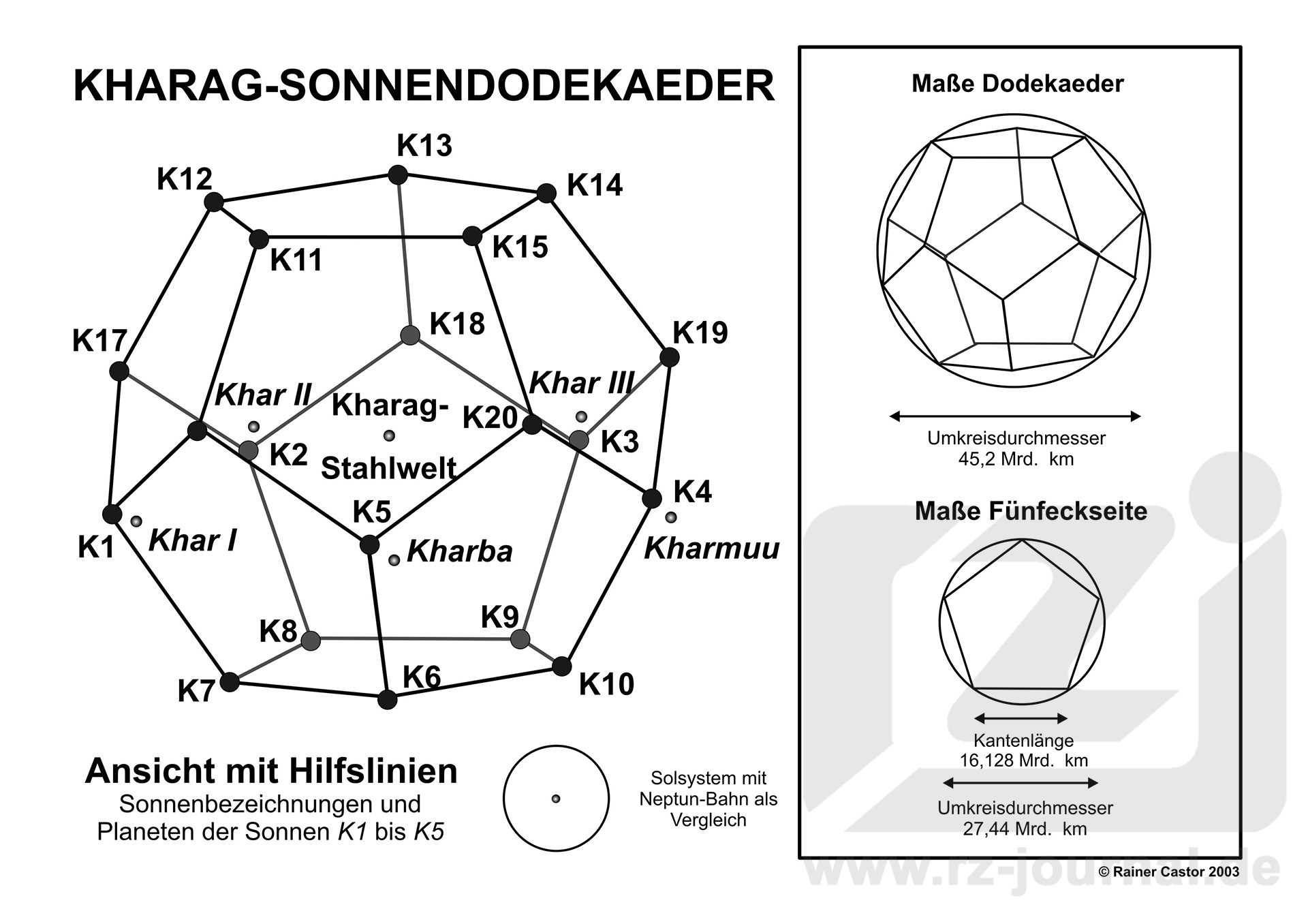 Kharag-Ornament: Überall auf den fünf Planeten und in der Kharag-Stahlwelt findet sich dieses Emblem/Logo: Werden die Seitenflächen eines Dodekaeders aufgeklappt, erhält man sechs Fünfecke für die obere und ebenfalls sechs Fünfecke für die untere Hälfte. Die Form ist bei flächiger Ausbreitung abermals ein Fünfeck, bei dem fünf Fünfecke das zentrale sechste umgeben. Legt man nun die obere und die untere Hälfte aufeinander und fügt bei den zentralen Fünfecken die Diagonalen hinzu und zeichnet in das entstehende Pentagramm weitere ein, entspricht das Gesamtergebnis dem Kharag-Ornament. Werden die im Ornament eingezeichneten Sterne - vier fünfzackige und ein zehnzackiger, jeweils mit zentralen Punkten - den jeweiligen Sonnen des Dodekaeders zugeordnet, sind damit die zu der Konstellation gehörenden Planeten eindeutig gekennzeichnet. Beim Sonnendodekaeder kommt es im Zentrum der Wirkungslinien und fächerartigen Einflusszonen zur hypertechnisch gesteuerten Bündelung der Sonnenemissionen, die den Transmittereffekt entstehen lässt. Jedes der Sonnenfünfecke kann als einzelner Sonnentransmitter geschaltet werden, hinzu kommt das Zusammenwirken von allen zwanzig Sonnen - hierbei entsteht dann die (dreizehnte) -Transmitterzone (TZ) im Zentrum des Dodekaeders. Im Normalbetrieb wurden von den Lemurern jedoch bevorzugt die Sonnenfünfecke von »Boden-« und »Deckfläche« als Transmitter verwendet, bezeichnet als Tronsmitterzone Kharag I (»unten«) und Kharag II (»oben«). Die Transmitterzone ist eine flammende Energieballung, die sich nach der Aktivierung zu einem turbulenten, violett und orangerot leuchtenden Konzentrationsgebiet von mehreren Millionen Kilometern Durchmesser aufbläht. Nähert sich ein Transportobjekt, zuckt aus ihr ein orangeroter Strahl hervor; eine ungeheure Kugelblitz-Entladung blendet auf, erfasst das Objekt und hyperenergetische Stoßfronten breiten sich aus - dann wird das Objekt mit ungeheurer Fahrtbeschleunigung angezogen, in die Transmitterzone gerissen und augenblicklich entmaterialisiert.