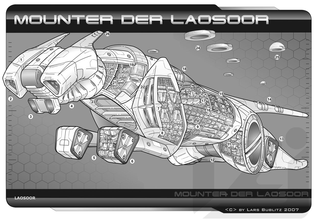 Perry Rhodan begegnet den Laosoor, nachdem er mit der JULES VERNE über zwanzig Millionen Jahre weit in die Vergangenheit unserer Galaxis gereist ist. Dies ist die Zeit der Superintelligenz ARCHETIM. Die Laosoor erinnern an terranische schwarze Panther; ihre Bevölkerung zählt noch 305 Millionen Individuen. Sie leben in ihrer Mond-Sphäre LAOMARK als die Letzten eines einst stolzen Volkes. Die Hauptflotte der Laosoor verfügt über achtzig Mounter; hinzu kommen mehrere Tender und natürlich Beiboote. |