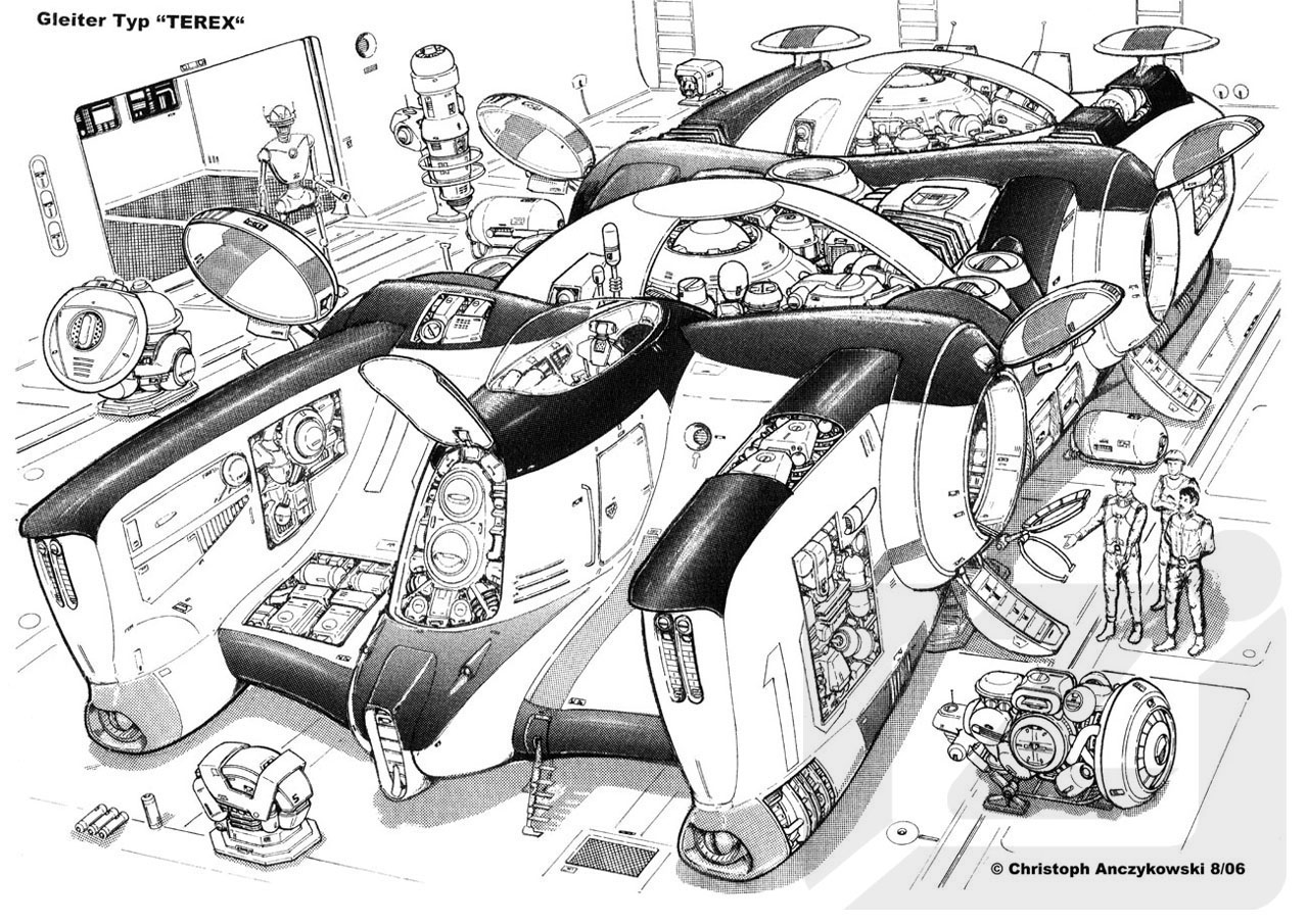 Dieser Gleiter ist ein Beispiel für das Retro-Design, das durch die technologischen Folgen der erhöhten Hyperimpedanz notwendig wurde. Da Energie nicht mehr ubiquitär und fast uneingeschränkt zur Verfügung stand, wurde teils auf alte Konzepte wie das des »fliegenden Kraftwerks« zurückgegriffen, das bereits in der Frühphase der Dritten Macht bei der Kolonisierung des Mars zum Einsatz kam. Kernstück des Gleiters bilden zwei Standard-Kernfusionsreaktoren mit einem kompletten Satz Normal- und Hy-perenergie-Wandler. Der TEREX ist in seiner Grundausstattung mit starken Prallfeldgeneratoren ausgestattet, die sich in speziellen Projektionsschürzen an Bug und Heck befinden. Diese ermöglichen ohne aufwendige Umrüstung eine Verwendung in der Zivilschutz-Rolle (Erzeugung von Schutzschirmen bei Naturkatastrophen, Vakuumfeldern bei Bränden etc.]. Zusätzlich verfügt er über zwei Aggregate-Tunnel zum Einbau von Extra-Deuterium-Tanks, Traktorstrahl- und HÜ-Schirmfeldgeneratoren. So können die Einsatzmöglichkeiten auf den Schwerlasttransport und den militärischen Bereich ausgedehnt werden. Als fliegendes Kraftwerk ist der Gleiter in der Lage, die erzeugte Energie über Energiekupplungen an externe Verbraucher abzugeben, wobei mehrere TEREX-Einheiten zu einem Verbund zusammengeschaltet werden können. Auf diese Weise ist es ihm auch möglich, die Sphärotraf-Speicher von Raumschiffen bis zur Größe eines 100-Meter-Kreuzers aufzutanken. Der Gleiter ist tiefsee- und orbitaltauglich.