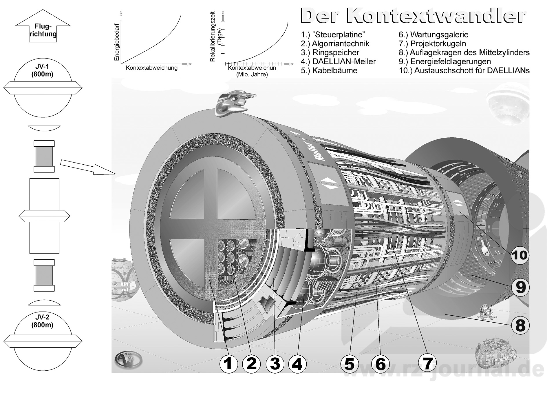Der Kontextwandler basiert auf algorrianischer Technik, gebaut mit terranischen Mitteln. Die gesamte zentrale Technik musste quasi neu erstellt werden. Alle periphere Technik stammt aus Zeitgründen von den Terranern. Er besteht aus insgesamt drei Komponenten: dem Leitstand sowie Meiler-1 und Meiler-2. Die gesamte Technik ist in den Augen der Algorrian »improvisiert«, der Raumbedarf enorm. Erschwerend kommt hinzu, dass die fertige Maschinerie maximal 200 Millionen Tonnen Masse »bewegen« kann. So ergab sich fast zwangsläufig die äußere Form der JULES VERNE im Design einer verkleinerten SOL aus zwei APDLLO-Einheiten und einem zylindrischen Mittelteil. Die Energieausbeute der insgesamt 24 Daellian-Kraftwerke (je sechs in der Deckel- und Boden»platte« von Meiler-1 und -2) erreicht den exorbitanten Wert von zusammen 8,112 x 1D hoch 16 Watt. Dennoch werden 84 Stunden benötigt, um die insgesamt 32 Zyklotraf-Ringspeicher (je acht oben und unten pro Meiler) einmal komplett zu laden - ausreichend Energie für nur einen Kontextsprung. Die von 35 Quintadim-Umformern je Meiler umgewandelte und bereitgestellte Hyperenergie wird per Paraverbundleitungen die insgesamt 168D Nullfeldprojektoren weitergeleitet (Kugelaggregate von 2,5 Metern Durchmesser, gegliedert auf zwölf umlaufenden Ringen je Meiler), die ihrerseits über Eingangswandler und Temporal-Phasenrichter verfügen und mit Temporalstabilisatoren zur Feldstabilisation verbunden sind. Von den Nullfeldprojektoren wird das absolute Nullfeld erstellt, das einen maximalen Einflussbereich mit einem Durchmesser von 2500 bis 2700 Metern hat und ein »temporal-neutrales Nullzeit-Miniaturkontinuum« entstehen lässt. Sobald das Nullfeld durch nachgeschaltete Zeitmodulatoren stabilisiert ist, werden die je 25 Quintadim-Umformer pro Meiler der Kontextsprungstufe mit dem Speicherinhalt der Zyklotrafs beschickt, der nach der Umwandlung in Hyperenergie schlagartig an die beiden Ultra-Injektoren sowie die insgesamt 48 Hypersexta-Halbspur-Beschleuniger abgegeben wird. Die »Kontextwandlung« der Zeitreise beginnt durch den spezifischen hyperenergetischen Anregungsimpuls der Ultra-Injektoren an das absolute Nullfeld, während die Hypersexta-Halbspur-Beschleuniger für den eigentlichen »temporalen Schub« sorgen. Bei der Zeitreise mit dem algorrianischen Kontextwandler vergeht subjektiv keine Zeit, vergleich bar einer Transition; Entzerrungsschmerzen treten nicht auf. Funktionsbedingt dient der K-Wandler (ähnlich wie seinerzeit der Nullzeitdeformator) als Nullfelderzeuger und Gegenpol des angepeilten Vergangenheitspunkts auf der »Zeitstromlinie« - der räumliche Bezugspunkt wird hierbei normalerweise scheinbar beibehalten, weil ersieh am nächsten größeren Hyperbarie-/Gravi-tationsbereich orientiert (z. B. einem Planeten, einer Sonne etc.) - ein Start beispielsweise im Solsystem hätte normalerweise auch wieder hier enden sollen, selbst wenn die Zeitreise Jahrmillionen überwindet (und dabei von der Sonne infolge ihrer Eigenbewegung viele Lichtjahre überbrückt werden)... Aufgrund seines »Prototypen-Status« ist der Kontextwandler in seinem Einsatz limitiert. Niemand weiß, wie oft er Sprünge erlaubt und wann er ausgebrannt ist. Deshalb konnte es sich die Besatzung der JULES VERNE nicht leisten, zunächst einen kurzen Sprung auszuführen, um die Technik der Vor-Hyperimpedanz-Zeit auf Herz und Nieren zu testen und das Schiff »einzufahren«. |