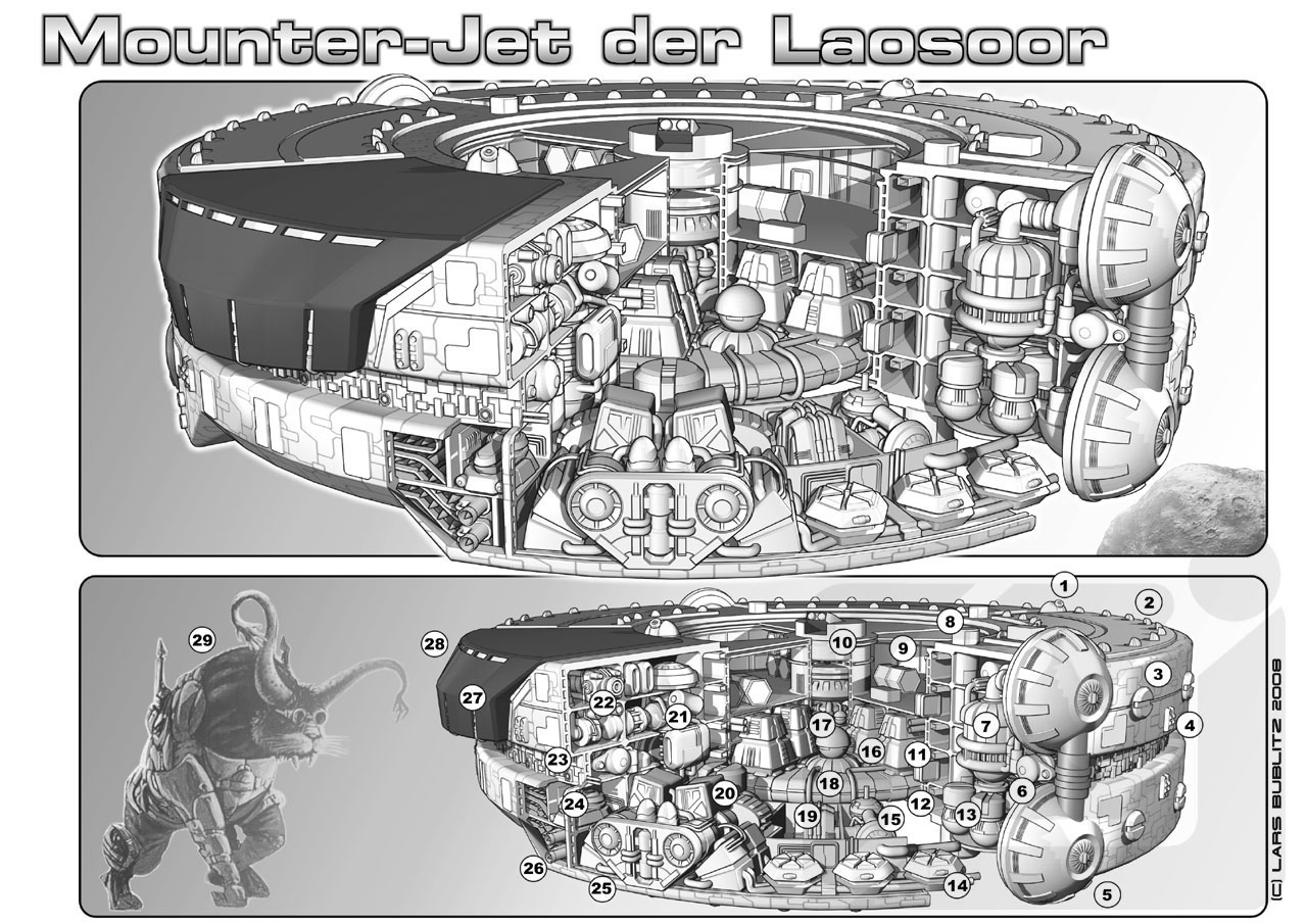 Die Mounter-Jets als Beiboote der großen, den Laosoor stilisiert nachgebildeten Mounter werden sowohl für Undercover-Einsätze als auch als Verbindungsfähren innerhalb der Mond-Sphäre LAOMARK benutzt. Ober- und Unterseite der Mounter-Jets sind für den Transport größerer Lasten ausgelegt, dafür können die magnetischen Klammern individuell zu größeren Einheiten zusammengeschaltet werden. Der Block der Hauptzentrale lässt sich im Notfall absprengen und ist eingeschränkt flugfähig.