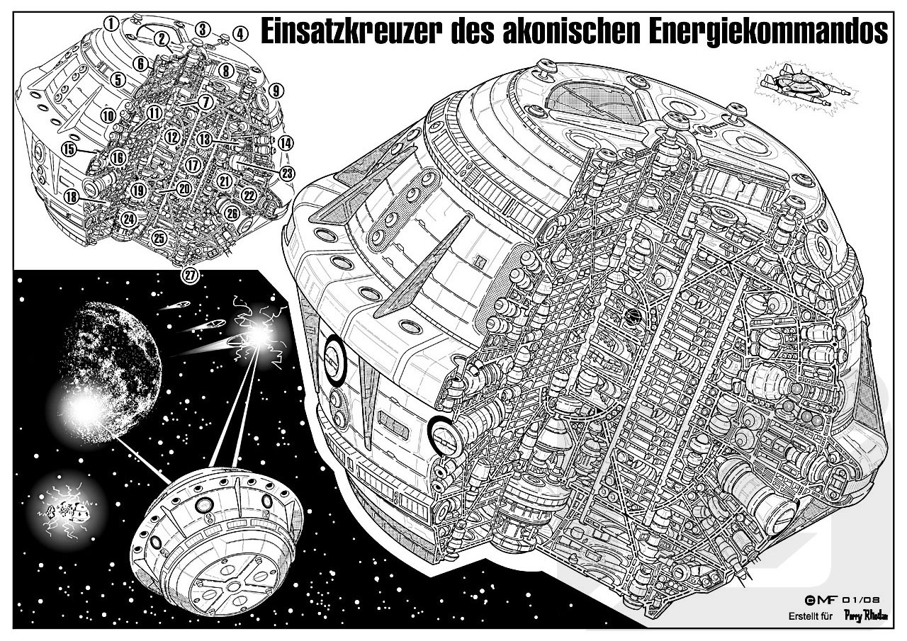Der abgebildete akonische Einsatzkreuzer hat das Erscheinungsbild eines Prä-Hyperimpedanz-Kreuzers. Das wurde seitens des akonischen Energiekommandos aus psychologischem Grund gewünscht. Andere Völker sollen glauben, dass die Erhöhung der Hyperimpedanz der akonischen Technik nicht schaden konnte. Unbekannt ist zwar, wie viele akonische Raumschiffe der TRAITOR-Direktive »entkommen« sind, andererseits wurde eine größere Anzahl dieser Kreuzer auf Geheimbasen versteckt oder befindet sich auf Beobachtungsmissionen im Einsatz. |