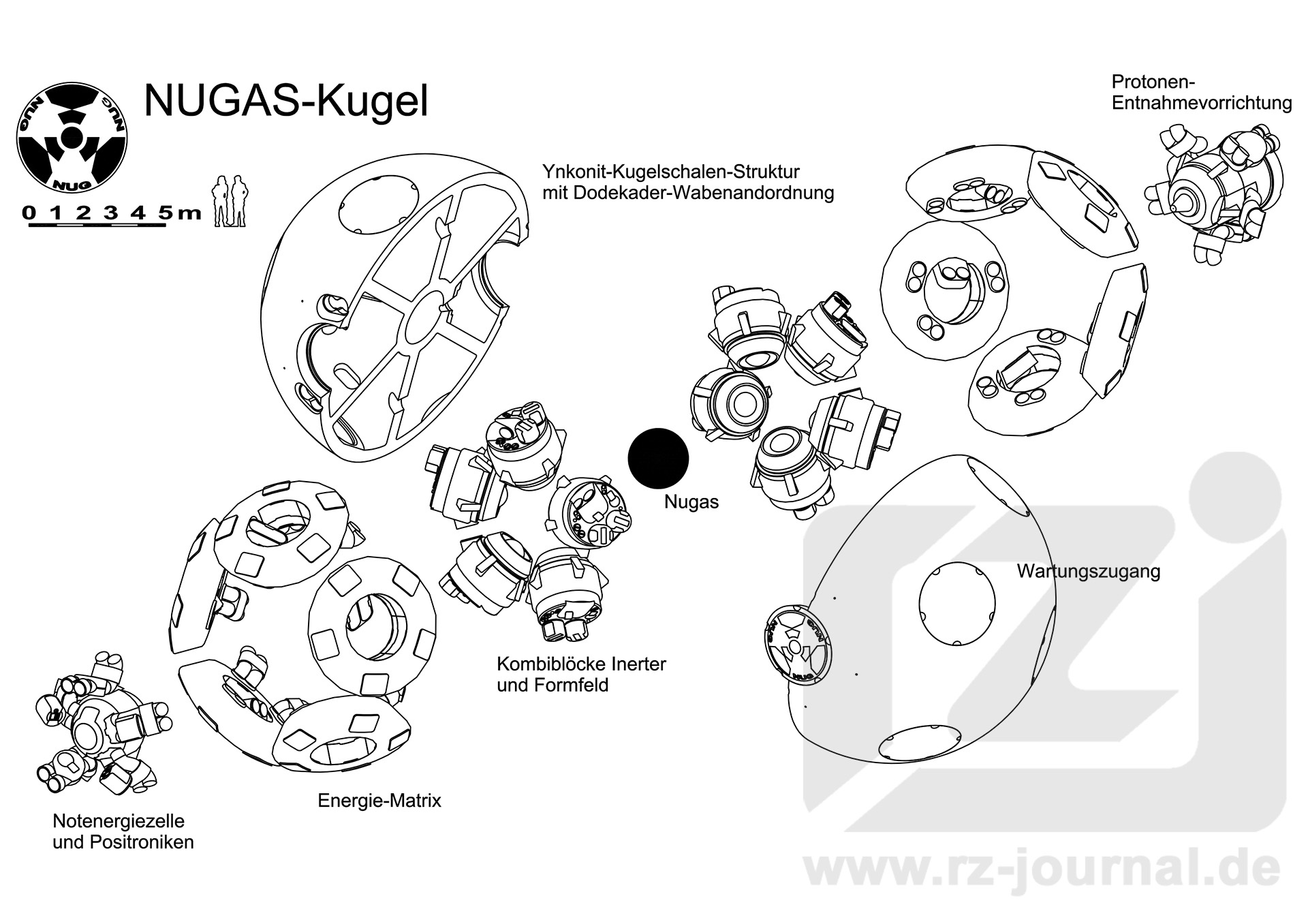 Der im Projekt ANTINUG entwickelte neue Typ eines Schwarzschildreaktors benötigt mit dem Nugas einen nur schwer zu beherrschenden »Brennstoff«. Entsprechend aufwendig in der Konstruktion ist die Eindämmungs-vorrichtung. Die Basiskonstruktion besteht aus zwei konzentrisch angeordneten Ynkonit-Kugelschalen mit den Innen/Au-ßendurchmessern von 12,00/11,00 bzw. 3,20/2,20 Meter. Der Zwischenraum zwischen beiden Schalen wird durch eine Wabenkonstruktion in Dodekaeder-Anordnung statisch stabilisiert.