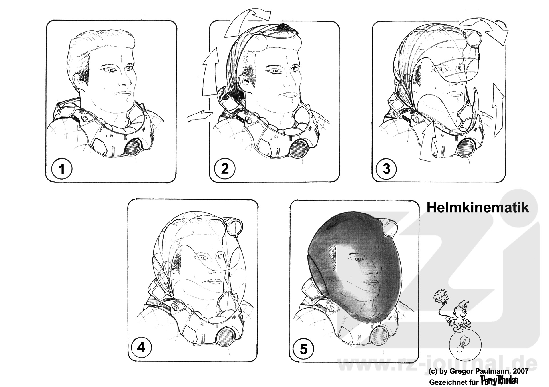 Helmkinematik Bestandteil des Außenanzugs ist weiterhin der segmentierte Falthelm mit umlaufendem Kragen (Abb.2). Im Kragen ist neben dem Staufach des Helms ein Multifunktions-Kommunikator (MultiKom) eingebaut, der Verbindungen per Hyper- und Normalfunk mit planetarischer Reichweite ebenso wie permanente Dateninterlink-Verbindungen erlaubt. Sofern entsprechende Satelliten vorhanden sind, ist der MultiKom auch zur GPS-Positionsbestimmung einsetzbar. Hinzu kommen diverse Sensoren, Mehrspektralscheinwerfer, Außenmikrofone und -lautsprecher und dergleichen mehr. Die einzelnen Helmsegmente bestehen aus synthetisch erzeugtem Metamaterial mit Memory- und Morphing-Eigenschaften, sodass sich alle Teile beim Übergang mit Zwischenschritten vom Ausgangs- zum Endzustand zu einem (scheinbaren) Einzelstück zusammenfügen. Die Volltransparenz des Helms beinhaltet einen automatischen fotosensitiven Blendschutz und interne Display-Projektoren im Blickfeld des Trägers. Bei vollständig abgeblendetem Helm wird eine komplett synthetisch generierte Außensicht aus kombinierten Sensordaten erzeugt. Rechnersimulationen können ebenso abgebildet werden wie Einzelparameter der Außenanalyse oder Funktionsparameter und Statusanzeigen des Anzugs und seiner Geräte selbst. Je nach Ausstattung variiert die multimediale Nutzung für Ortungsdarstellungen, Datenübertragungen oder Bildfunkgespräche und beinhaltet die Nutzung der im Helminnern wie auch außen angebrachten Kameras, Sensoren, Mikrofone etc. Hinzu kommt die Darstellung rechnerisch aufbereiteter Ergebnisse einschließlich Rasterprojektionen als Hilfe bei Entfernungs- und Größenbestimmungen, für die Darstellungen von Messwerten, Analyseergebnissen, »Zielkreuz« der Handwaffen oder den Systemen eines Gefechtsmoduls (s. Abb. 2) und dergleichen mehr. Abhängig von der Ausstattung der Sensoren ist die Ausweitung des optisch sichtbaren Spektrums auf angrenzende Bereiche wie Infrarot und Ultraviolett sowie eine Antiflex-Funktion zur Deflektor-Kompensierung möglich, weiterhin stehen Restlichtaufhellung und Vergrößerungsschaltung zur Verfügung. Erfahrungsgemäß kommt in der Praxis die computerisierte Darstellung weitaus häufiger zum Einsatz als die Transparenzwirkung. |