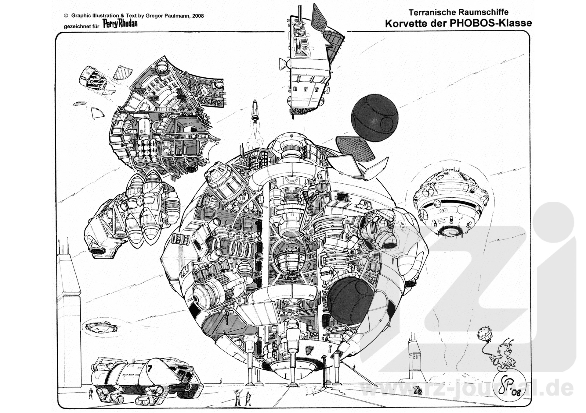Struktur & Peripherie S 1 Ringwulstsegment mit Triebwerken S 2 Positionsleuchten S 3 Ynkonithülle als selbsttragende Zelle, Sandwichstruktur S 4 Lokaler Feldgen.erator des adaptiven Festigkeits- und Statiksystems (»Spittock«) S 5 Austauschschacht für Linearkonverter S 6 Mannschleuse mit Prallfeld-Andocktunnel und Traktorstrahler S 7 Verriegelungssysteme für Wulstsegment (gravomechanisch und normalmechanisch) S 8 Hangar mit Gravotrak-Projektor zur Bewegung schwerer Lasten S 9 Bodenschleuse, Rampe aus memorisiertem Ynkonit-Fluidblech S 10 Teleskop-Landestützen (sechs) mit hydraulischer Niveauregulierung, Landeteller mit Gravotrak-Verankerungssystem S 11 Kleinst-Space-Jet S 12 Stealth-Shift als Beiboot S 13 Startende PHOBOS-Korvette S 14 Lastenheberrobot