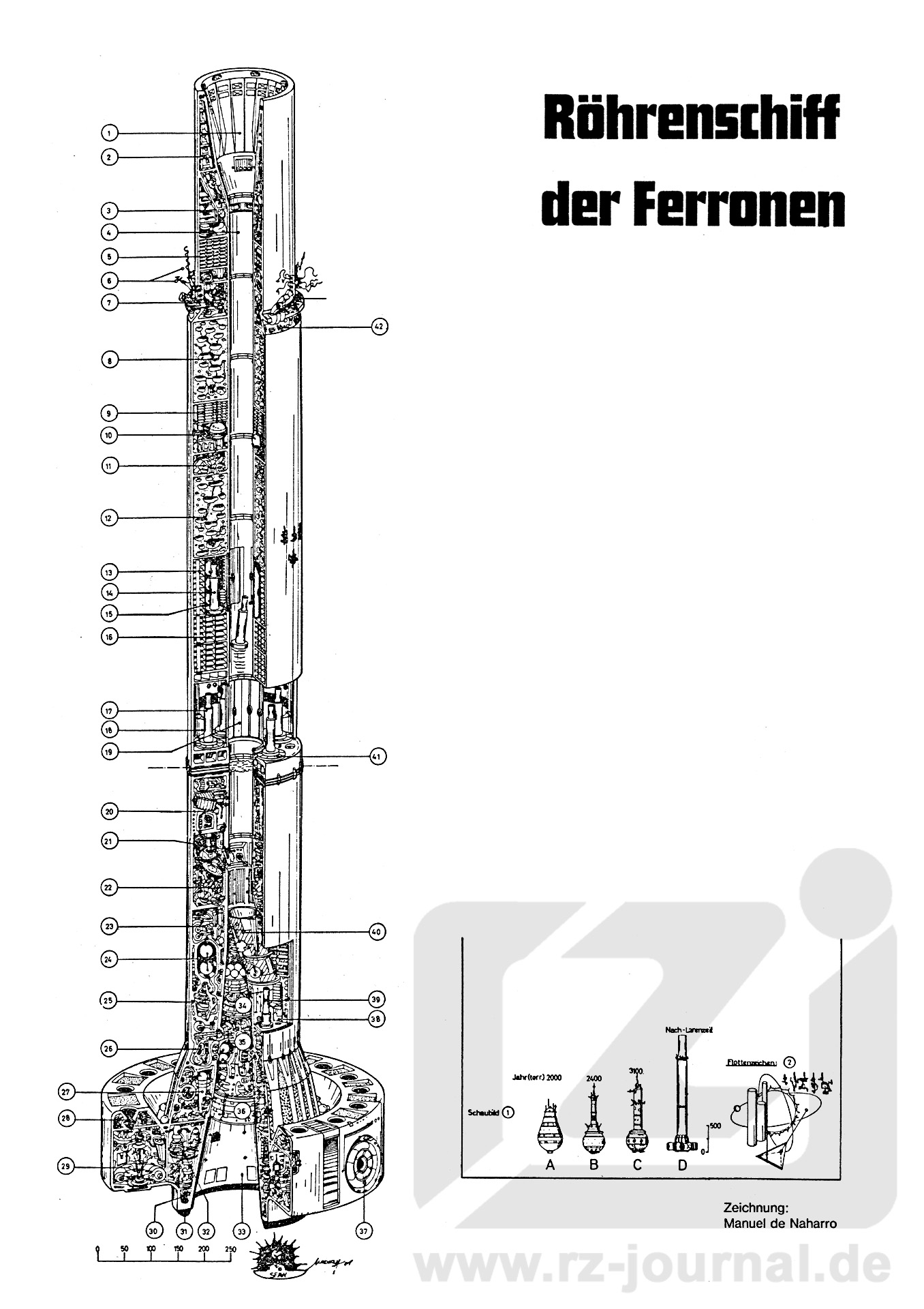 23. Wasser-Luft-Regenerationsanlagen 24. kugelförmige Reservetanks 25. Schwerkraftneutralisator 26. Energiemodulator 27. Energiespeicher und Nebenaggregate 28. Bremstriebwerke 29. Antigravtriebwerk 30. Ringgravitron 31. Gummiauflagerung 32. Kernfusionsreaktoren 33. hitzebeständige Wand 34. Verstärker (vorgeschaltet) 35. Energiewandler 36. Impulstriebwerk 37. Elektronenteleskop 38. Hangar 39. Fluchtschiff 40. Startröhre 41. Magnethalterplatten 42. Sensorleiste |